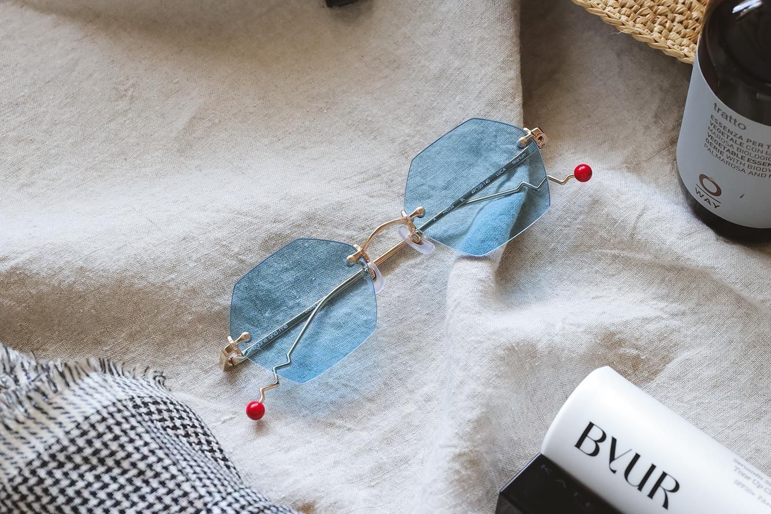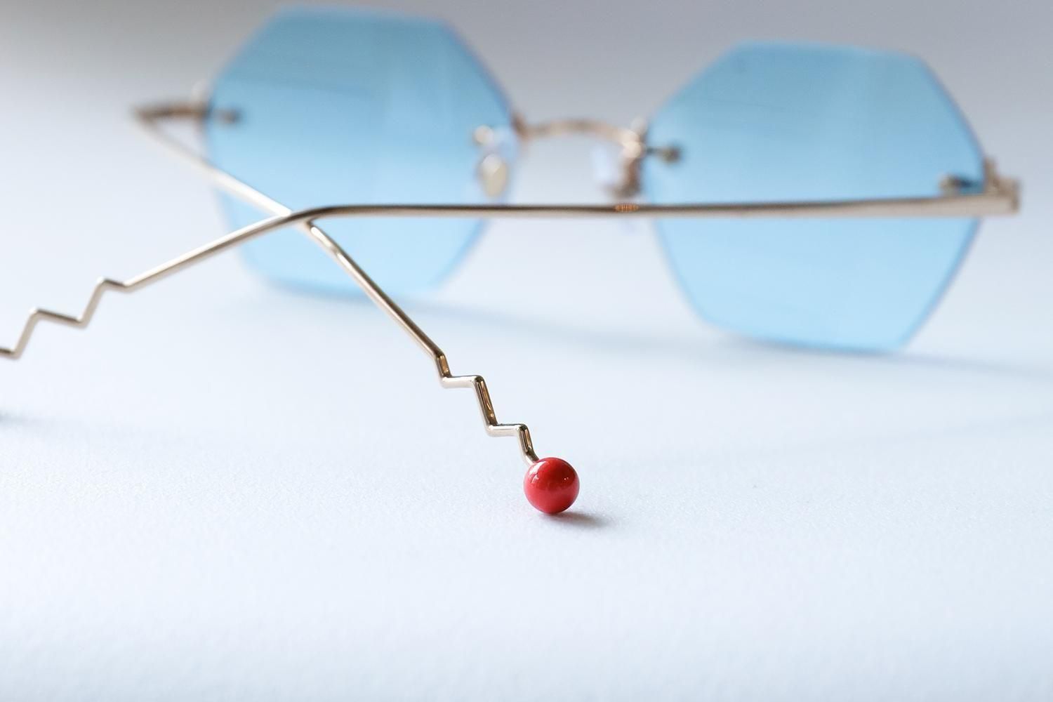 ブルーのレンズとテンプルエンドの鮮やかなレッドカラーのコントラストが印象的な、夏にもってこいのサングラス。