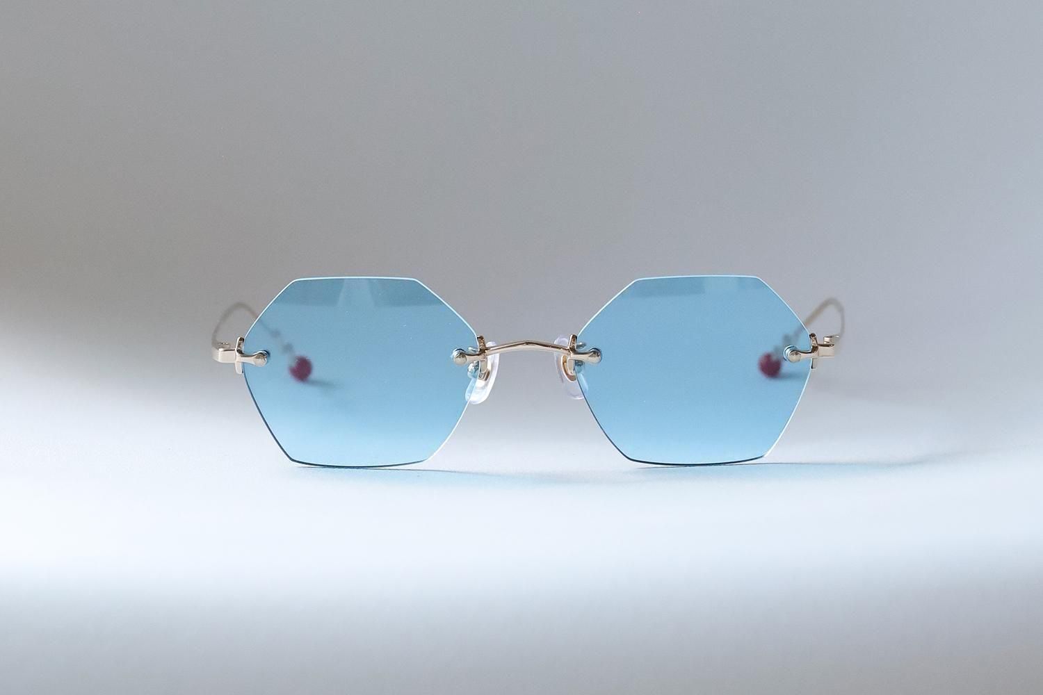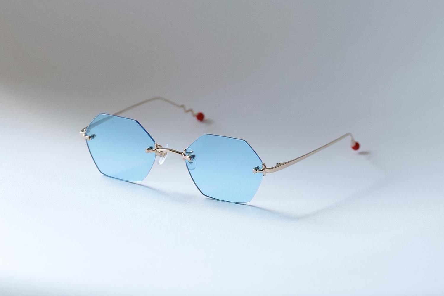すっきりとしたツーポイント型のデザインに色鮮やかなブルーのレンズがよく映えます。