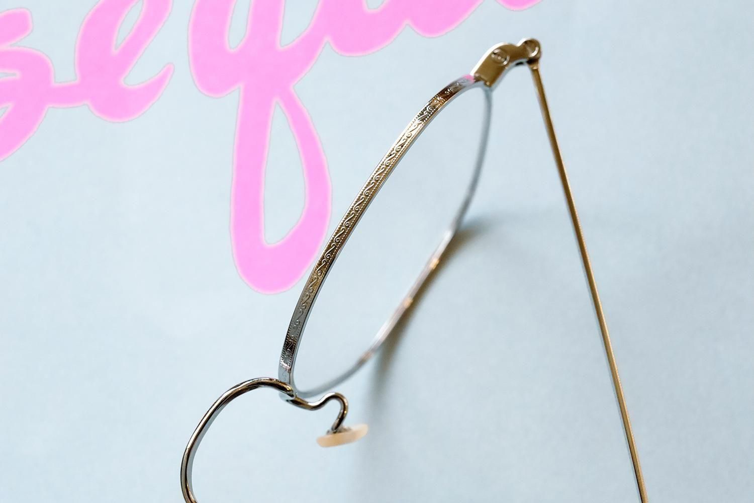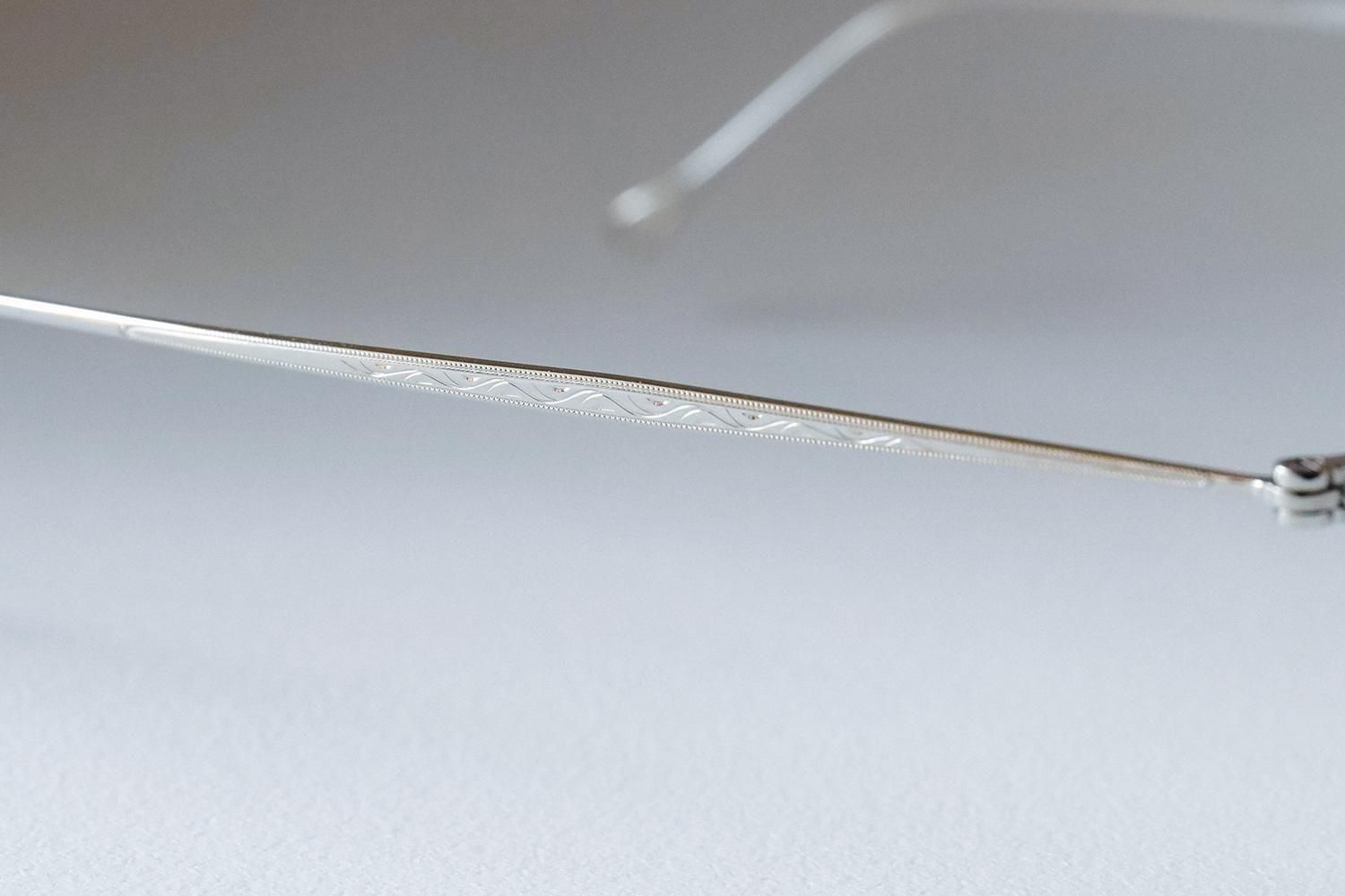キラリと光る白銀色が特徴で、ブリッジやテンプルには美しい彫金が施されている。