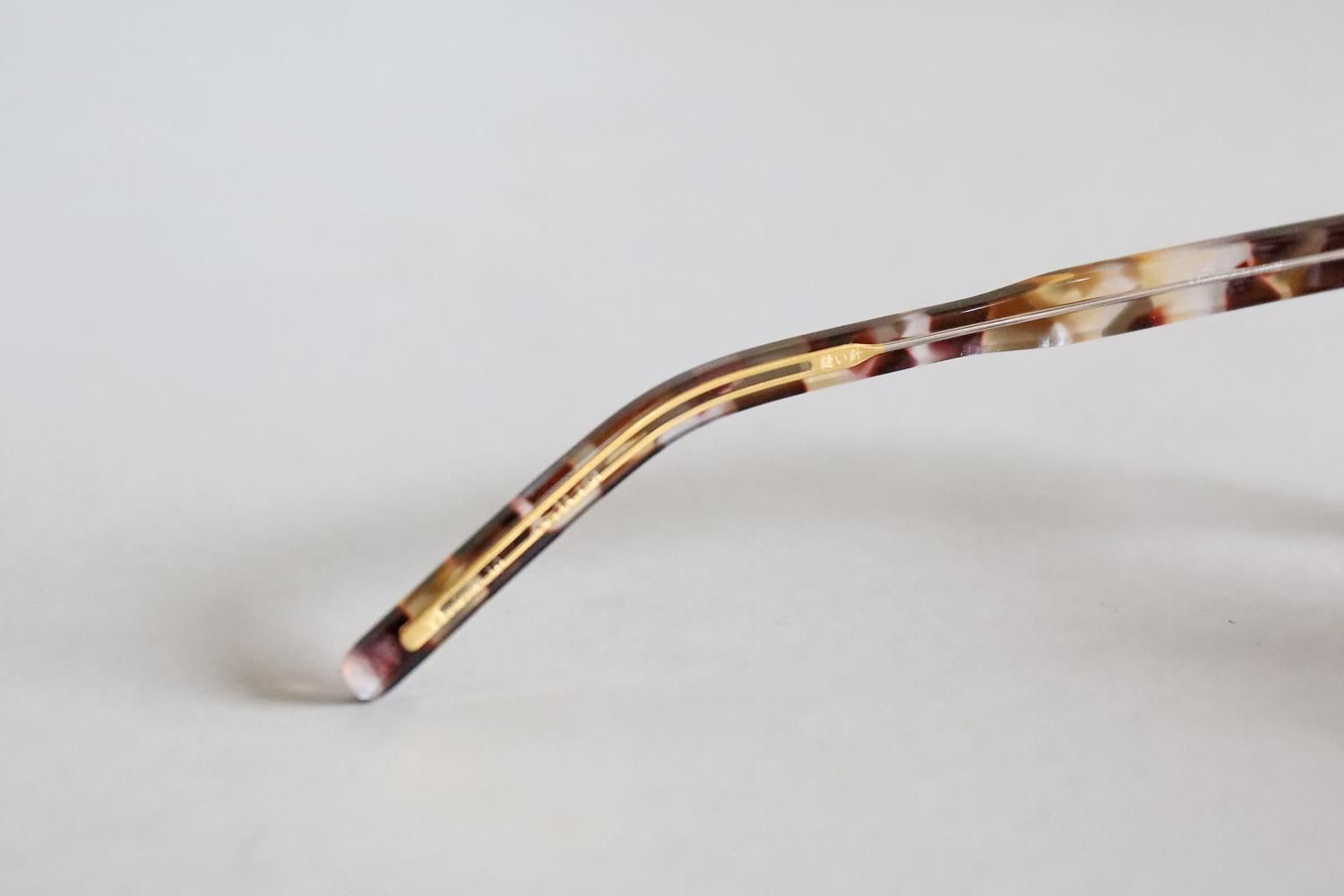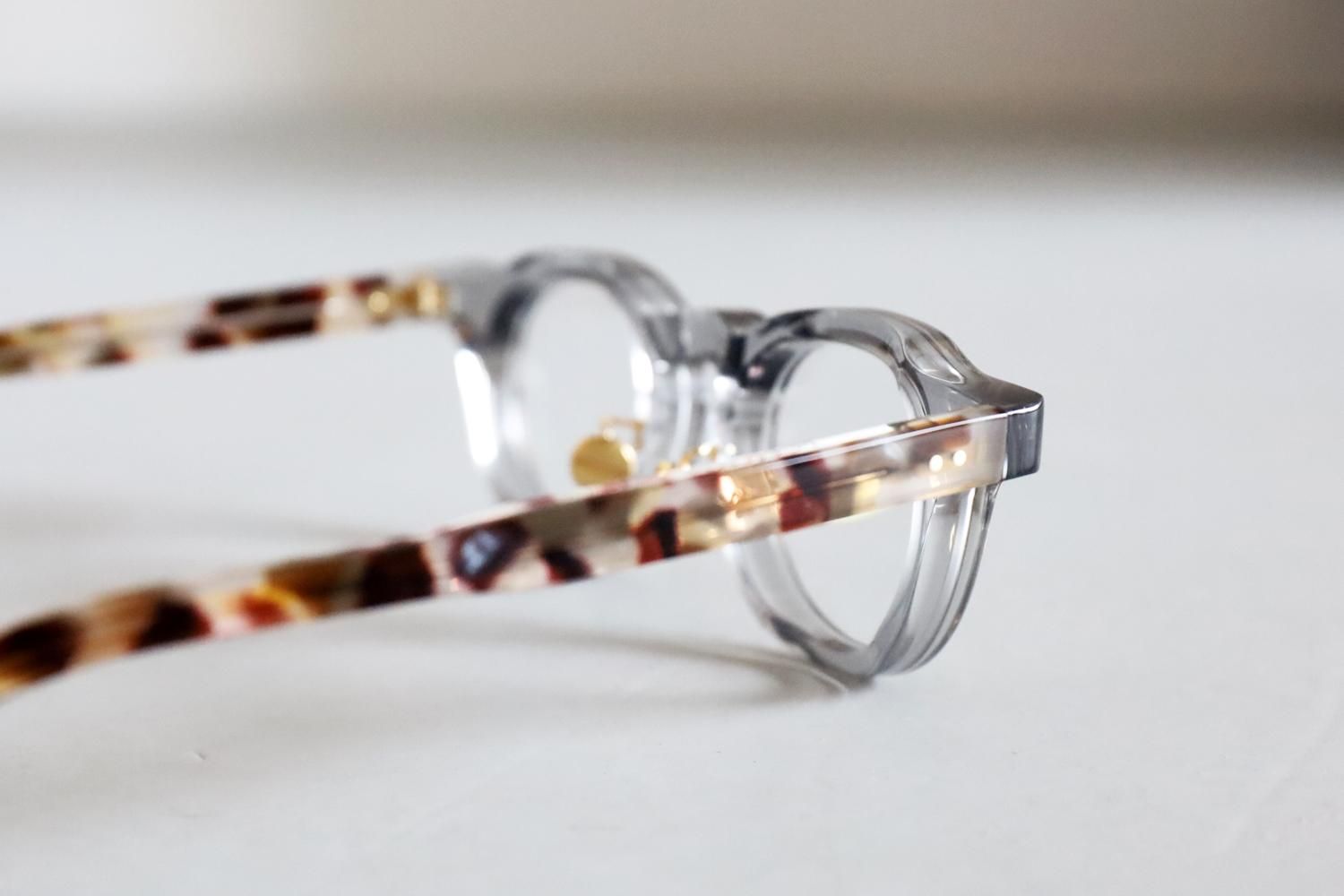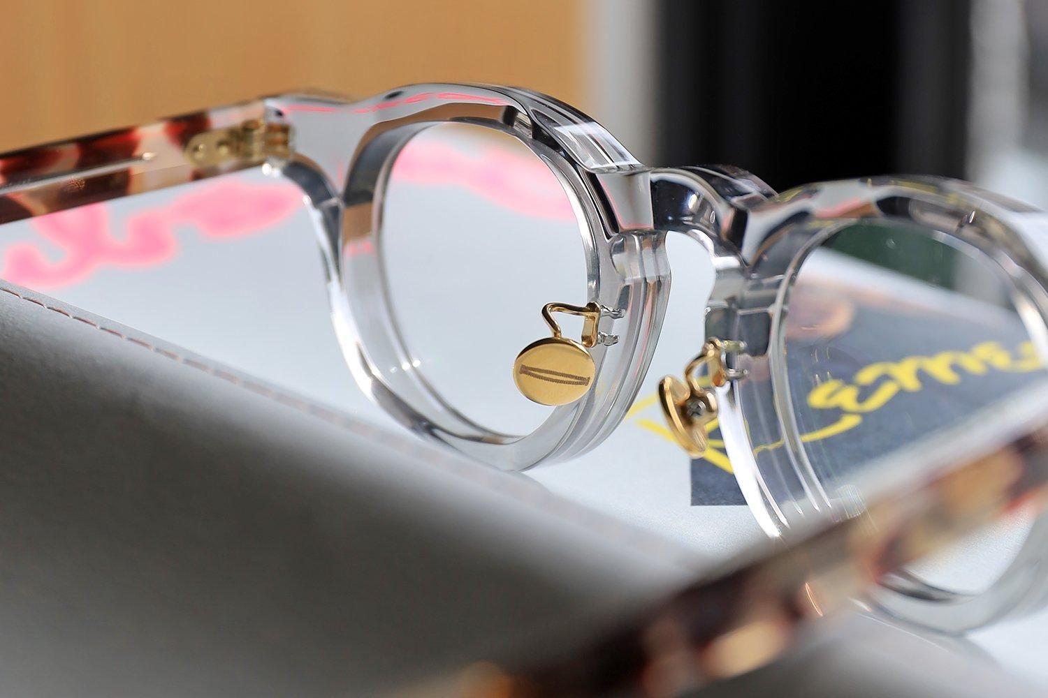「縫い針」をイメージしたテンプル芯や「ボタン」をイメージされたゴールドカラーの丸い鼻パットも特徴的。