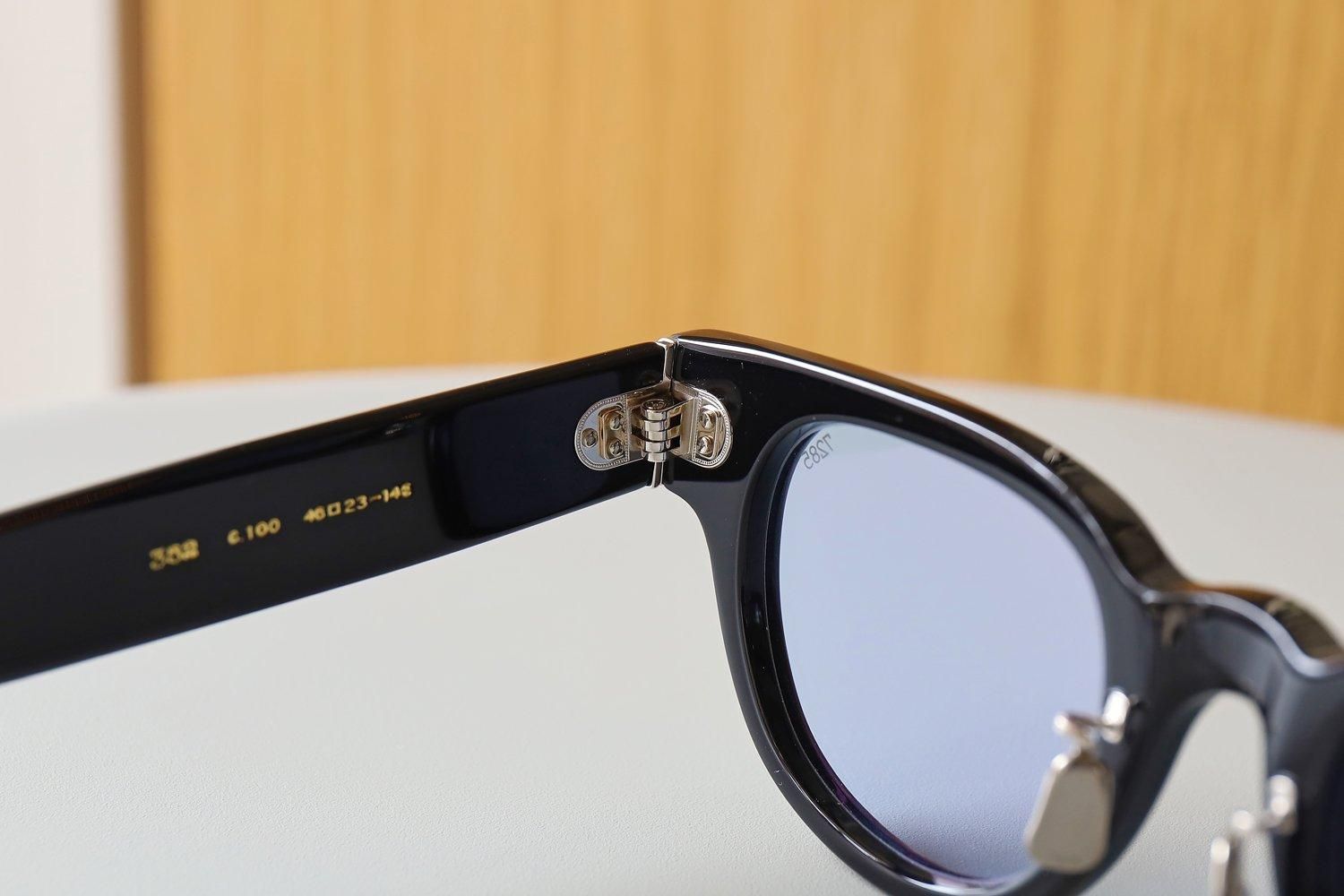 ワイドテンプルやミリタリー丁番、縦型サンプラチナカシメ飾りなど、ブランドを象徴するアイコンが満載。