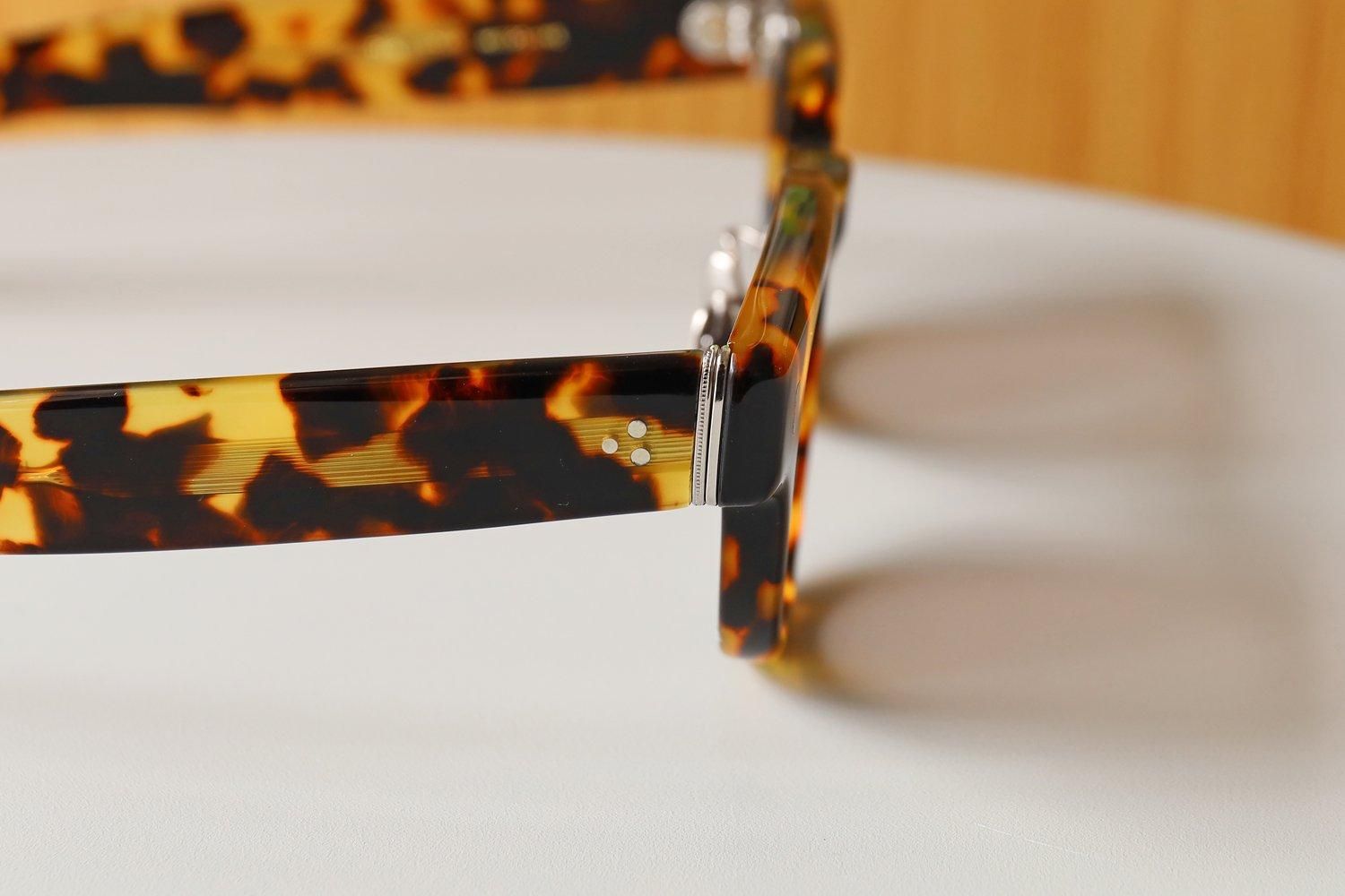 ワイドテンプルやミリタリー丁番、縦型サンプラチナカシメ飾りなど、ブランドを象徴するアイコンが満載。