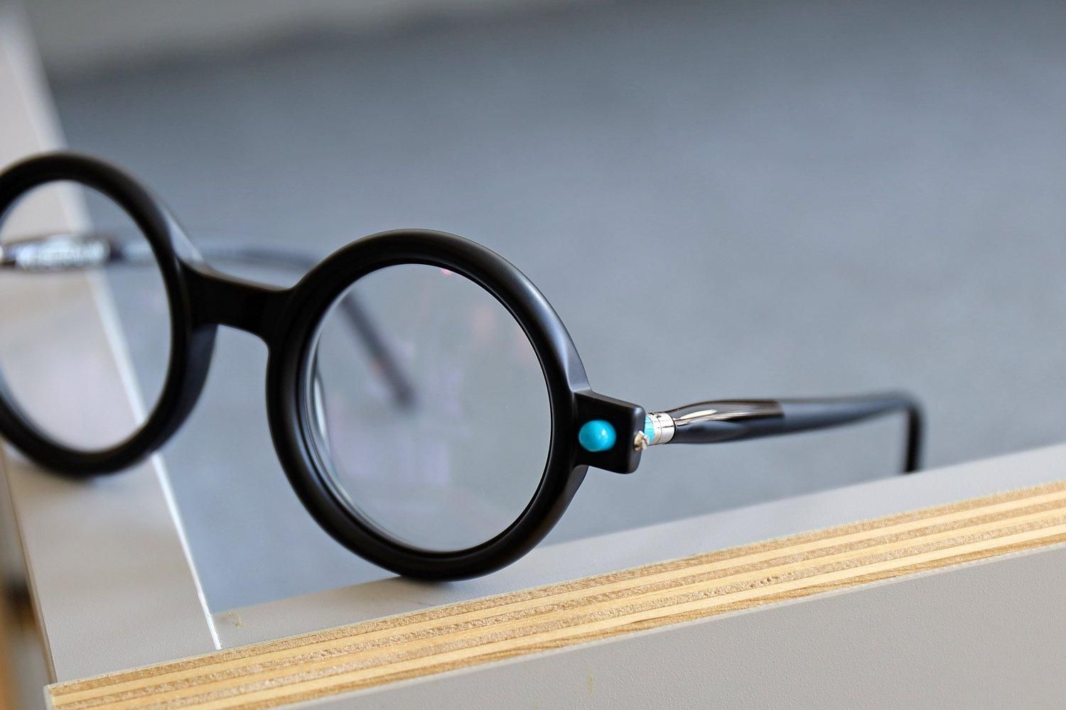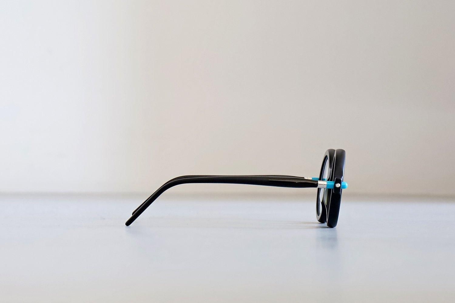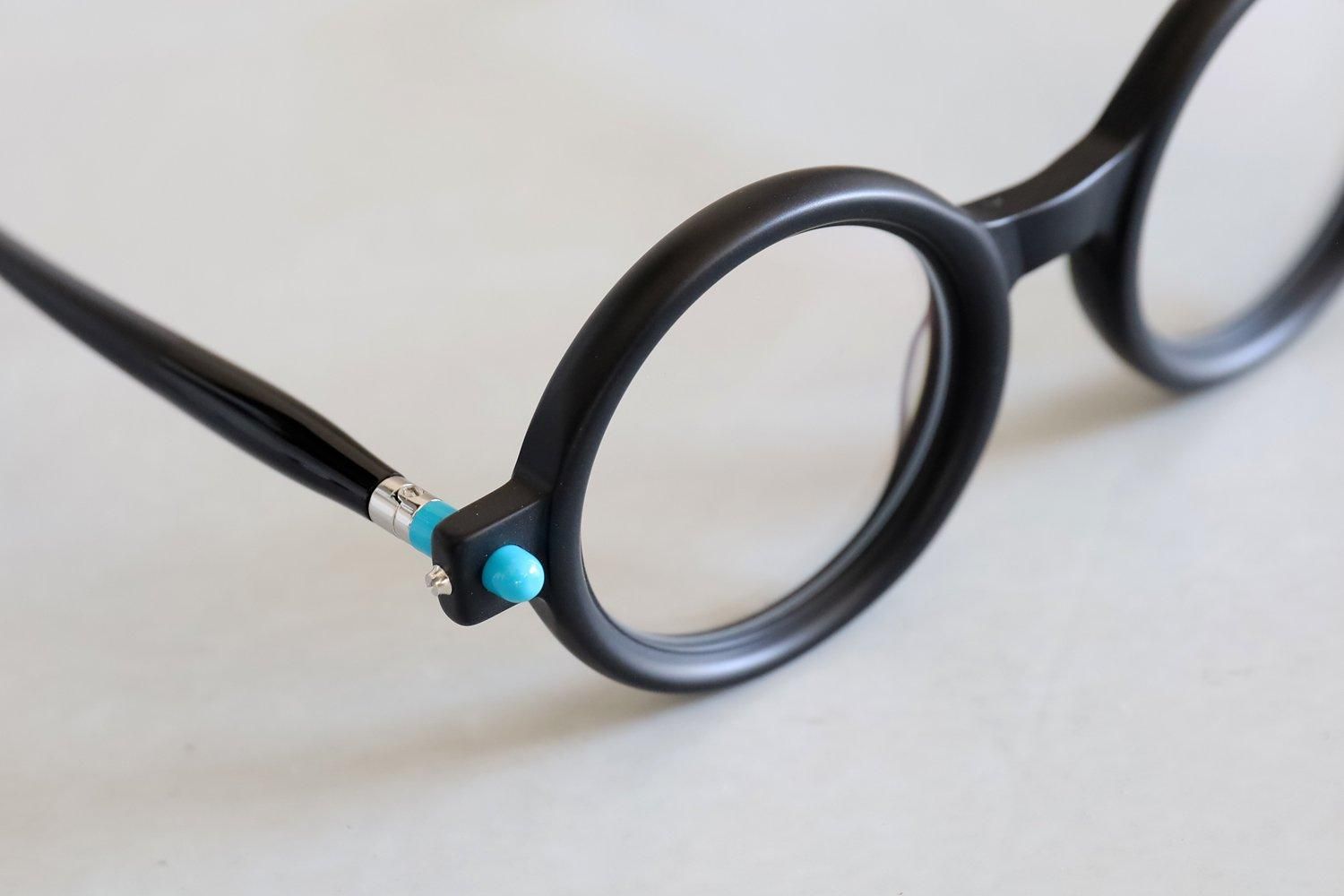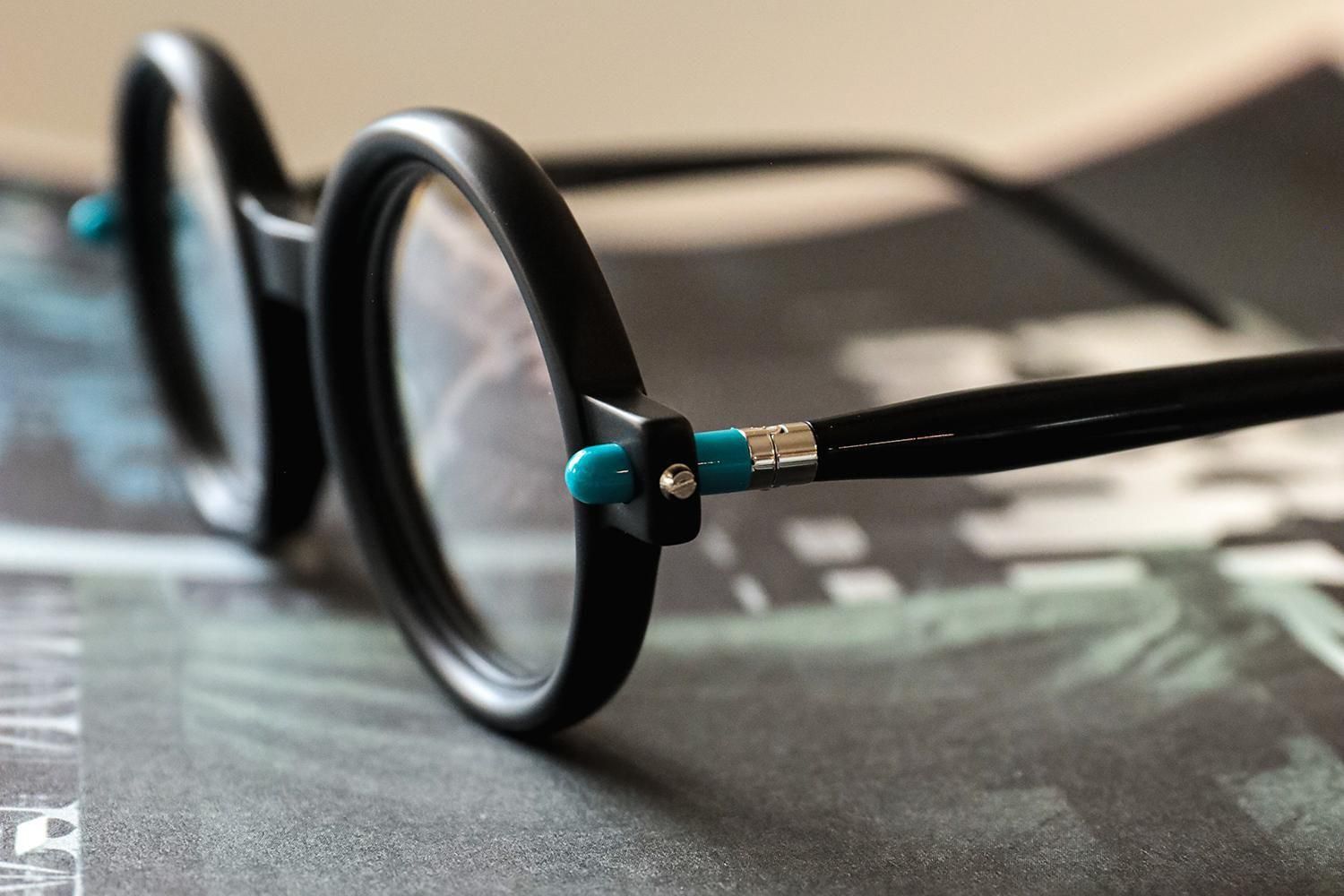 テレビジョンカットのように奥行を持ったレンズ面や、貫通したテンプルのピンがアクセントとなるカラーの組み合わせなど、細部にまでこだわったデザインが特徴的。