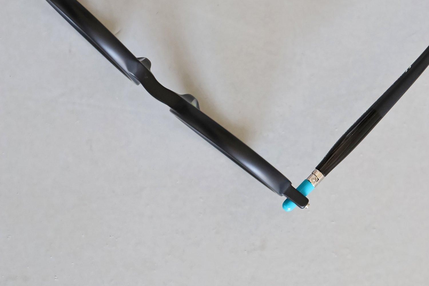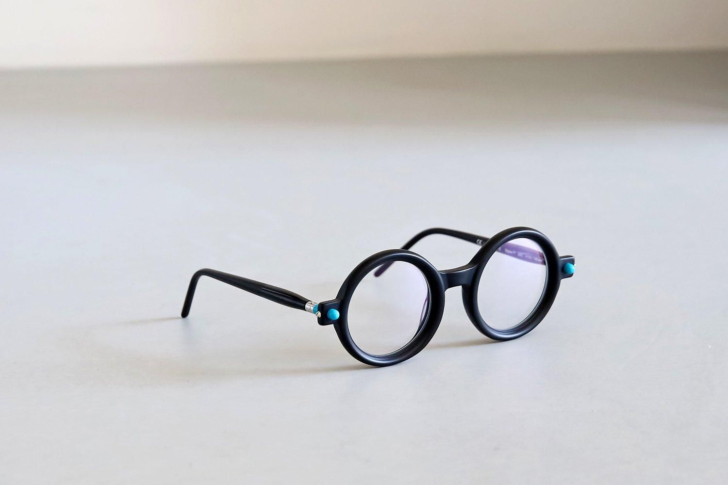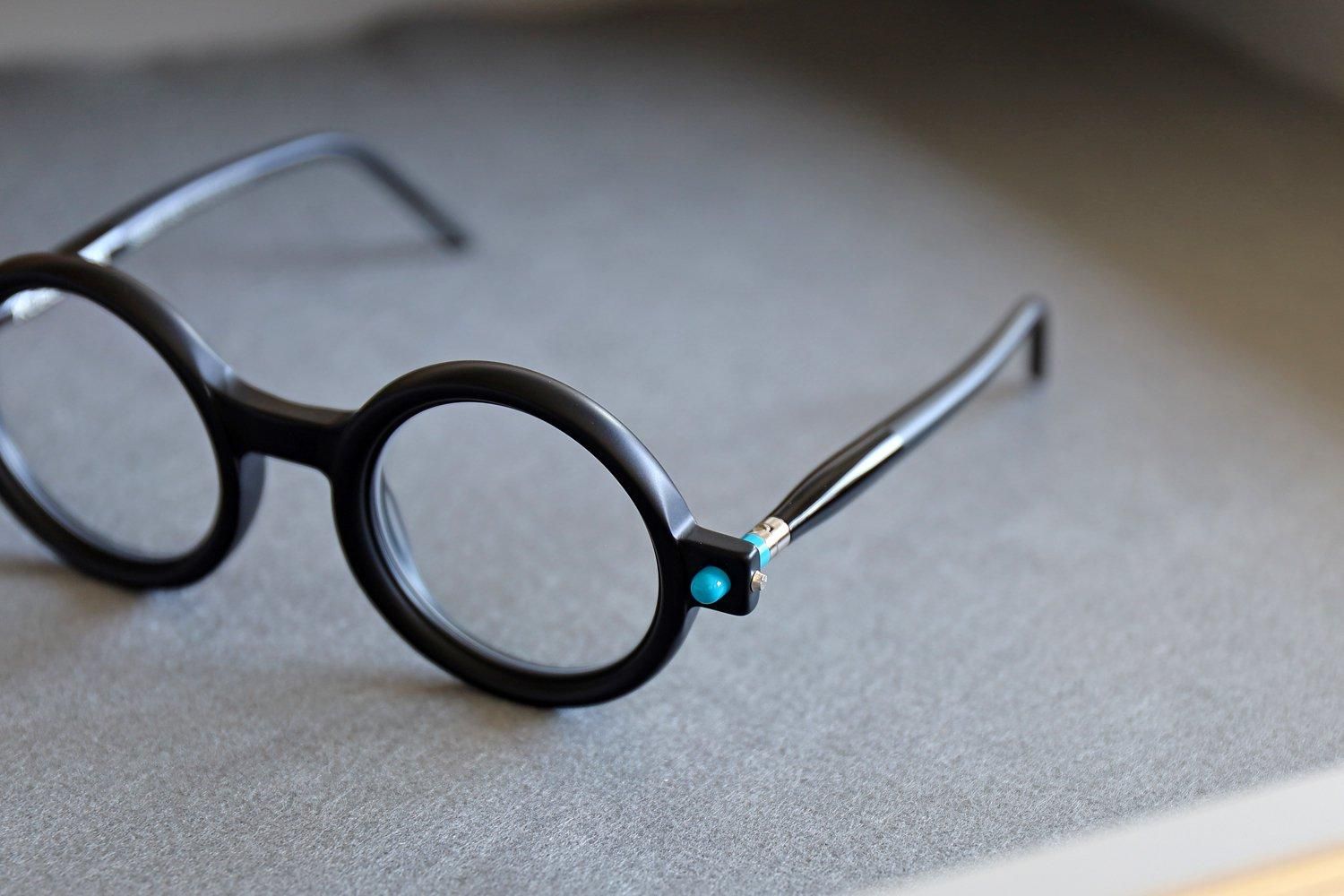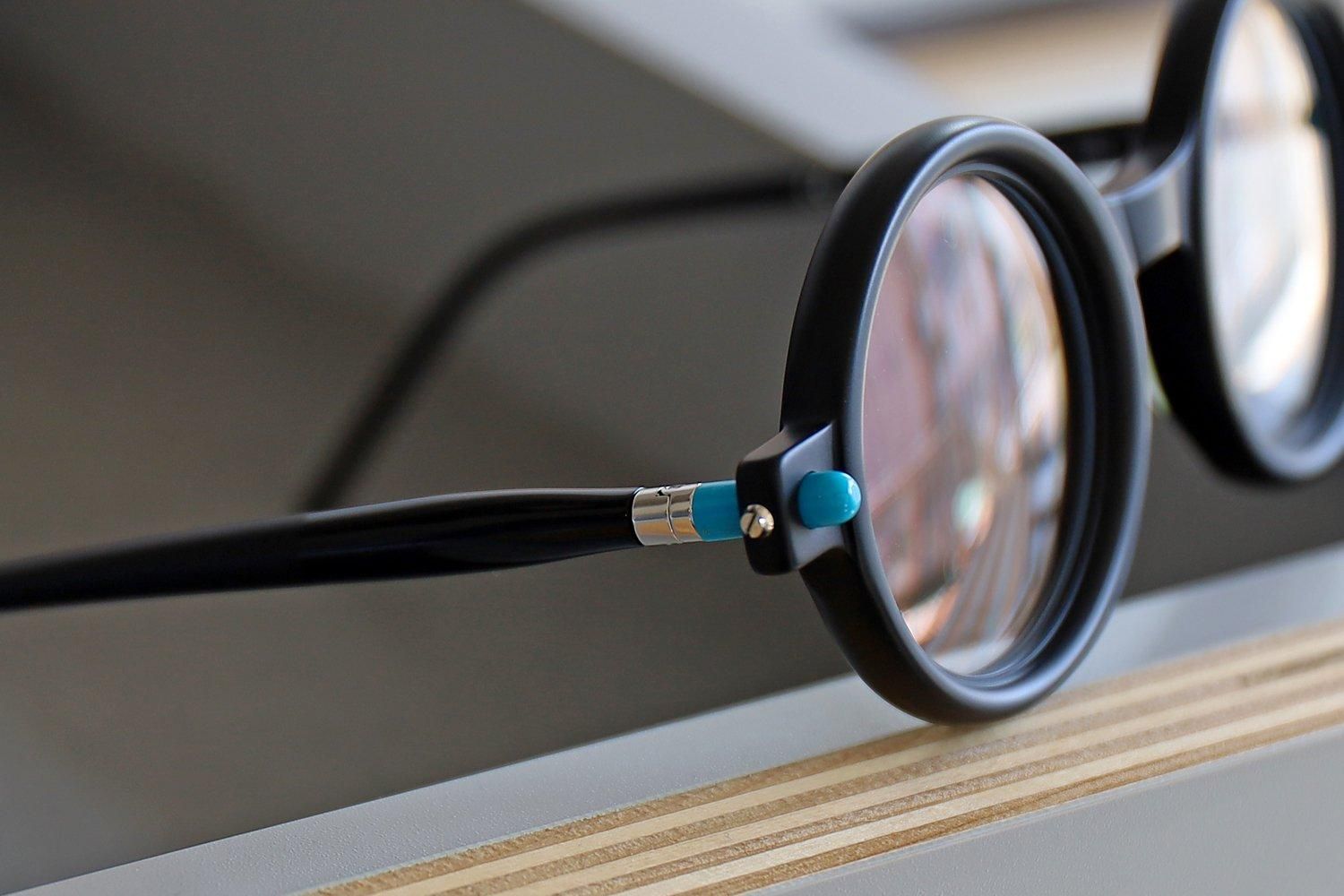 テレビジョンカットのように奥行を持ったレンズ面や、貫通したテンプルのピンがアクセントとなるカラーの組み合わせなど、細部にまでこだわったデザインが特徴的。
