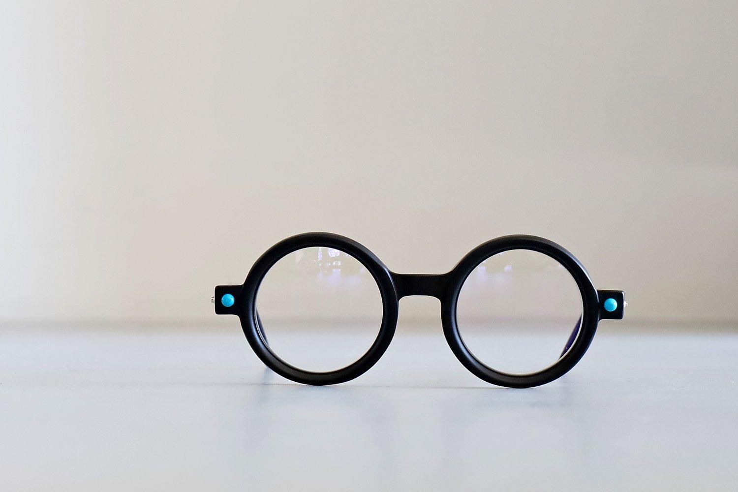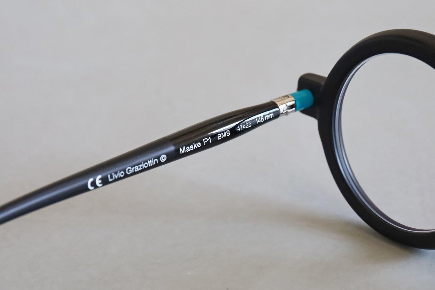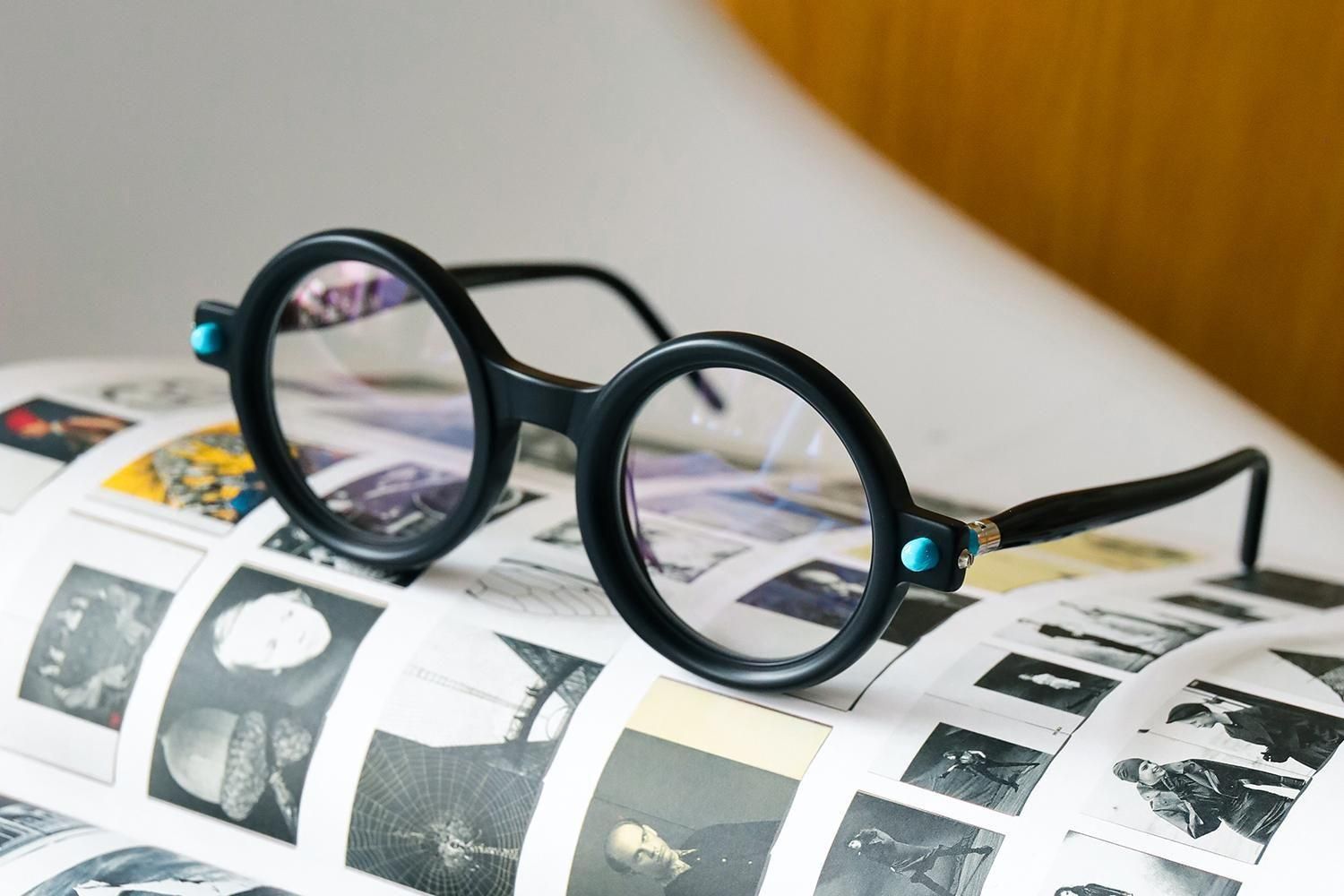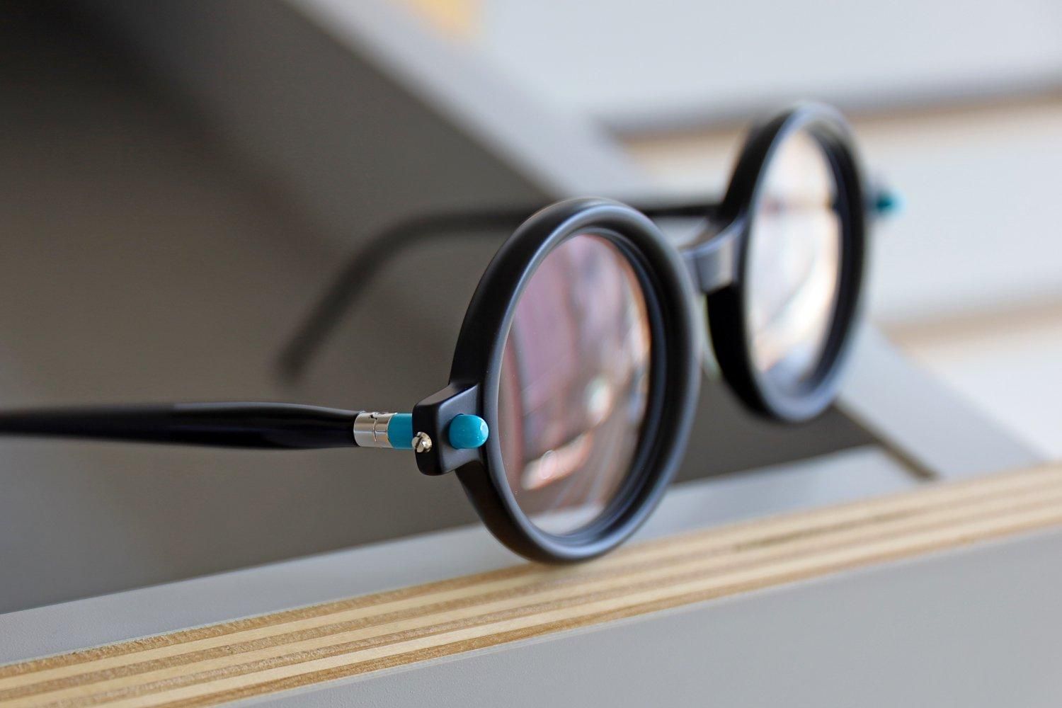 テレビジョンカットのように奥行を持ったレンズ面や、貫通したテンプルのピンがアクセントとなるカラーの組み合わせなど、細部にまでこだわったデザインが特徴的。