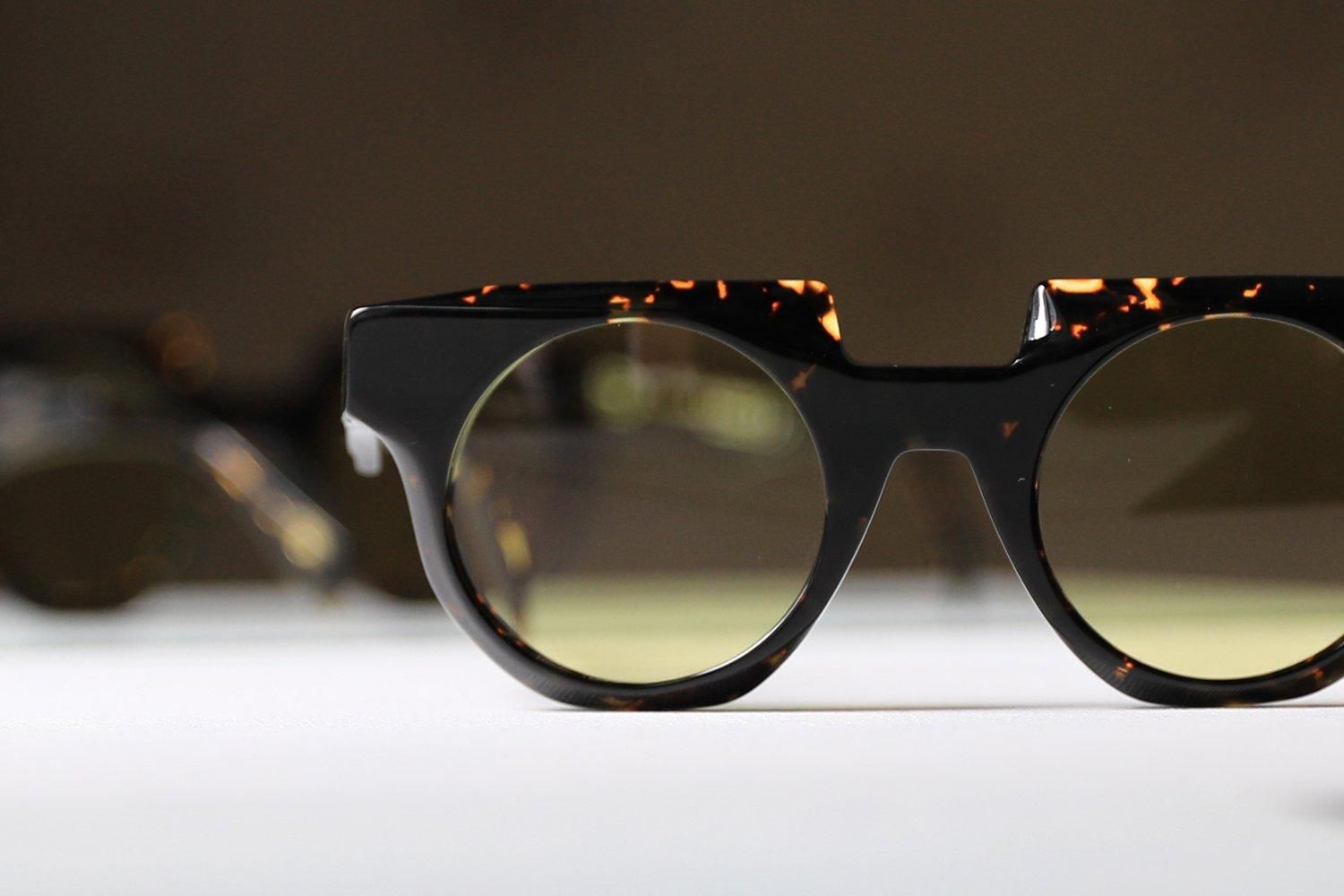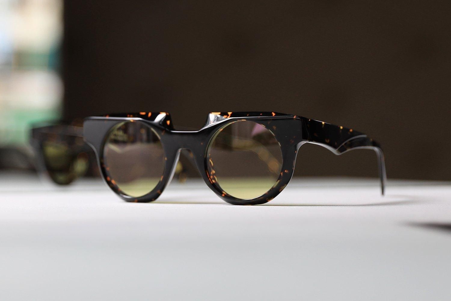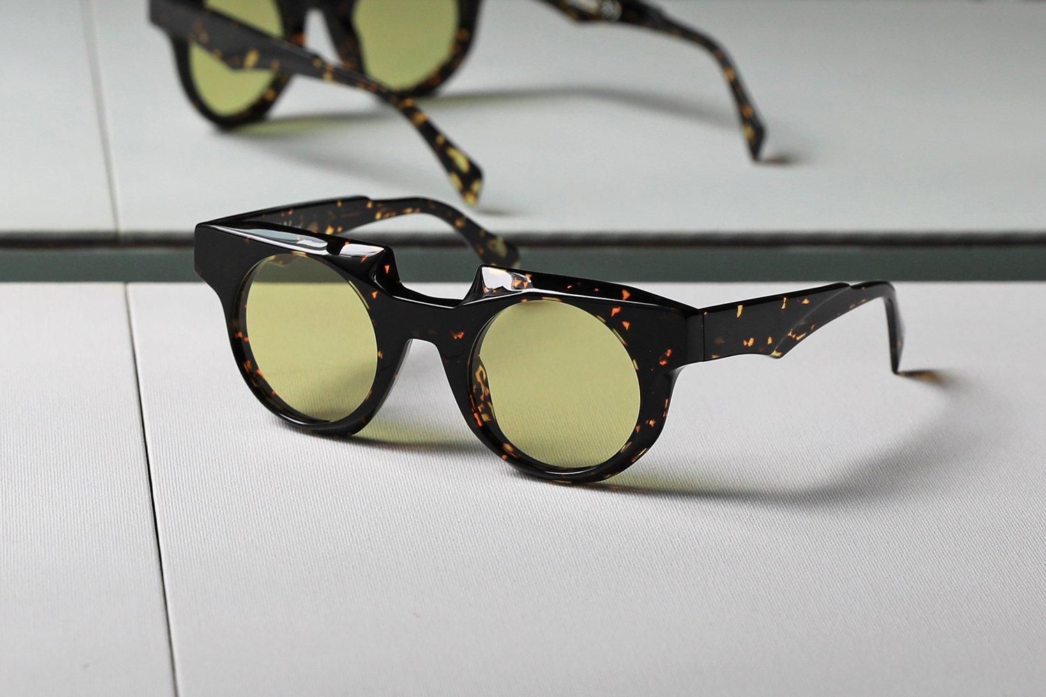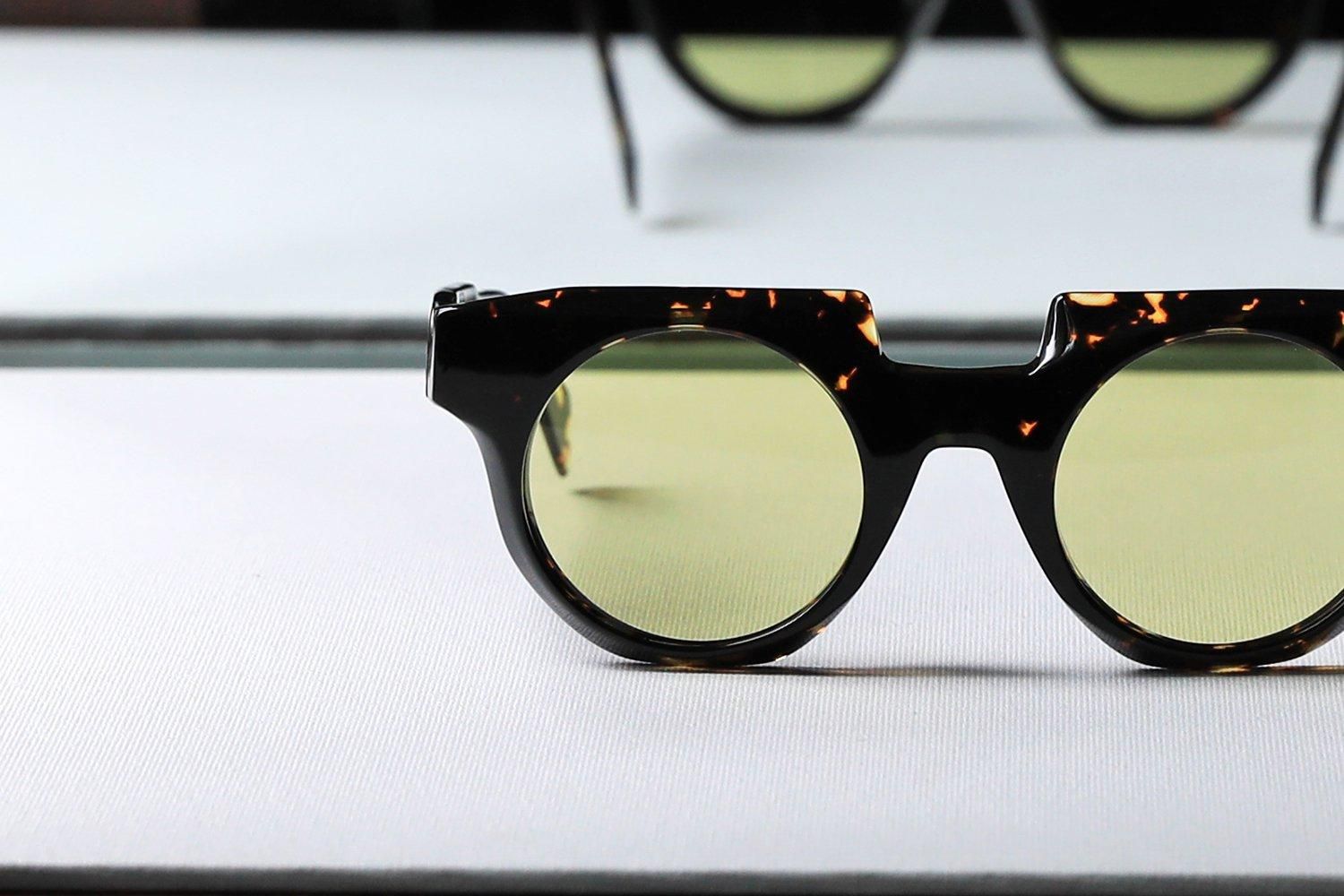 真円を少しだけ潰したようなレンズシェイプと角の立ったフレームデザインとのコントラストもまたユニーク。