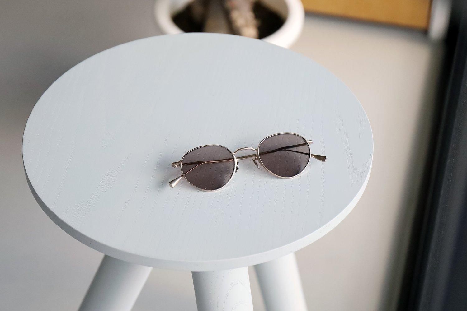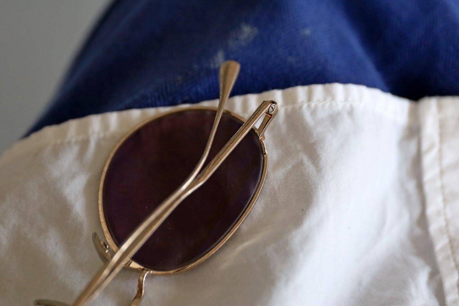 柄を排したミニマルなルックとシートメタルリム部の厚みに強弱をつけるなど、構築的なフォルムが特徴的。外側へ段階的に広がり側頭部に沿ってホールドするというアウトセットテンプルは2023AWモデル[190]で開発したパーツ。クラシックデザインの延長線上にありながら今の気分を反映させたコンテンポラリーなモデル。サングラスは色味の調合からメーカーと開発したガラス製オリジナルのフラットレンズを採用。