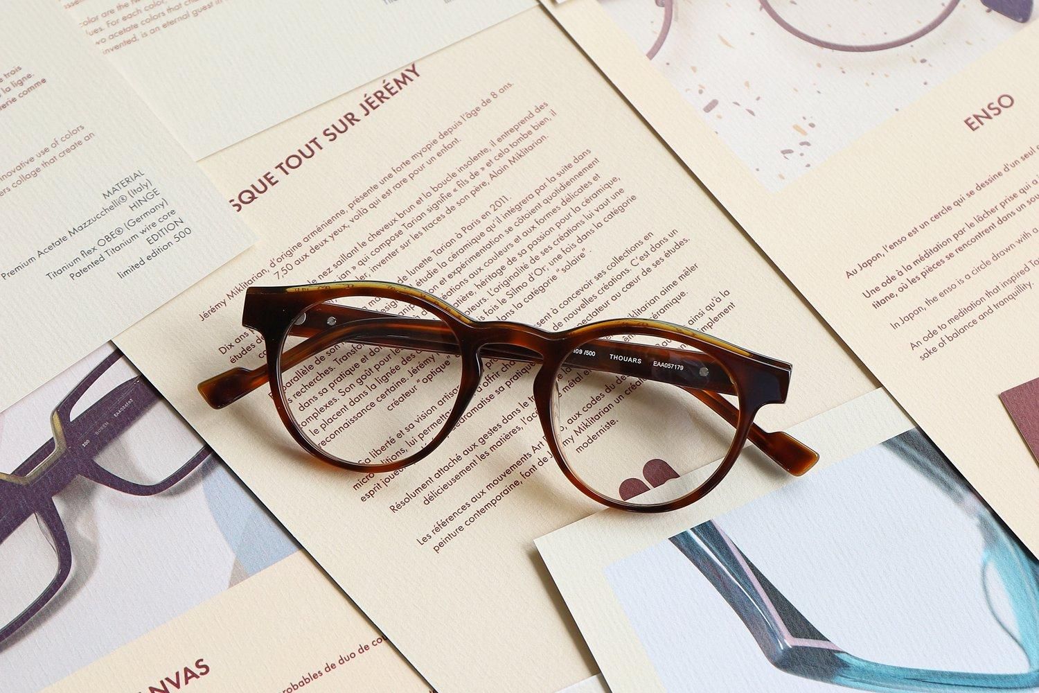 新しい魅力を放つ「THOUARS」は、以前の人気モデル「DUPETIT THOUARS」を改良し、メタルパーツを段落ちのアセテートに置き換えることで、独自のカラー切り替えを表現しています。tarianらしい鮮やかなカラーリングと、シンプルで美しいラインが特徴です。