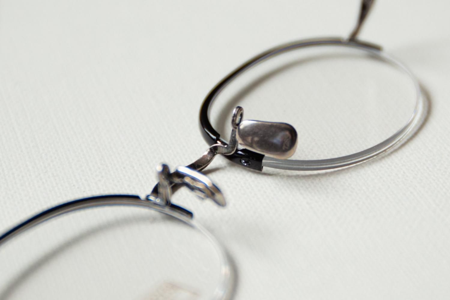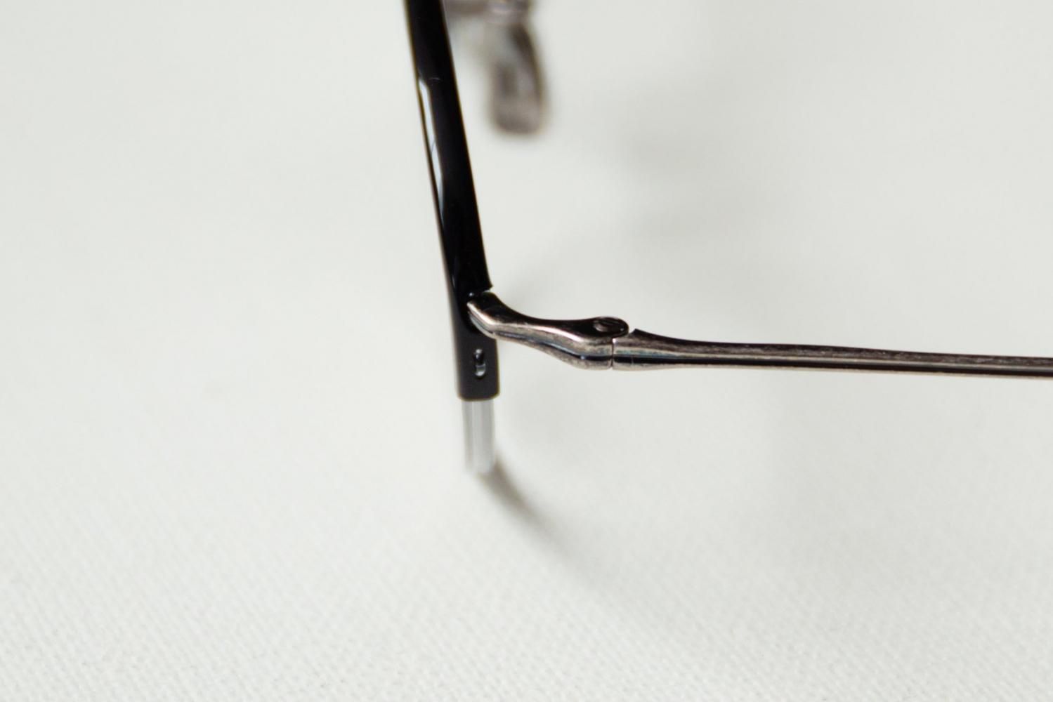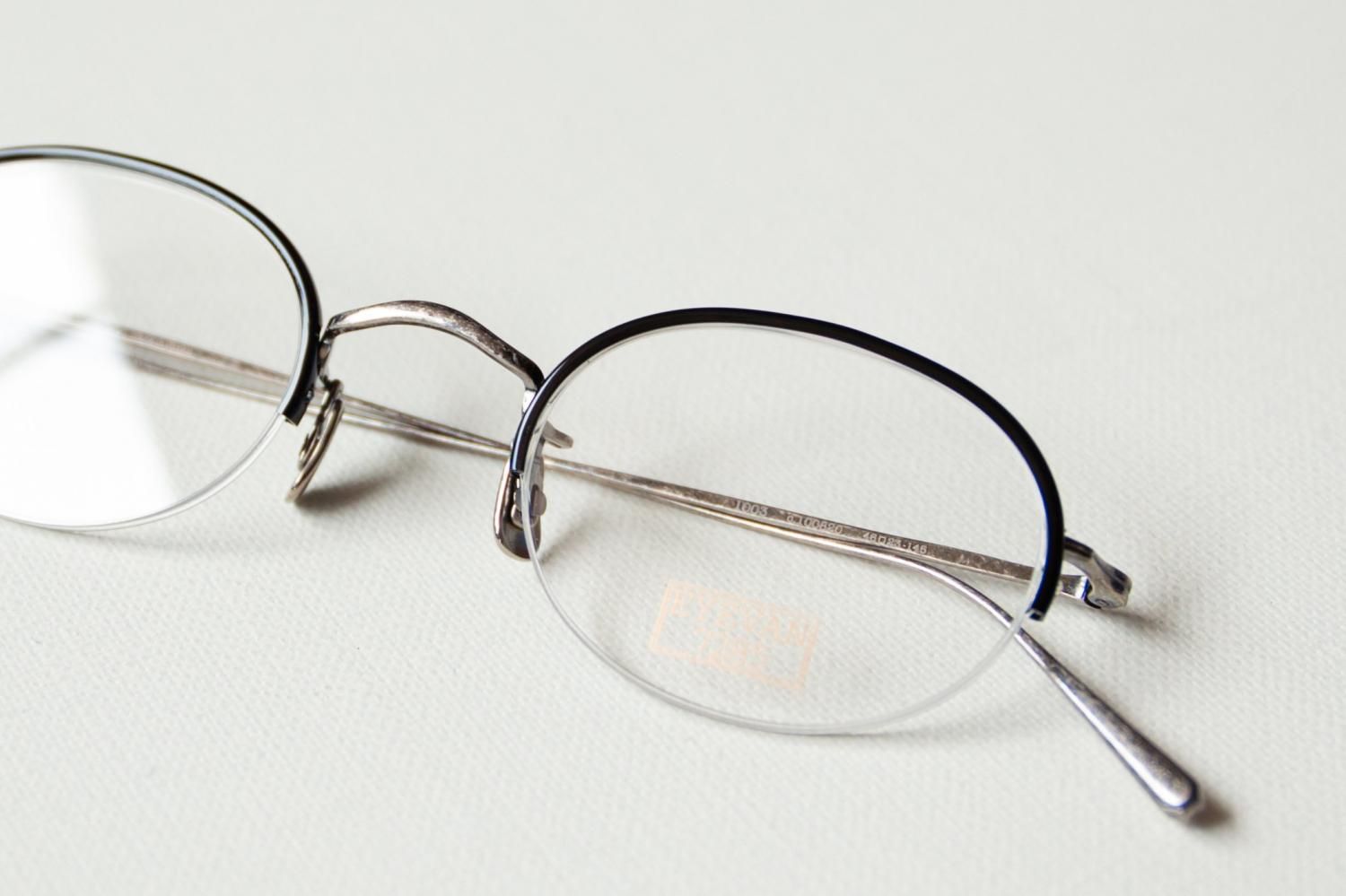 90年代に散見されたナロー(narrow)なオーバル型がイメージソース。 メタルナイロールで上部はセル巻きでカバーした。