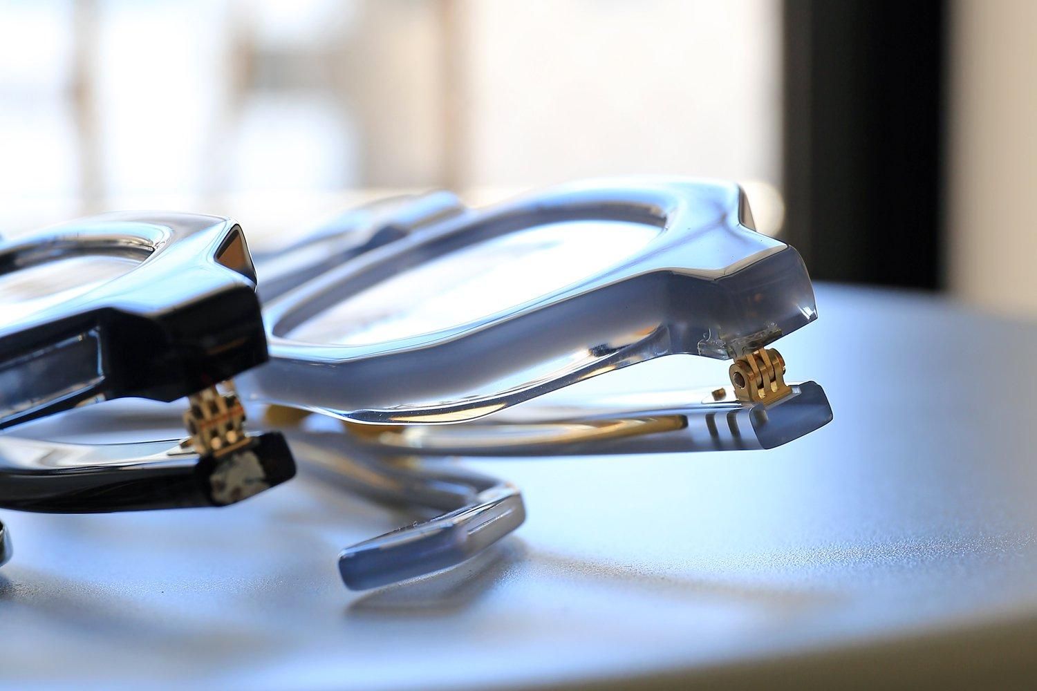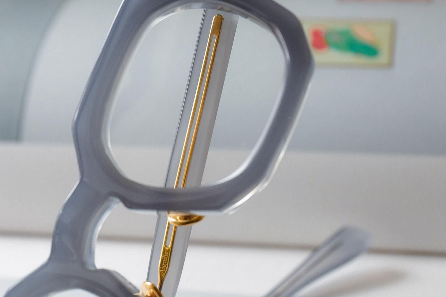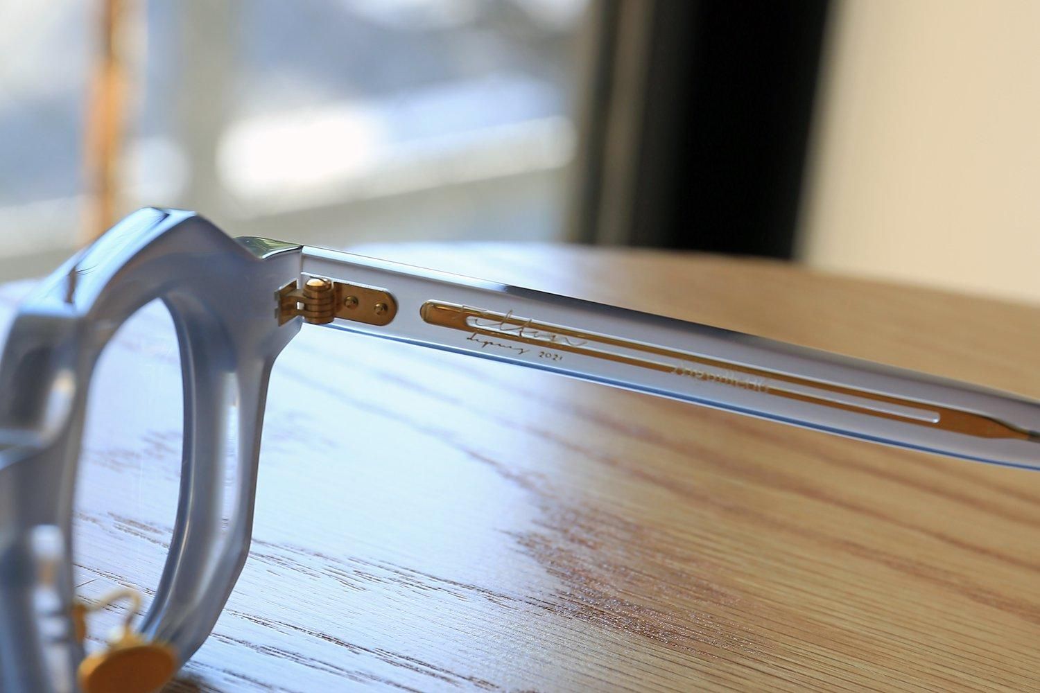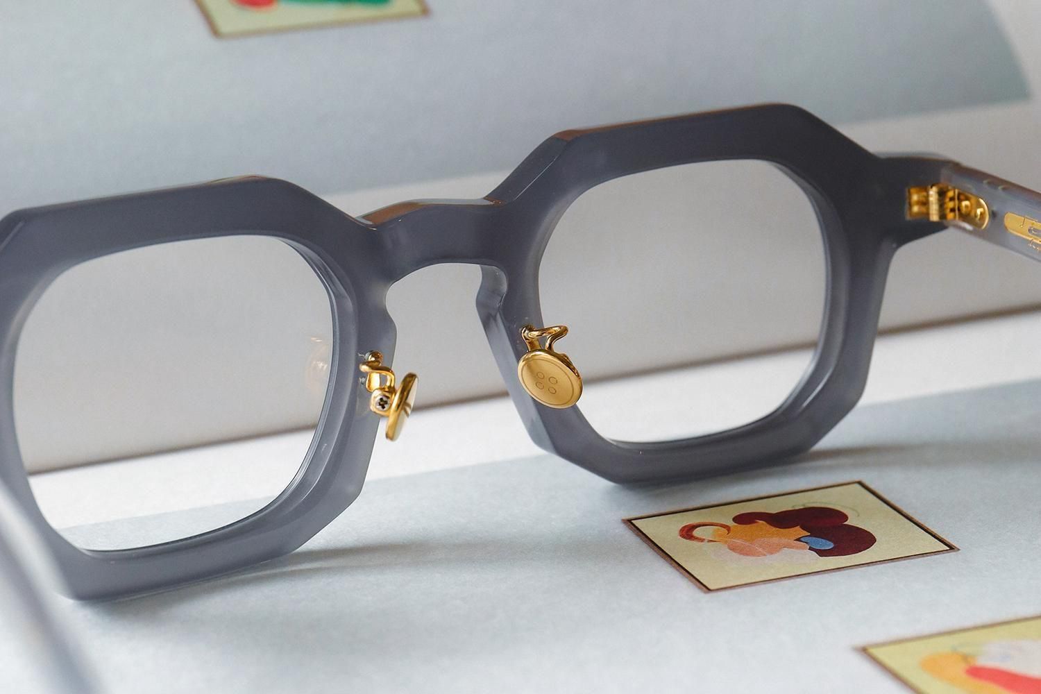 「縫い針」をイメージしたテンプル芯や「ボタン」をイメージされたゴールドカラーの丸い鼻パットも特徴的。