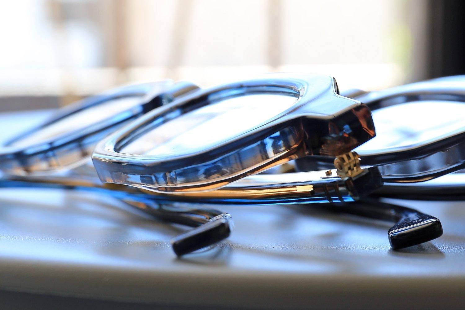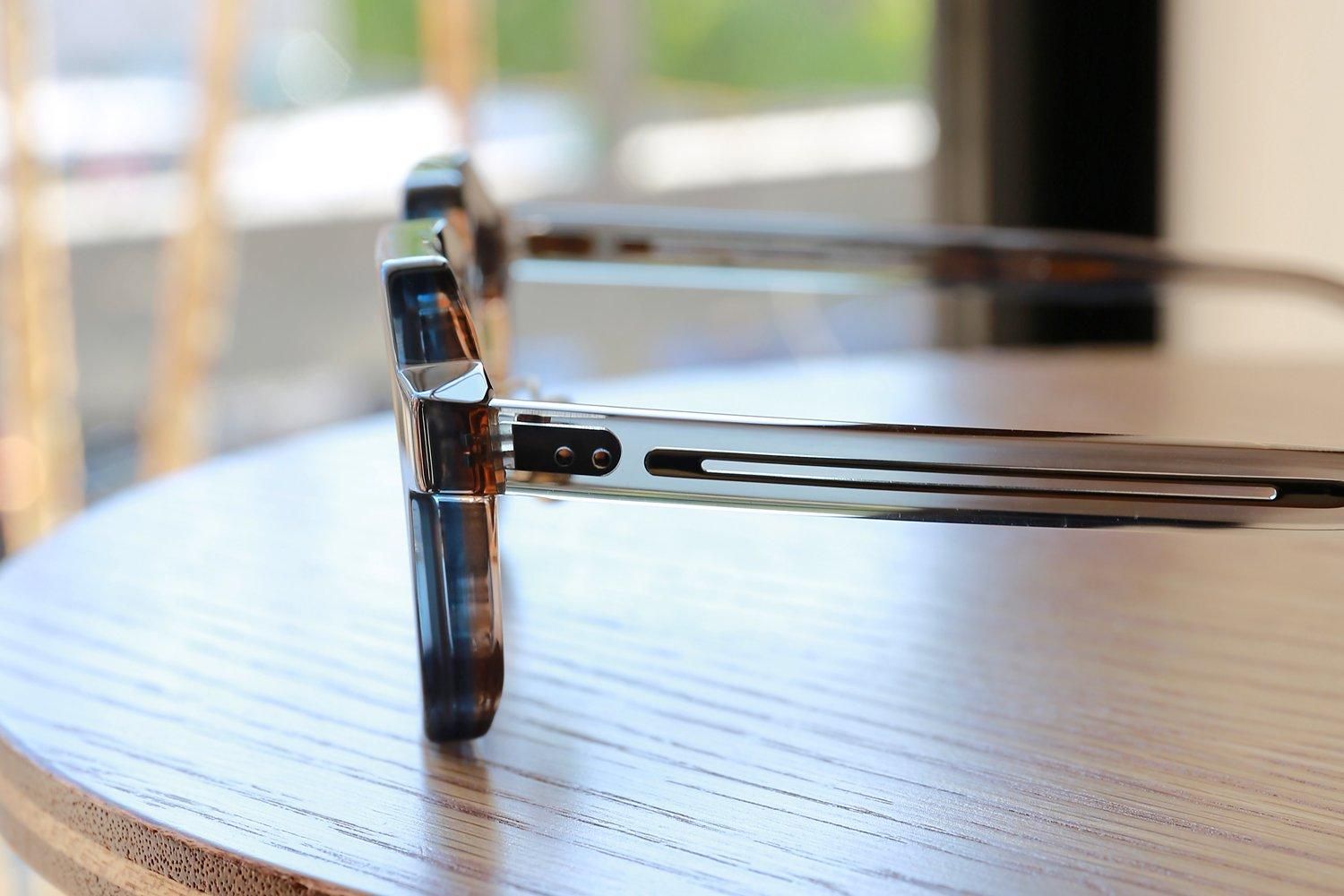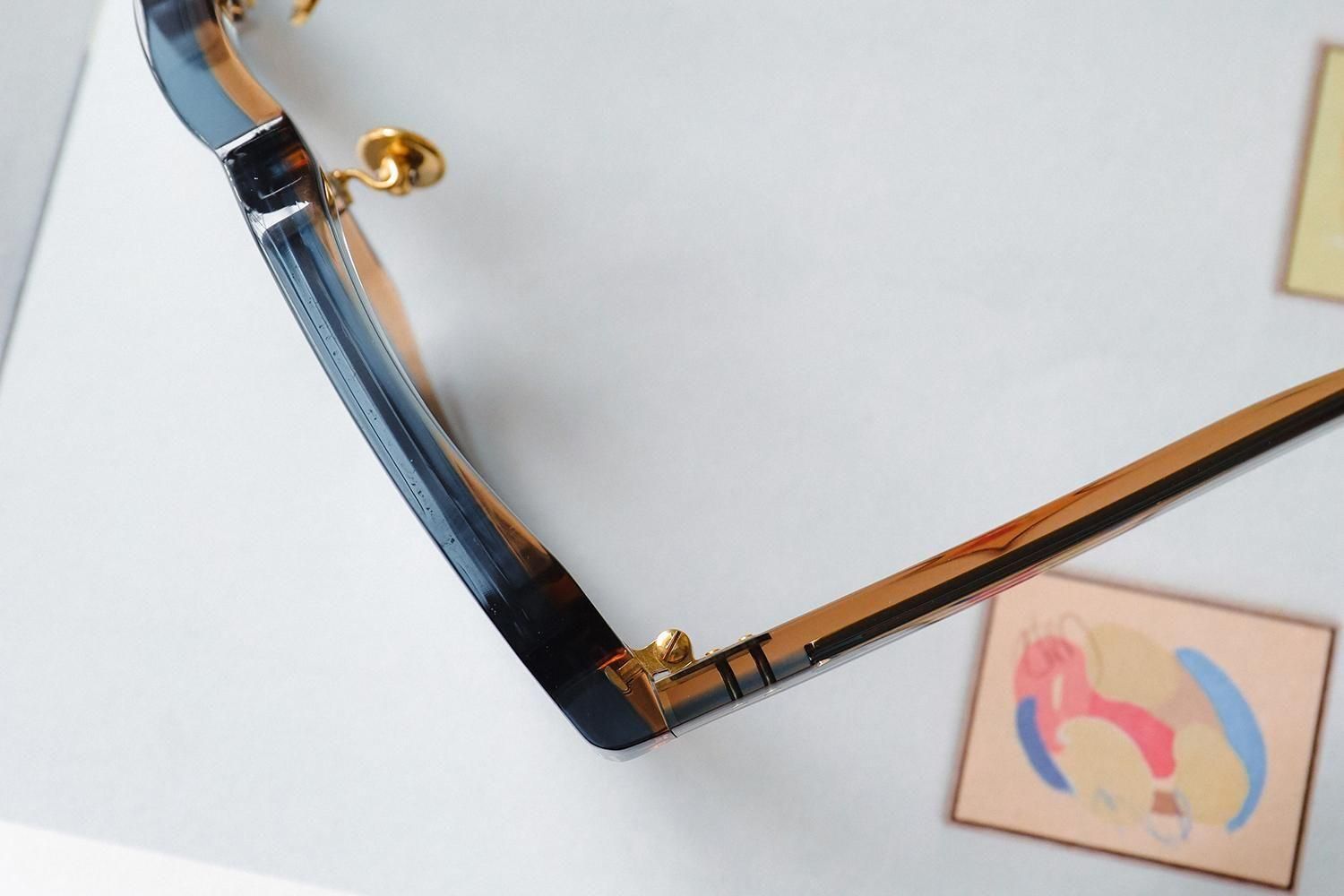 「縫い針」をイメージしたテンプル芯や「ボタン」をイメージされたゴールドカラーの丸い鼻パットも特徴的。
