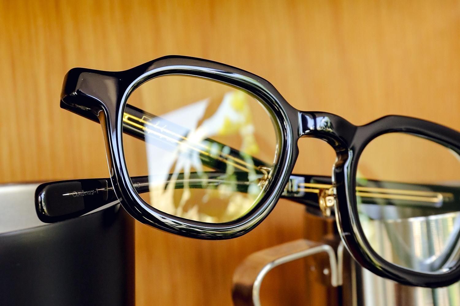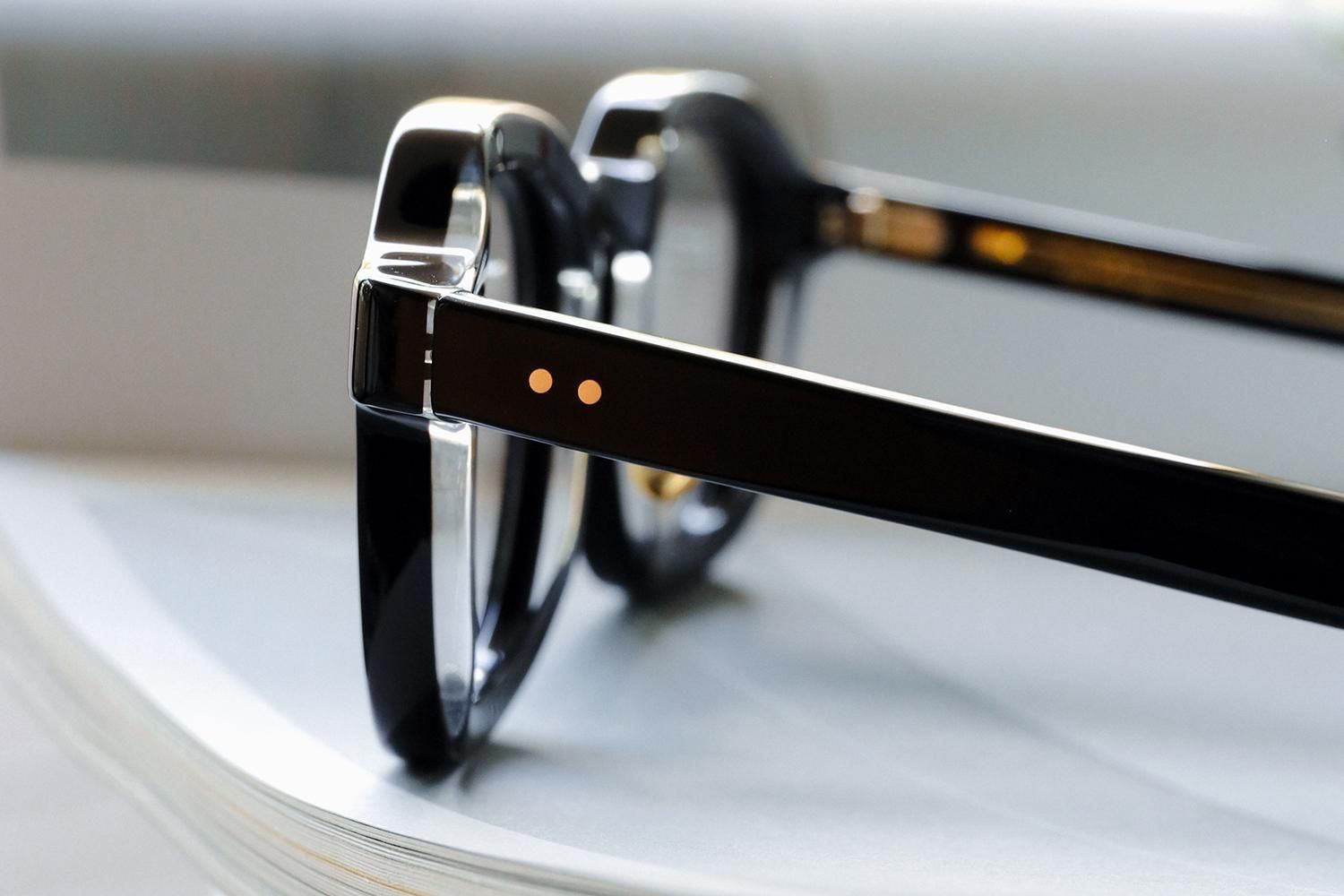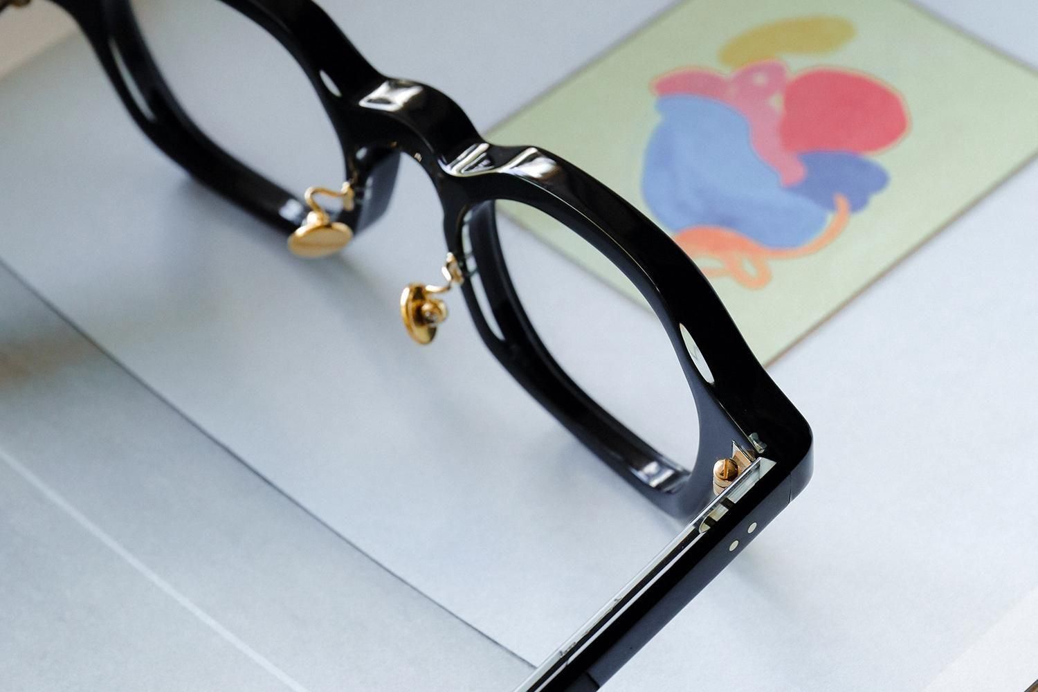 「縫い針」をイメージしたテンプル芯や「ボタン」をイメージされたゴールドカラーの丸い鼻パットも特徴的。
