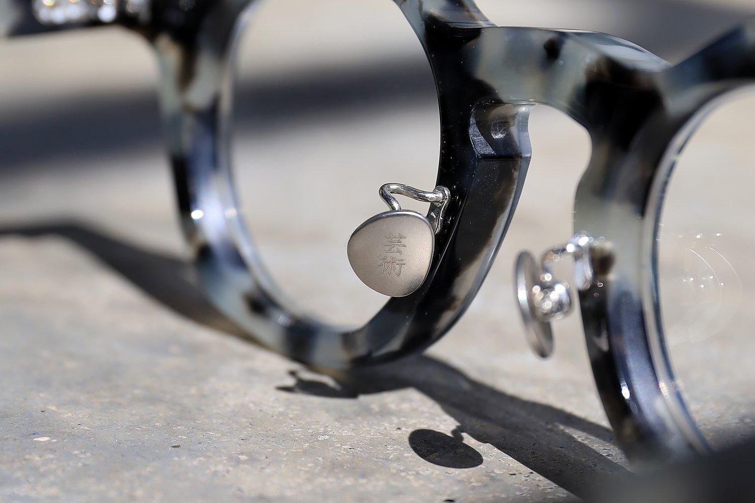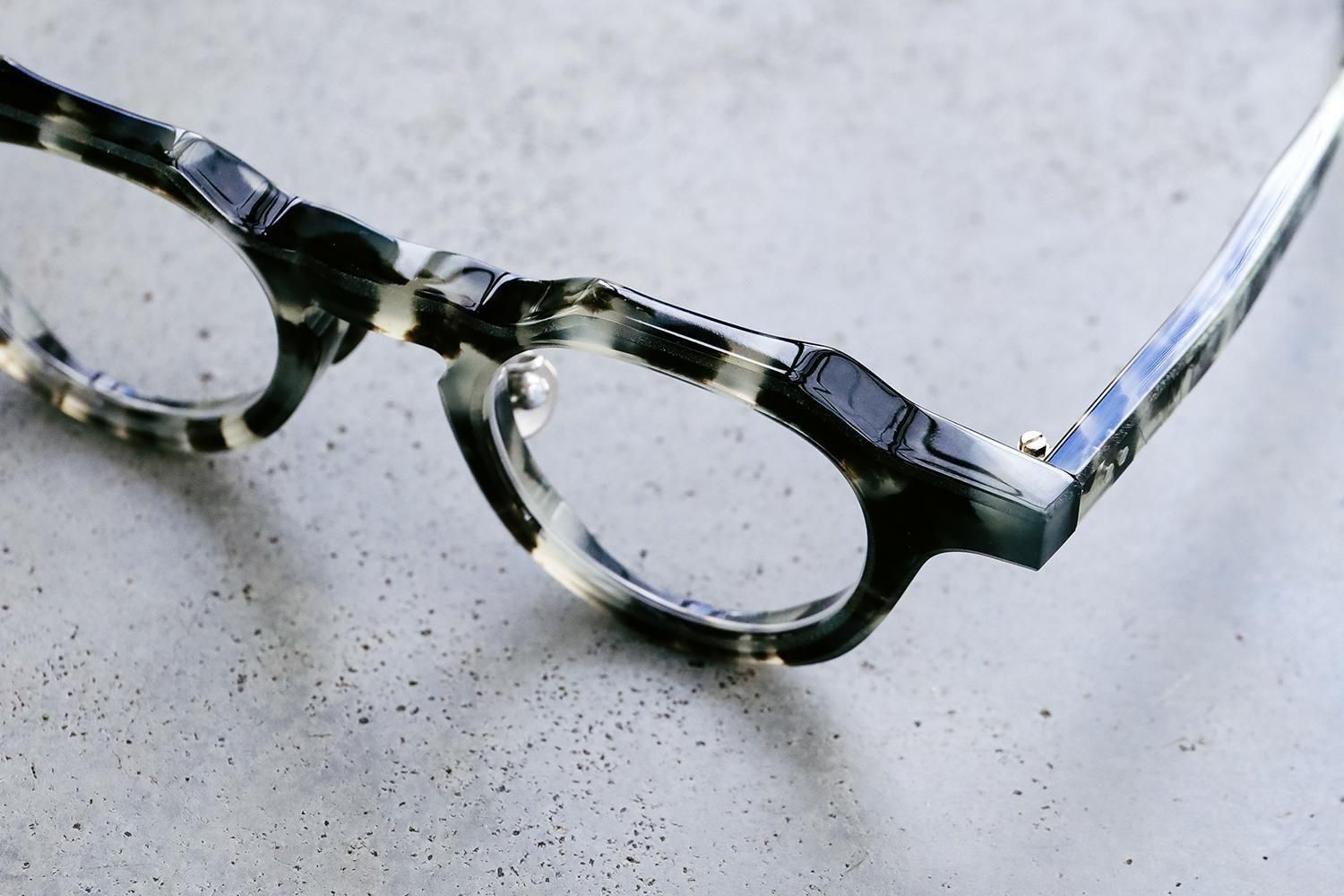 また、フレーム全体には職人による丁寧な手作業でヤスリ掛けが施されており、その結果生まれるマットな質感は、光の当たり具合によってさまざまな表情を見せます。丸みを帯びたパントのシェイプと、クラウンパントの特徴である直線的なラインとのコントラストが、このフレームに独特の立体感を与え、どの角度から見ても異なる魅力を楽しむことができます。