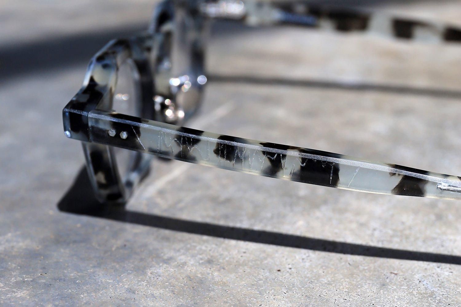 セルロイドにクリア生地を重ね合わせる技術が用いられており、8mm厚の生地を削り込み、磨き上げる事で出来上がる立体感と曲線美、重厚感は圧巻です。この独自の構造により、光の当たり方や角度によってさまざまな表情を楽しむことができ、見る者を飽きさせない魅力を持っています。