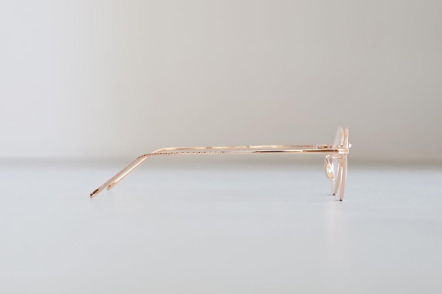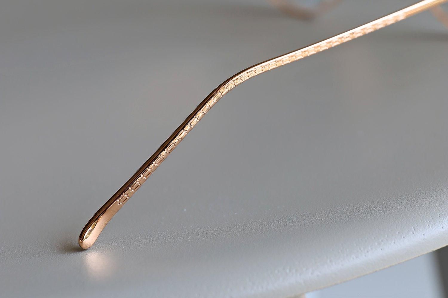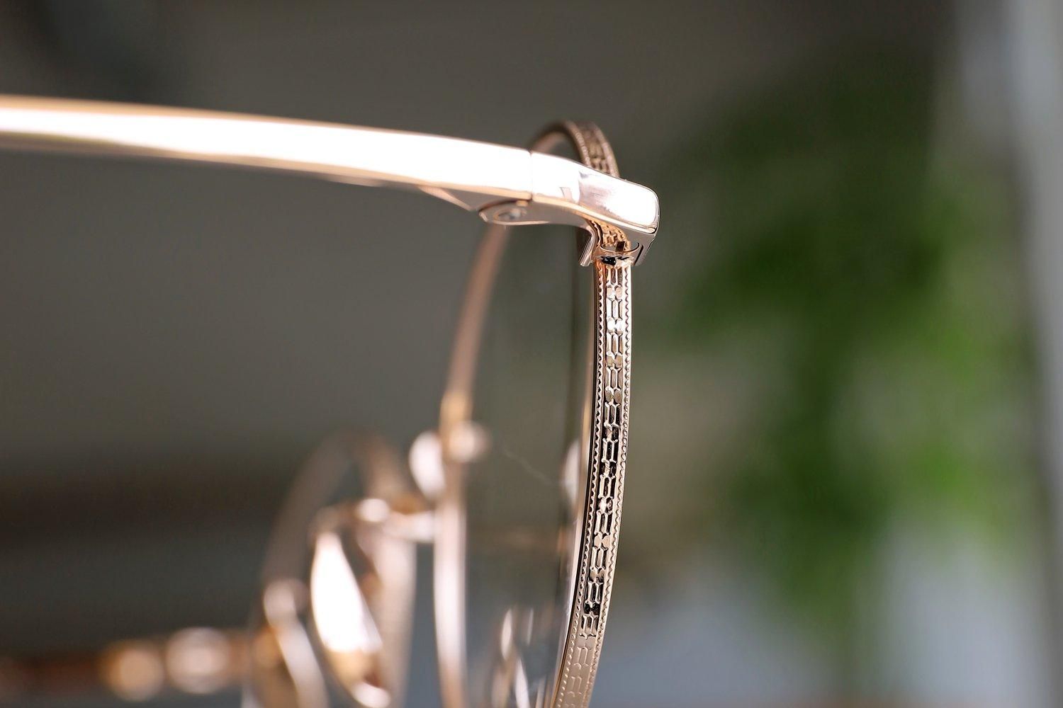 フレーム全体には、「亀」をモチーフにした繊細な彫金が施され、リムの周囲をぐるっと囲むようにデザインされています。また、テンプルエンドにも亀の彫金が施されており、見えない部分にまでこだわりを感じさせます。