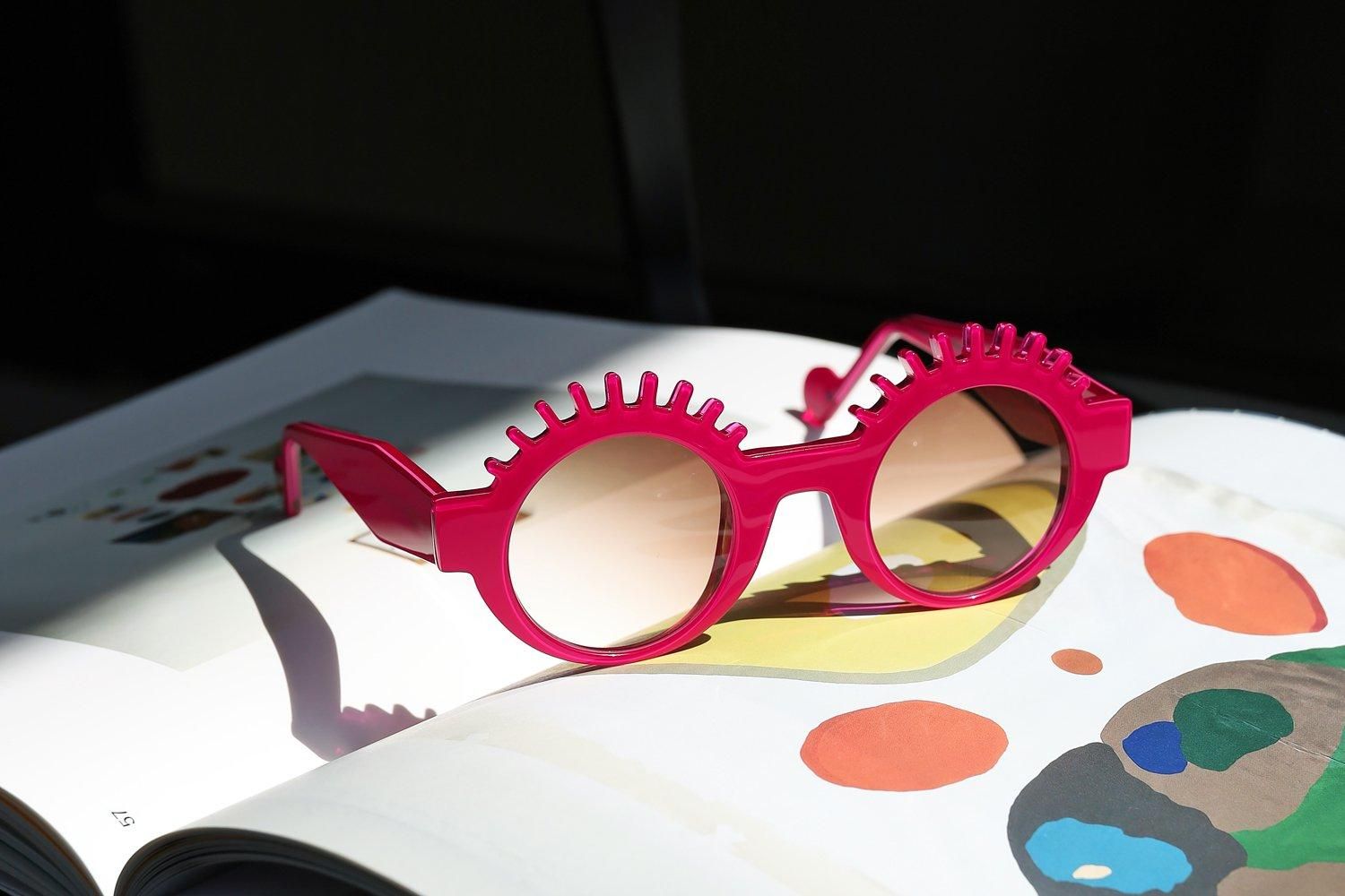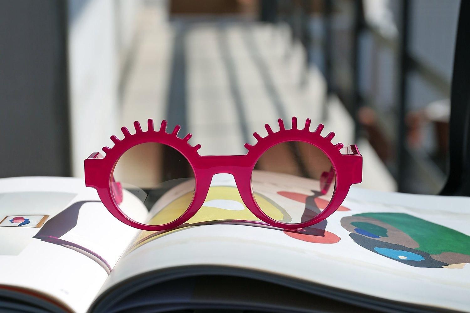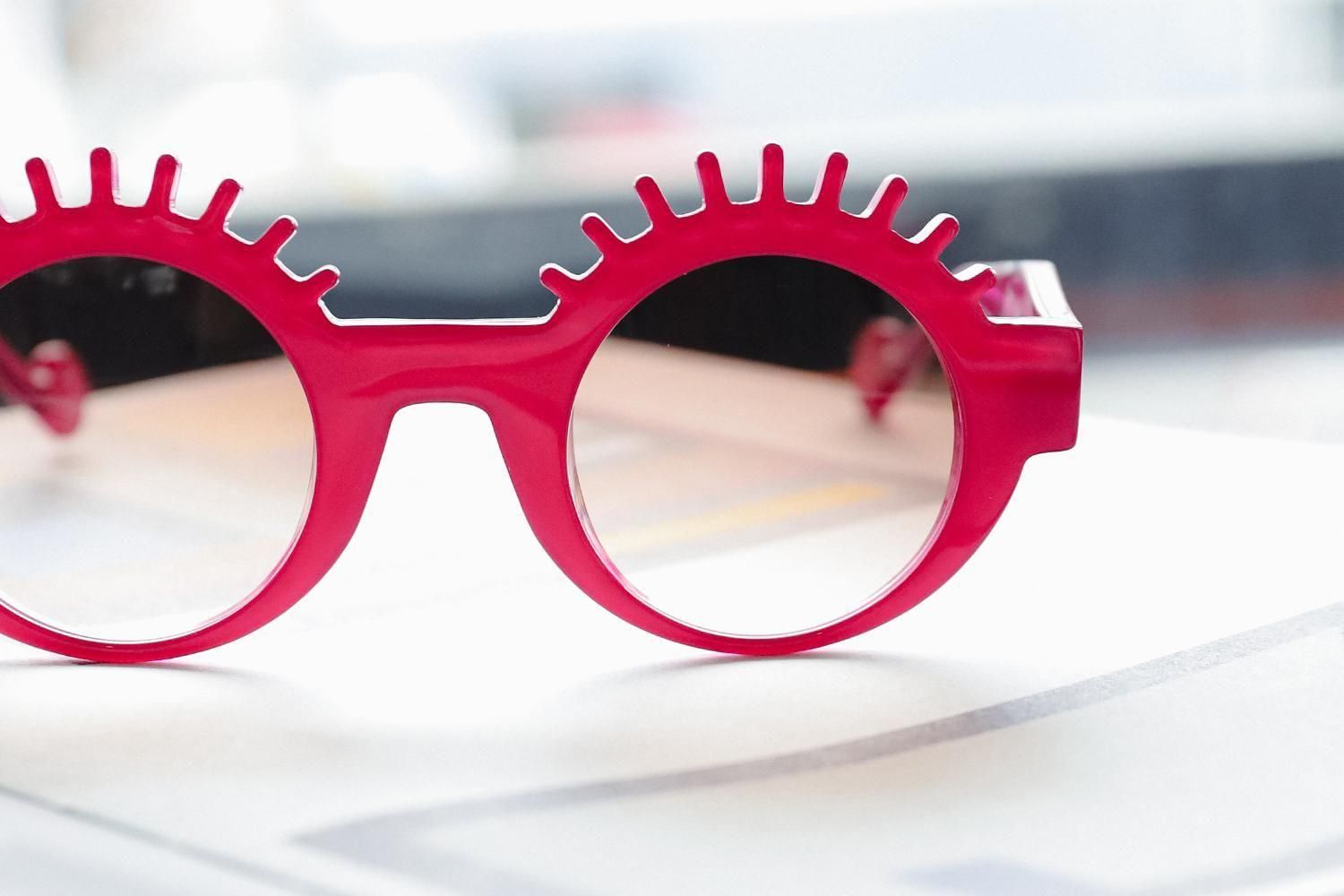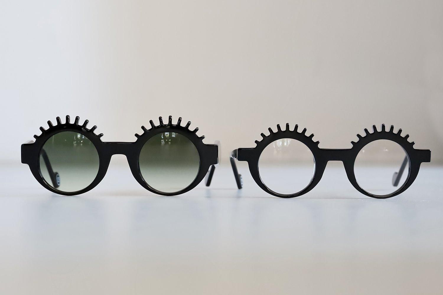 ラウンドのメガネにまつ毛のようなデザインをあしらった、