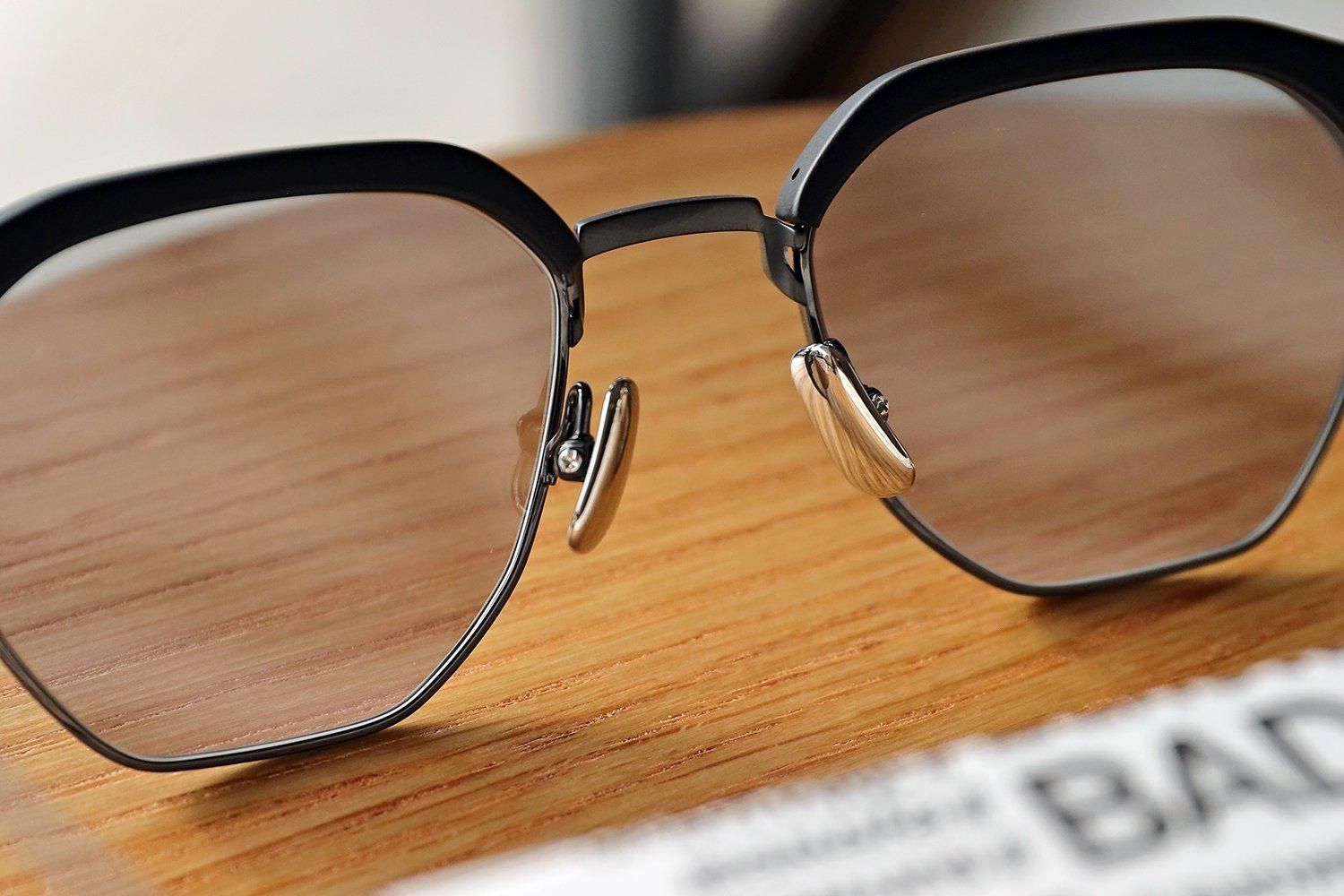 プラスティックのブローに、チタン材のヨロイと耳にかかるテンプルの異素材の