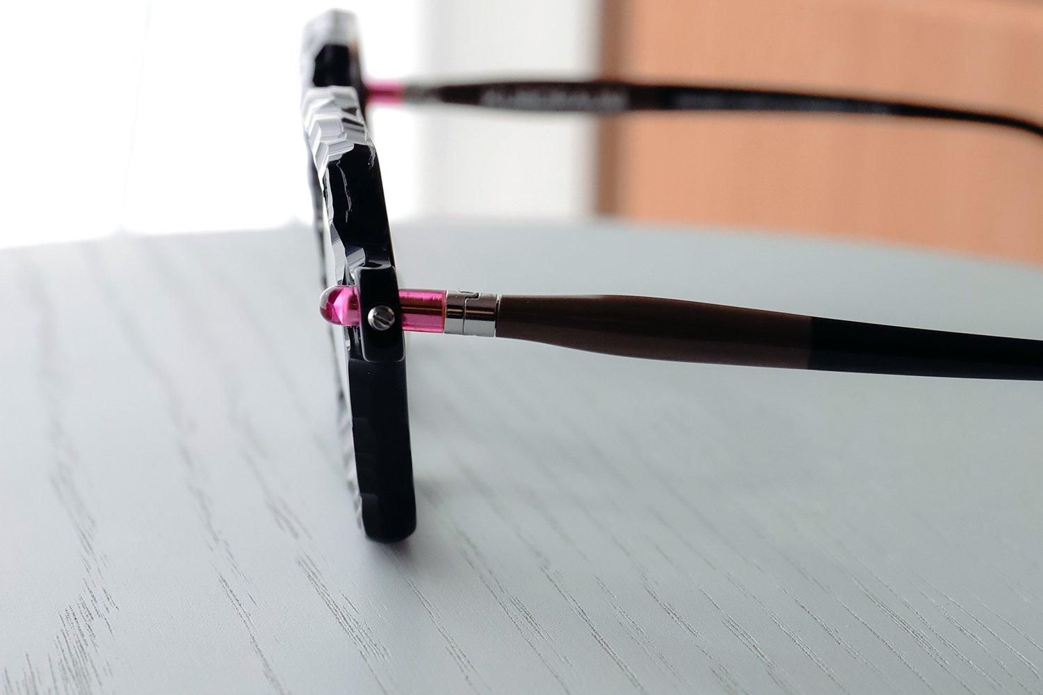 深みのあるブラックを基調としつつ、テンプル部分に配されたクリアピンクのディテールが視線を引きつけます。このアクセントカラーは、全体のシックなデザインに程よい遊び心をプラスし、見る人に新鮮な印象を与えます。