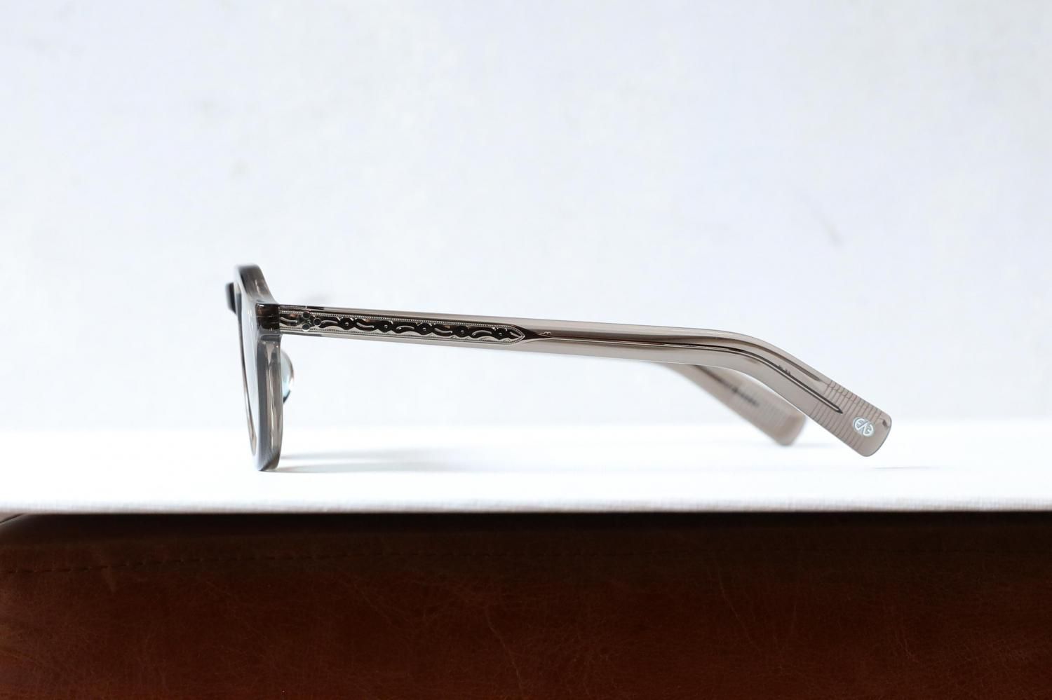 太さが際立つフロント、テンプル丁番は60sのデザインをオリジナルで再現し、製法も置き丁番でのカシメ技法を採用。