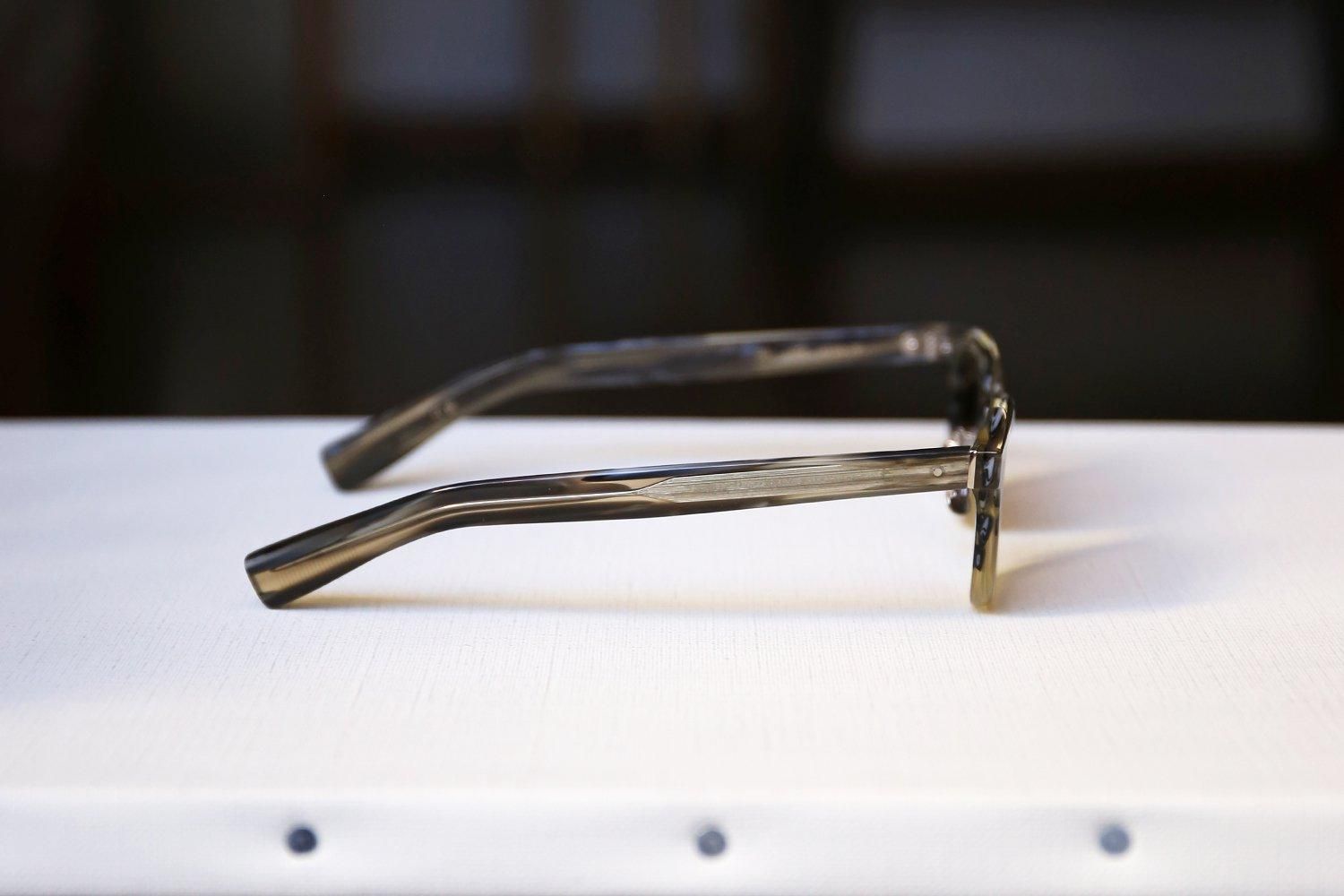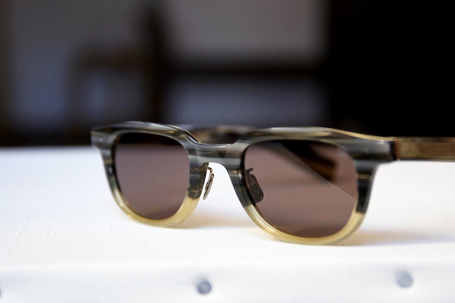 プラスチックフロント、テンプルをメタル丁番と一緒に磨き上げ、合口を綺麗に合わせたあとで丁番を低温メッキするという伝統的かつレアな技法を用いており、