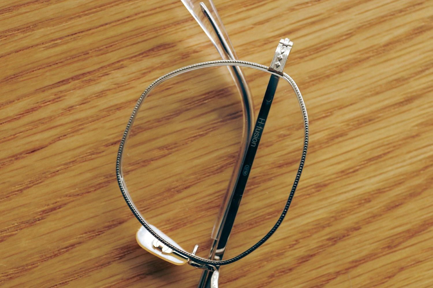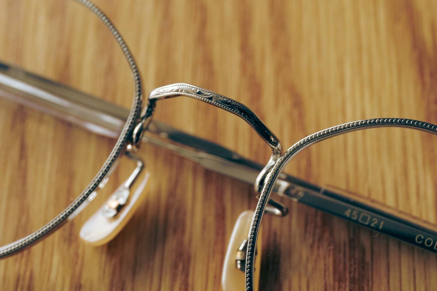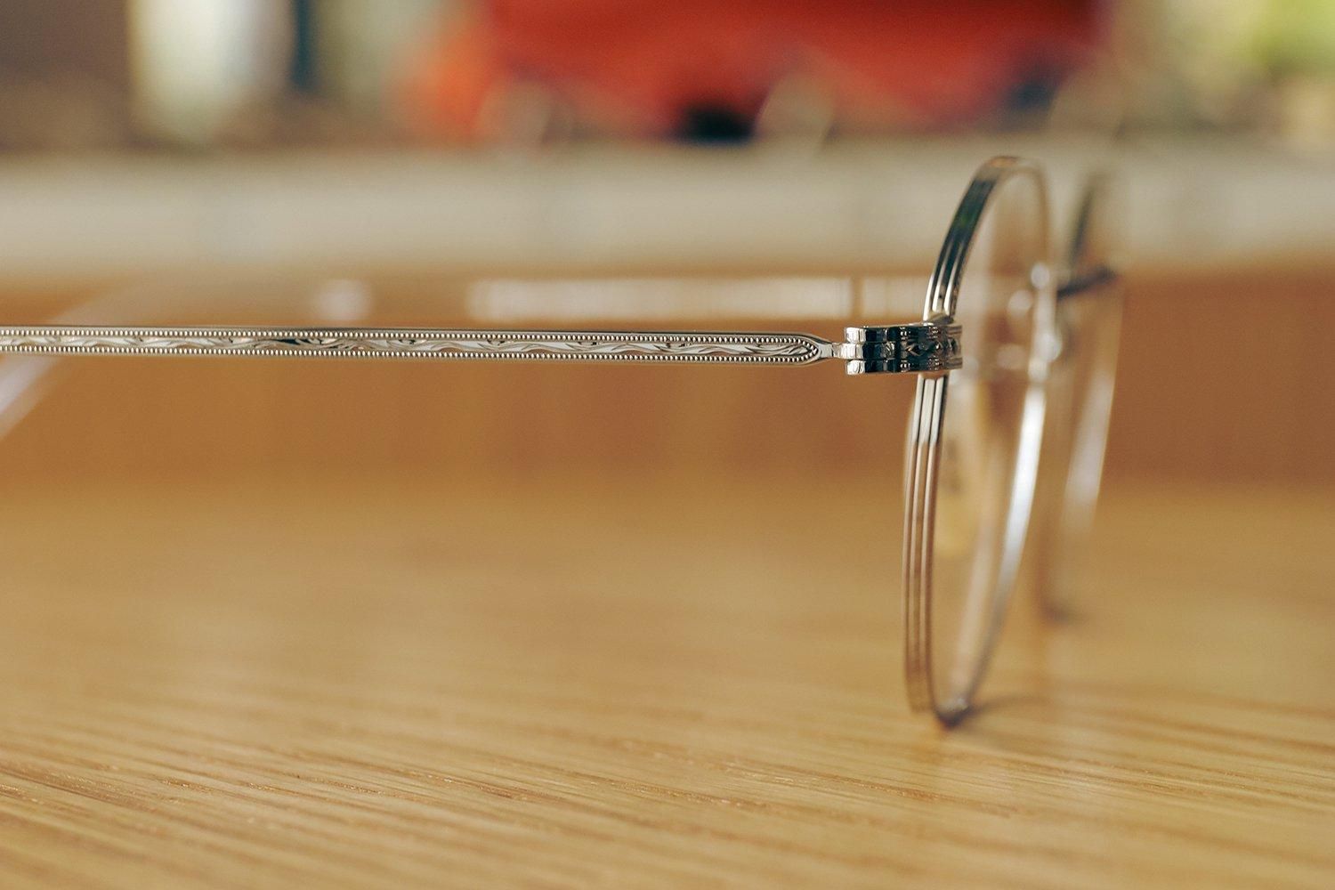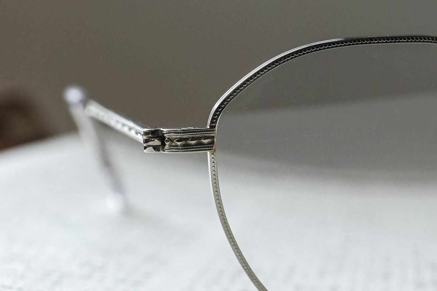 素材には、日本が誇る「サンプラチナ」を採用。シルバーのような落ち着いた光沢と優れた耐久性を持ち、リムやブリッジ、テンプルには繊細な彫金が施され、クラフトマンシップを感じさせる仕上がりに。ノーズパッドにはヴィンテージフレームを彷彿とさせる「ベークライト調」を採用し、クリアなテンプルエンドが軽やかな印象をプラスしている。