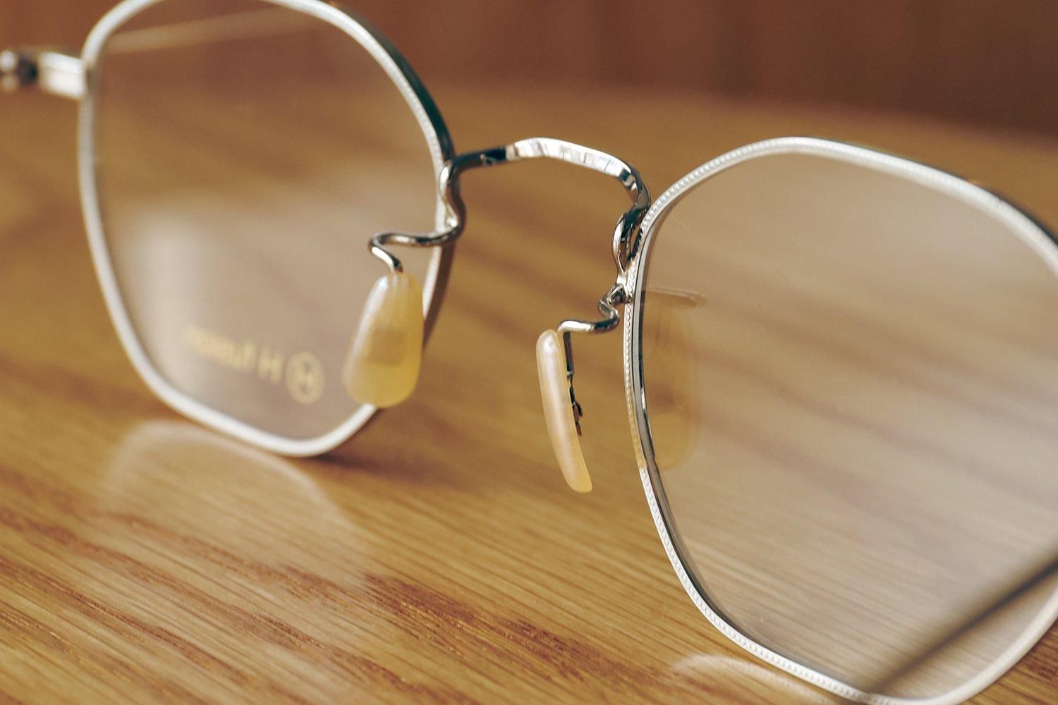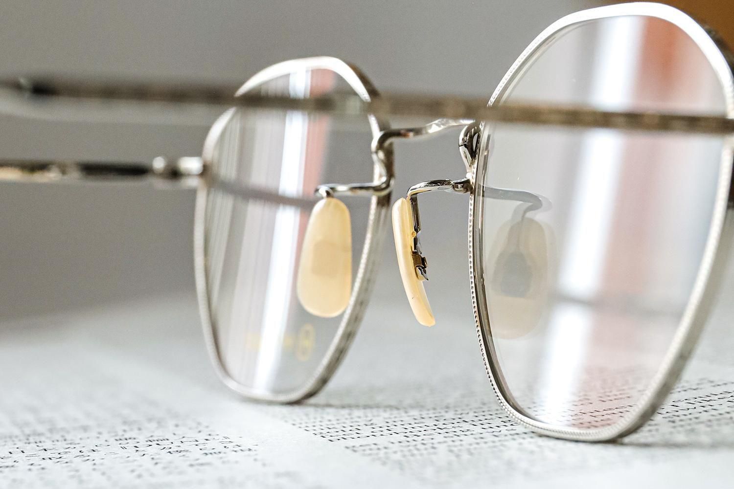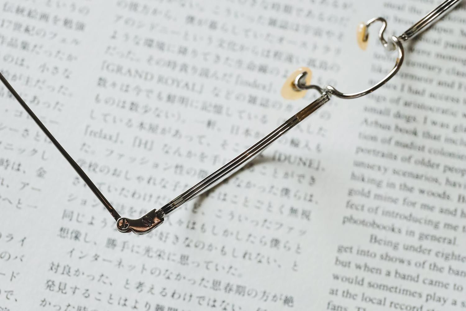 素材には、日本が誇る「サンプラチナ」を採用。シルバーのような落ち着いた光沢と優れた耐久性を持ち、リムやブリッジ、テンプルには繊細な彫金が施され、クラフトマンシップを感じさせる仕上がりに。ノーズパッドにはヴィンテージフレームを彷彿とさせる「ベークライト調」を採用し、クリアなテンプルエンドが軽やかな印象をプラスしている。