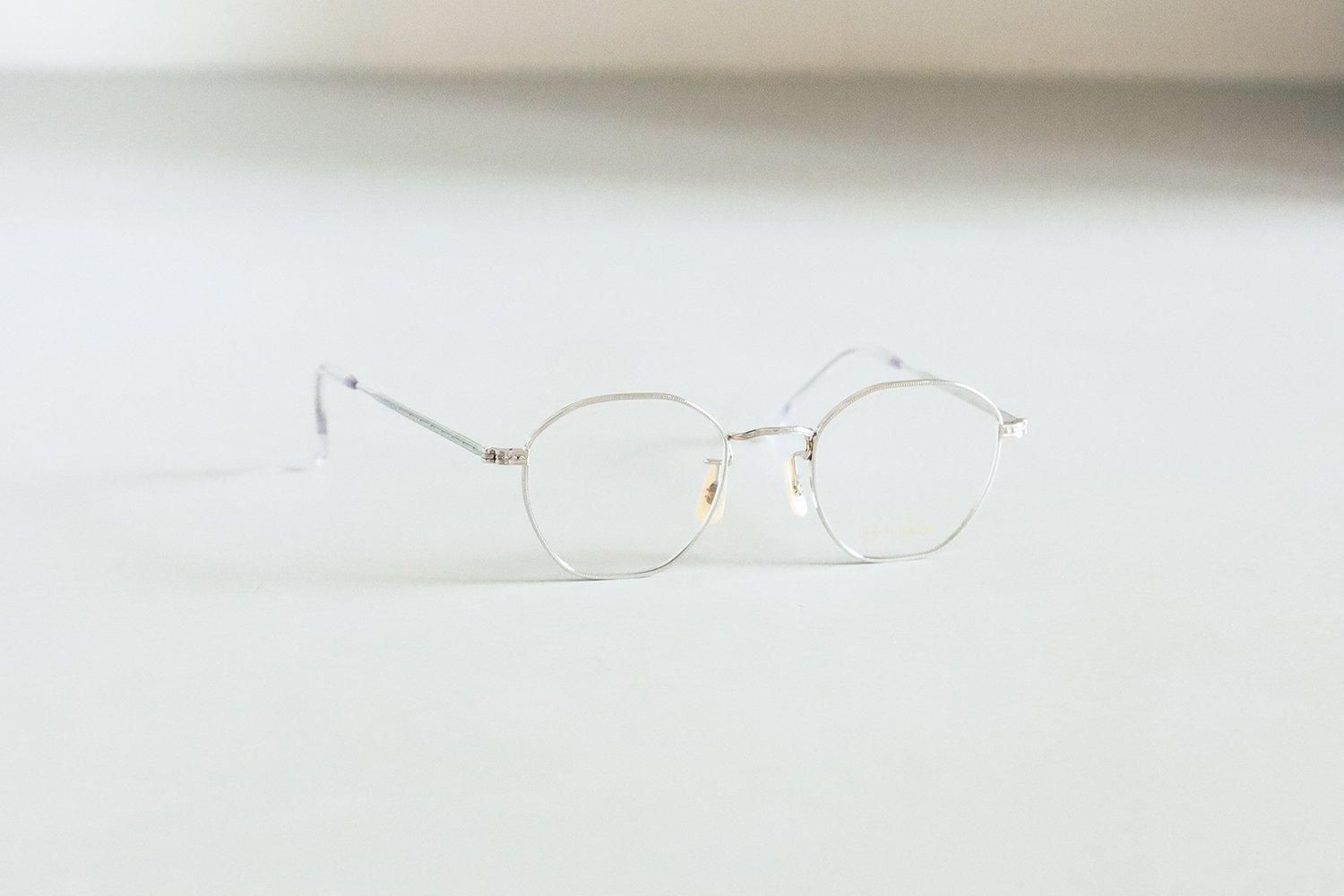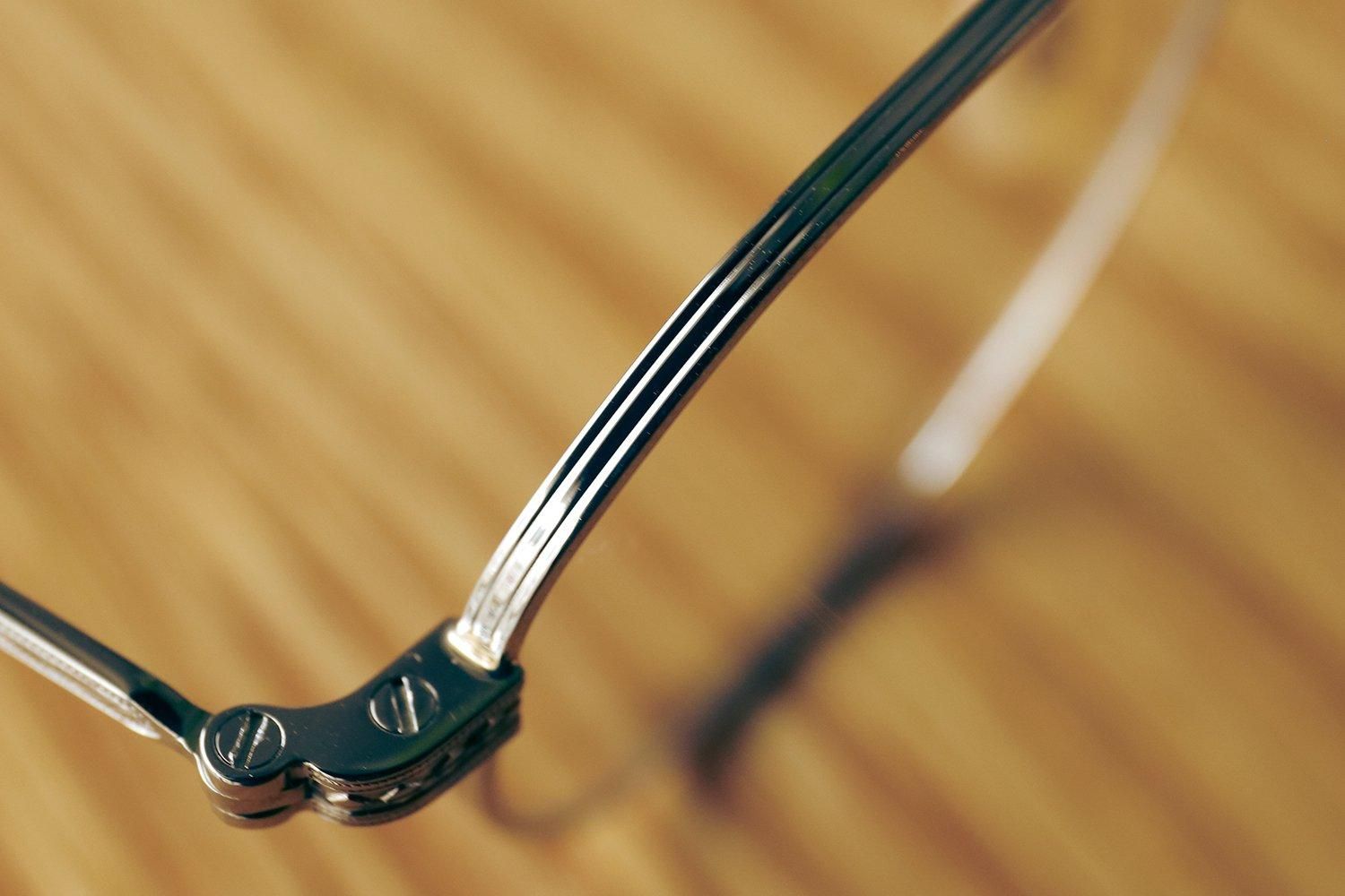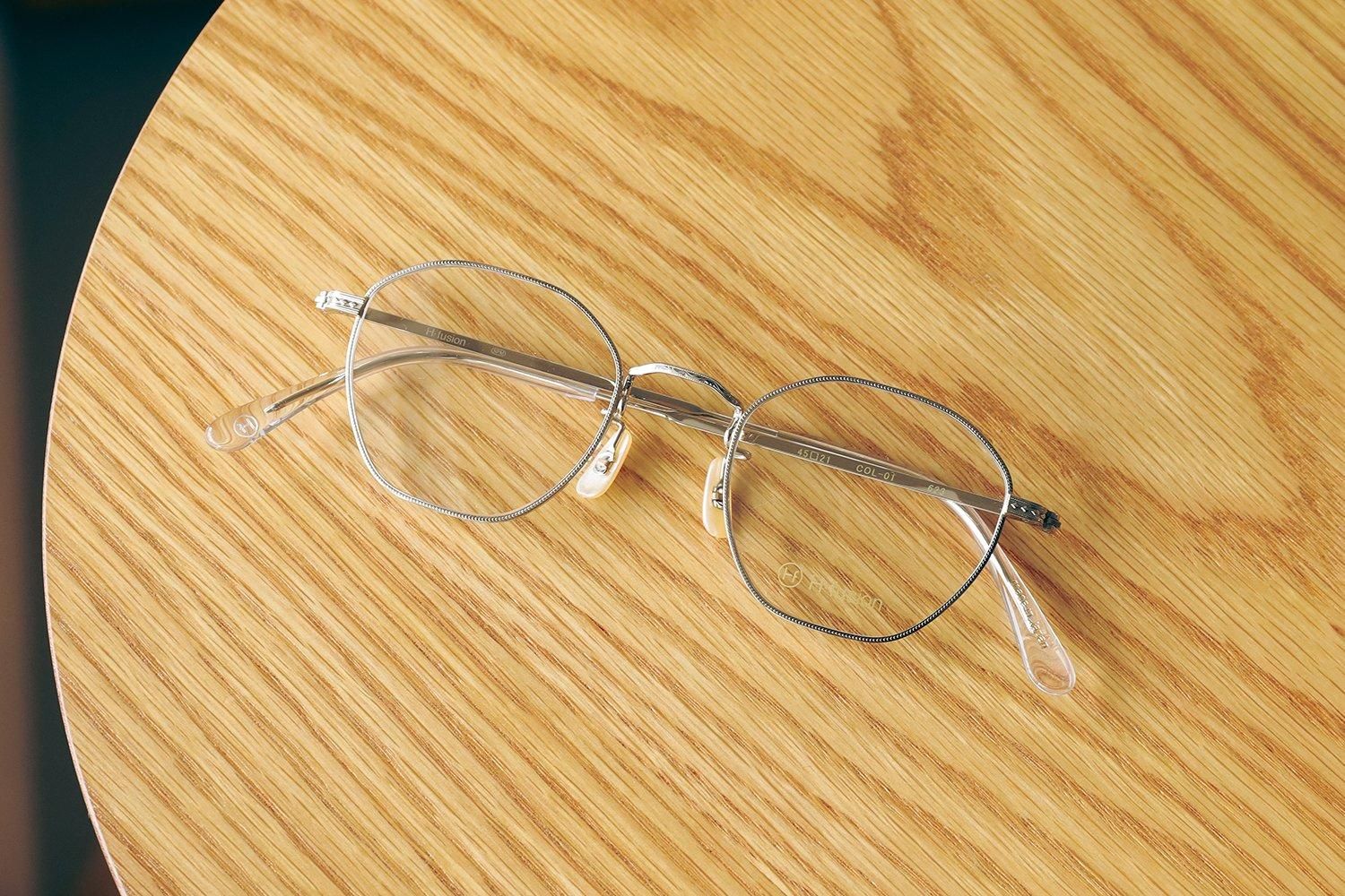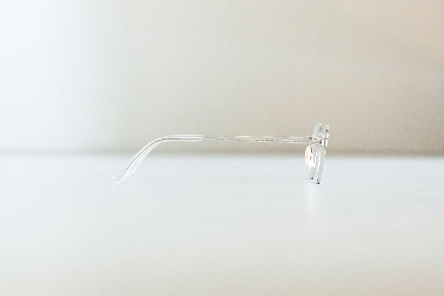 素材には、日本が誇る「サンプラチナ」を採用。シルバーのような落ち着いた光沢と優れた耐久性を持ち、リムやブリッジ、テンプルには繊細な彫金が施され、クラフトマンシップを感じさせる仕上がりに。ノーズパッドにはヴィンテージフレームを彷彿とさせる「ベークライト調」を採用し、クリアなテンプルエンドが軽やかな印象をプラスしている。