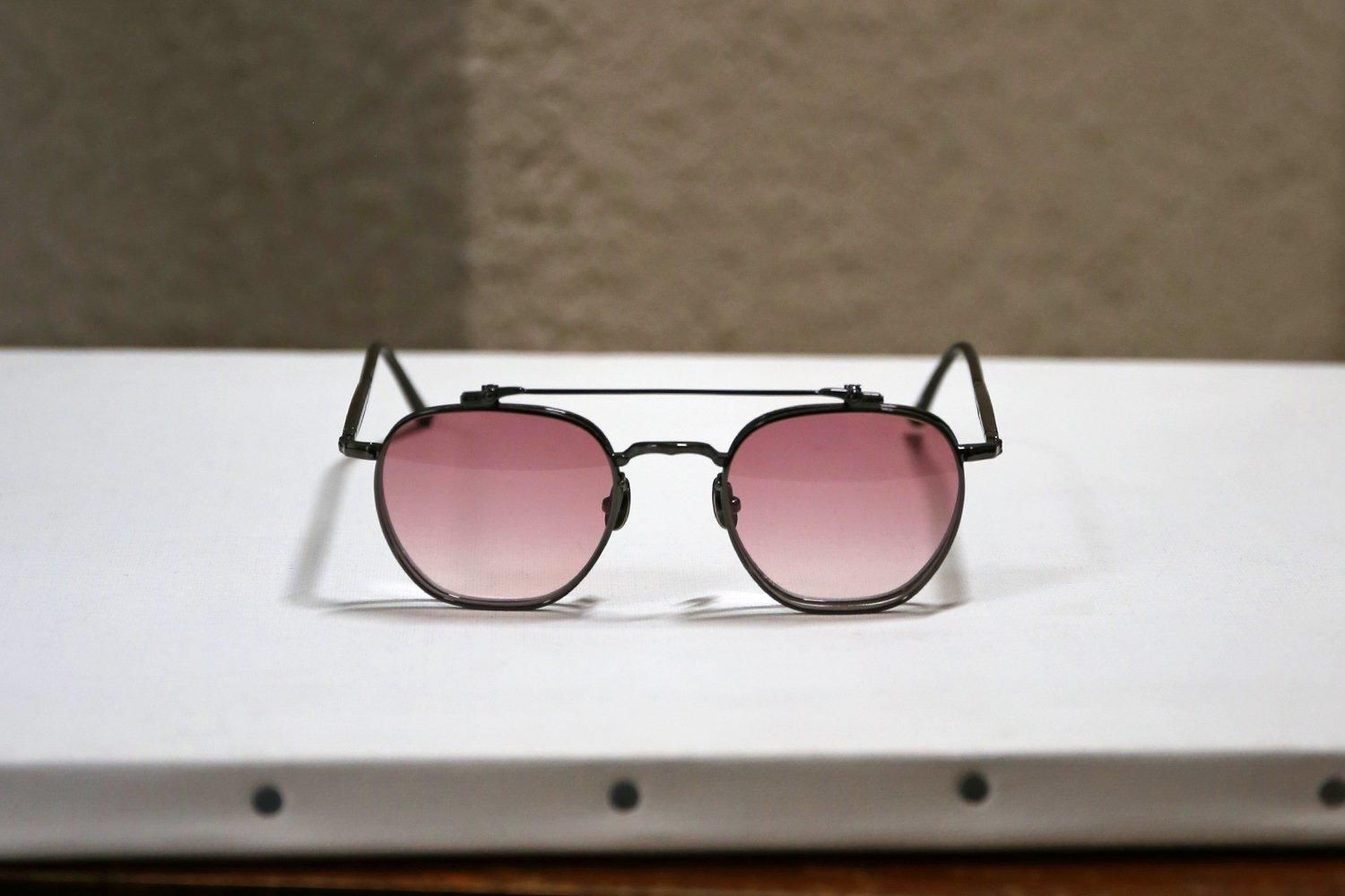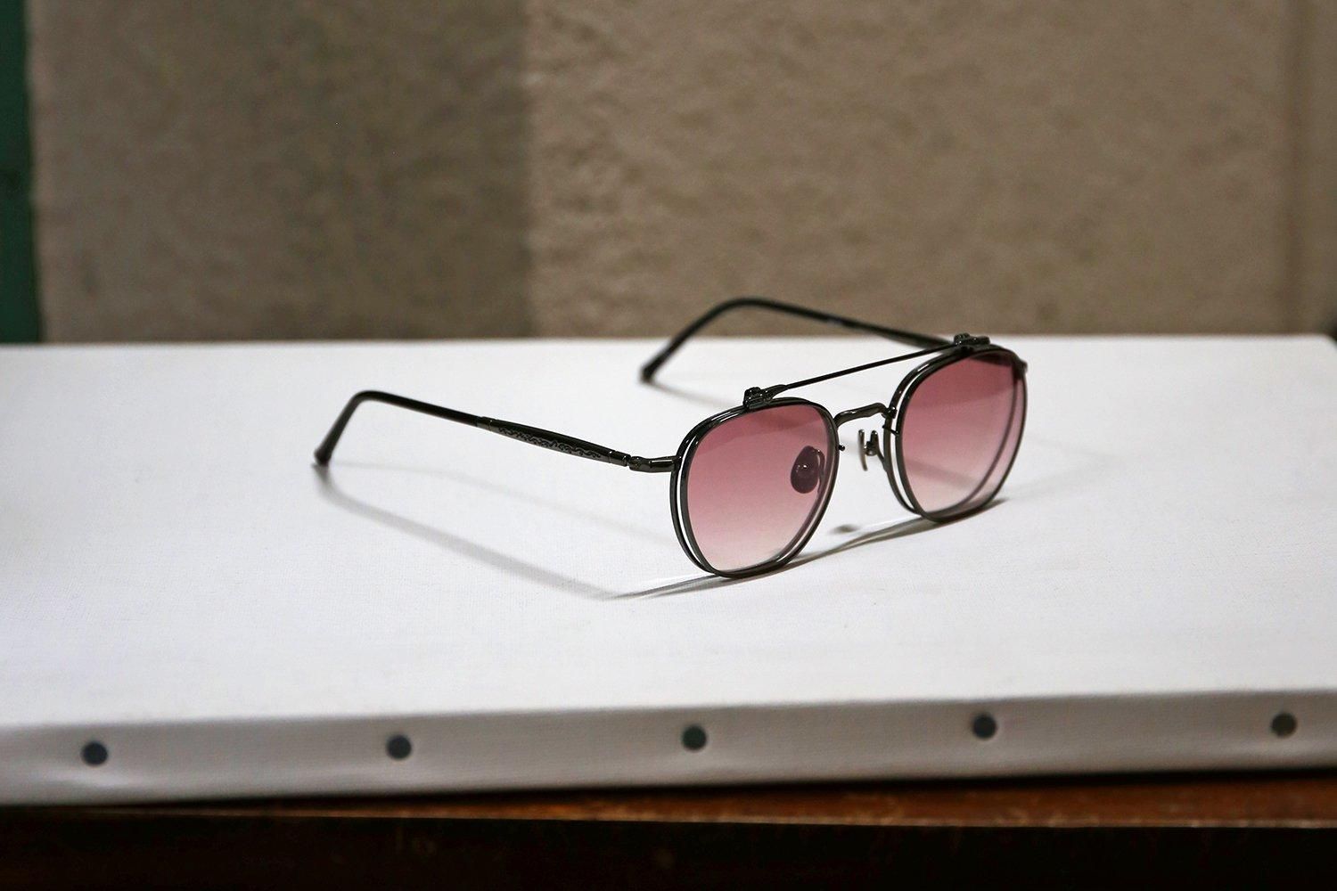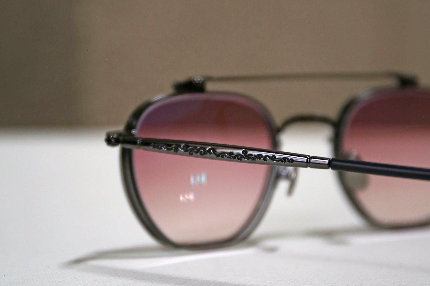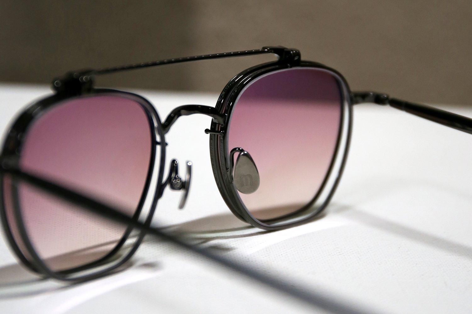 ローズカラーのグラデーションレンズを搭載したクリップオンは、下げた状態を一見するとツーブリッジのサングラス。