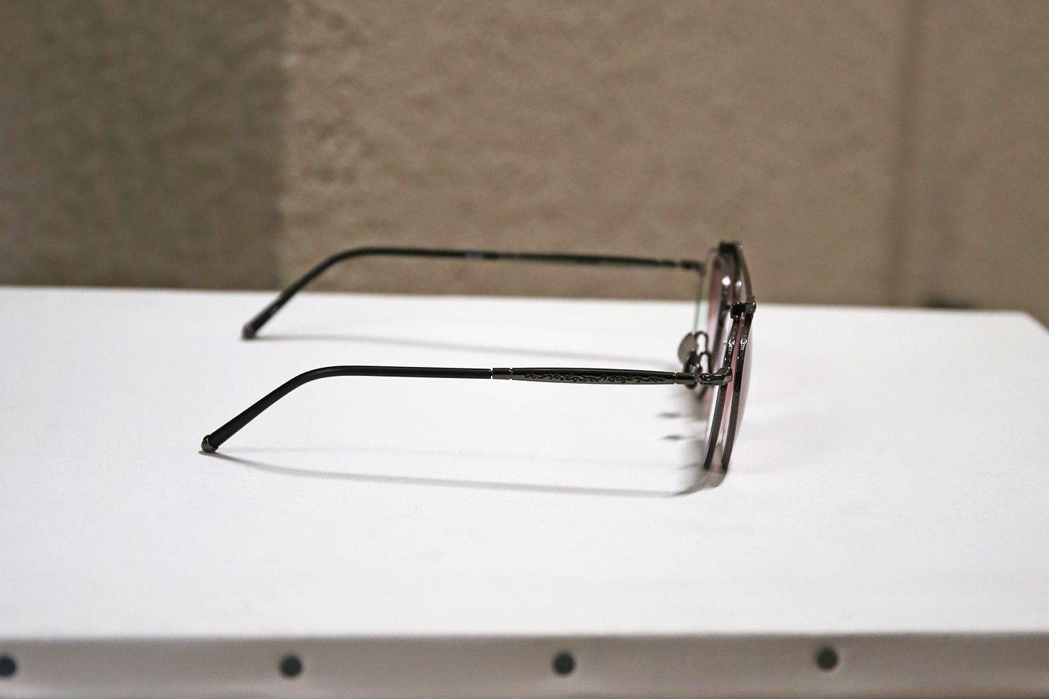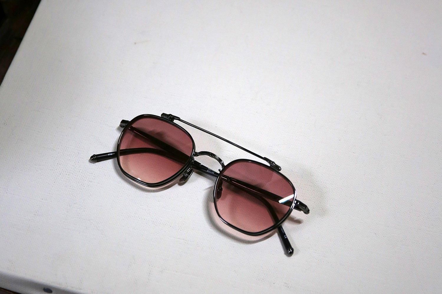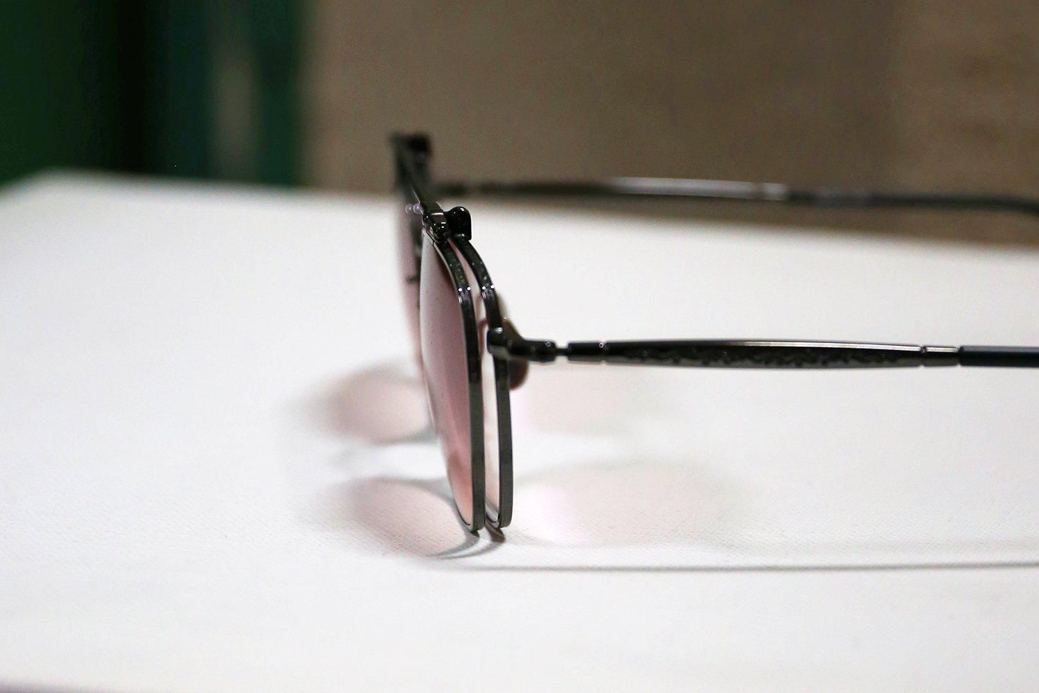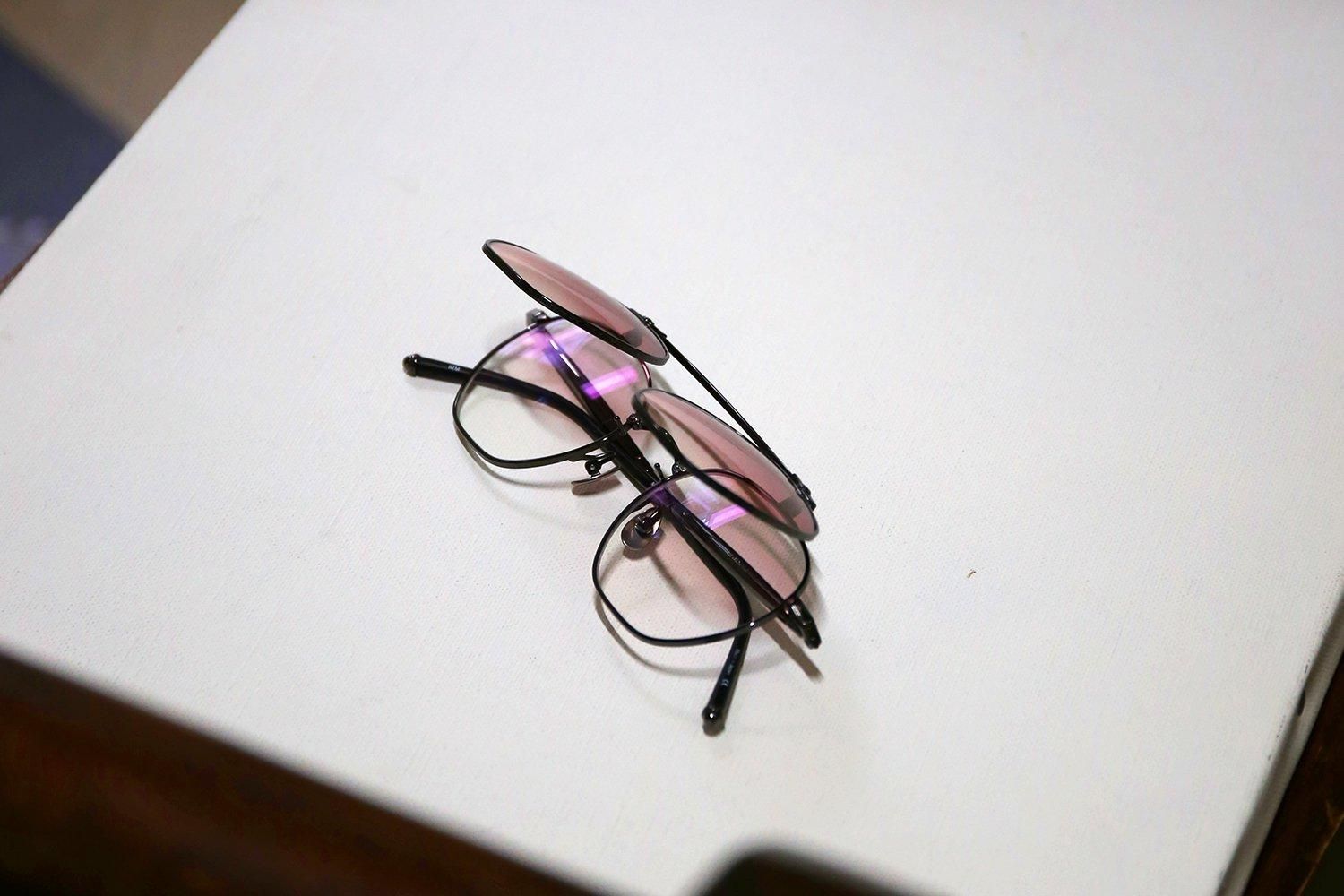 ローズカラーのグラデーションレンズを搭載したクリップオンは、下げた状態を一見するとツーブリッジのサングラス。