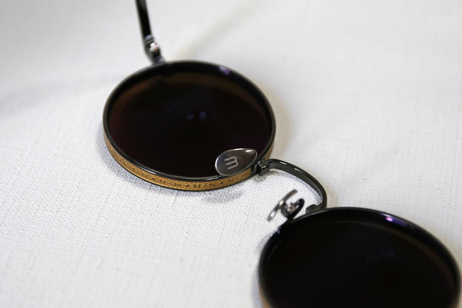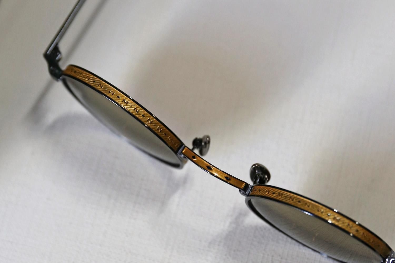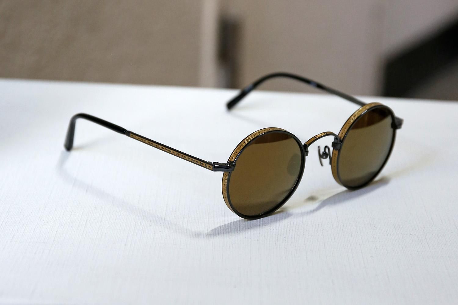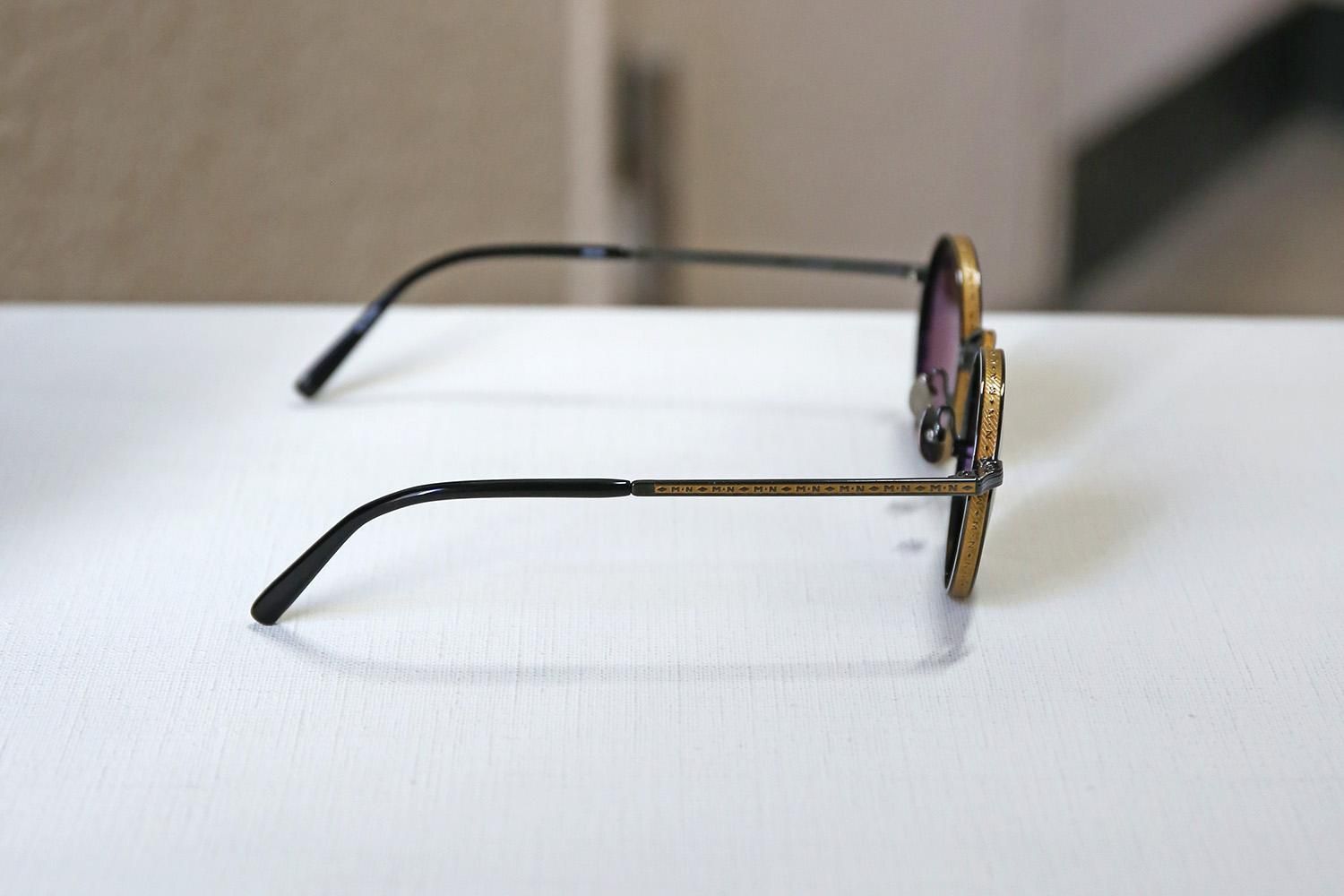 テンプルのモダンとの切り替え部分に至るまで同様に彫金の施された、職人技の光る珠玉のサングラス。