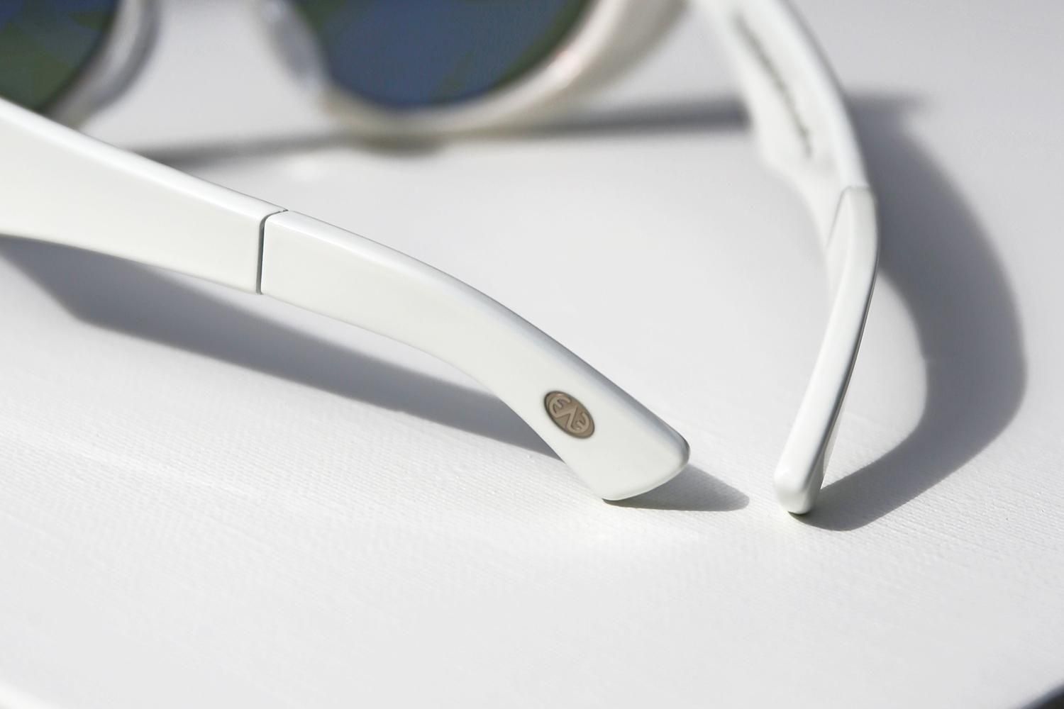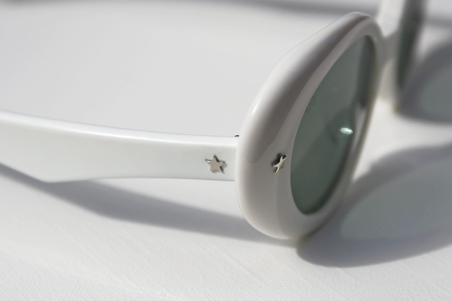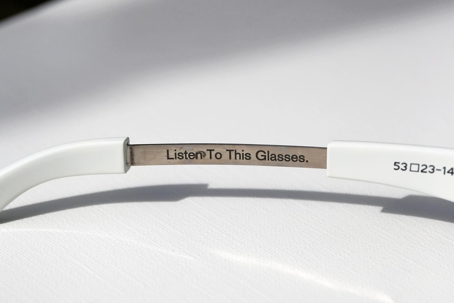 カシメ飾りのスターマークも特徴的だが、テンプルを伸ばしてヘッドホンのように首に掛けられる仕様になっているのが非常にユニーク。