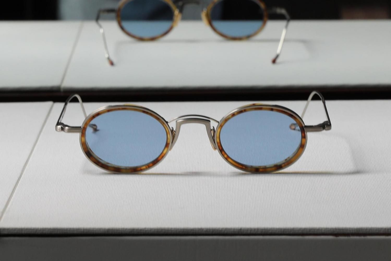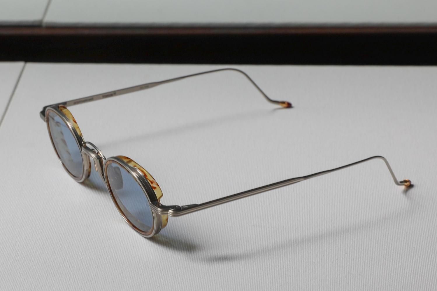 col, Cairo / Ceruleanは淡いアンティークシルバーを基調にしたシックで落ち着きのあるカラー。レンズはややブルーがかったグレーです。ナチュラルな透け感がありながら、目元に透明感と静かなクールさを添えてくれます。間に入ったインナーリムのべっ甲柄がアクセントになり、三層のコントラストが美しい一本です。