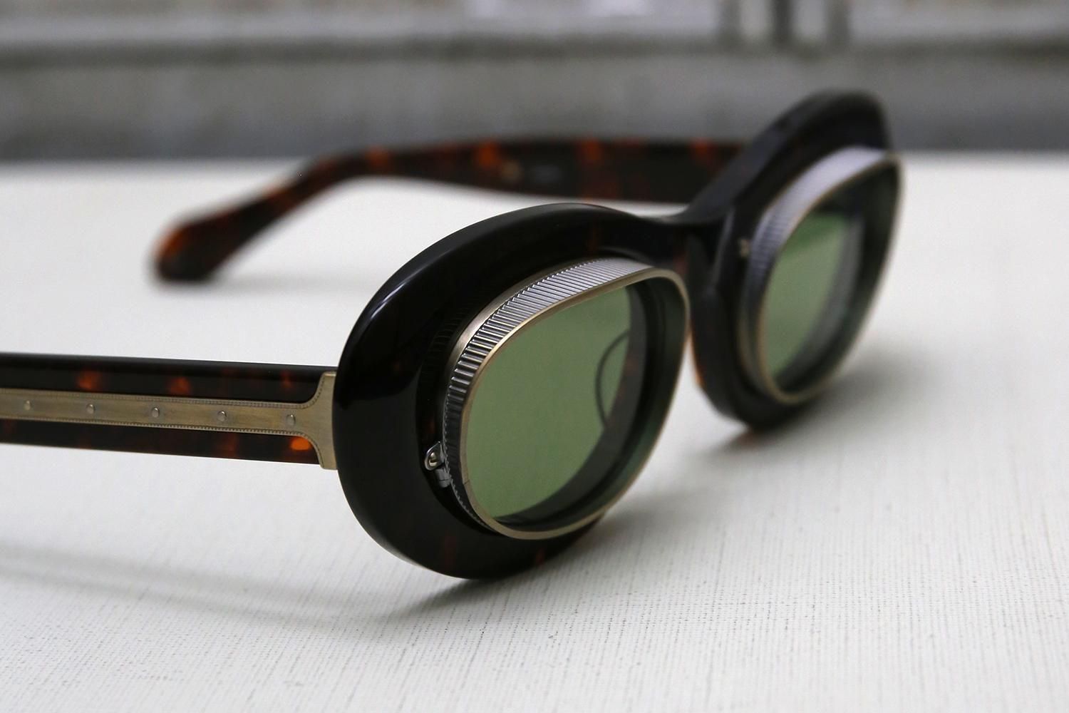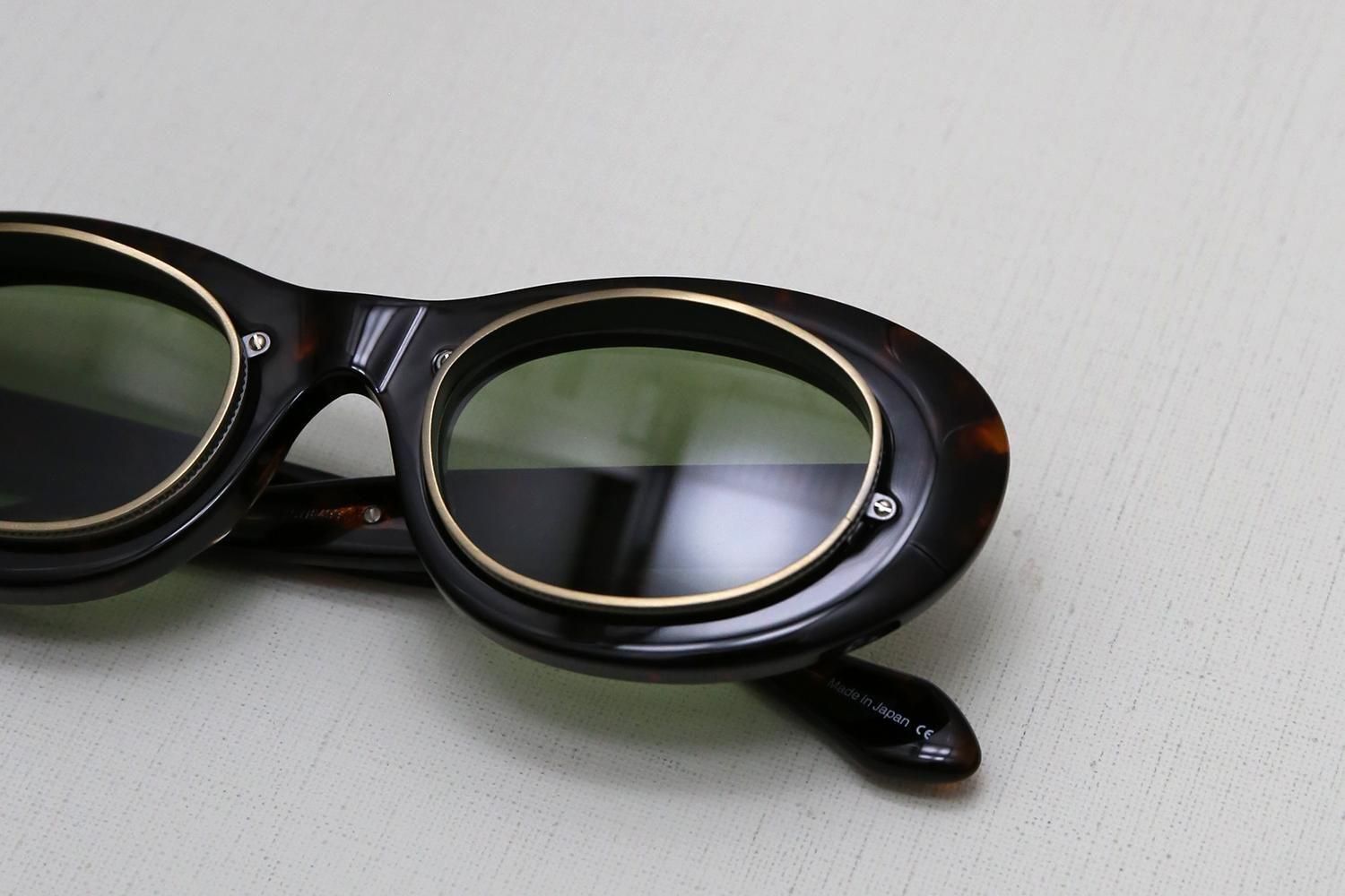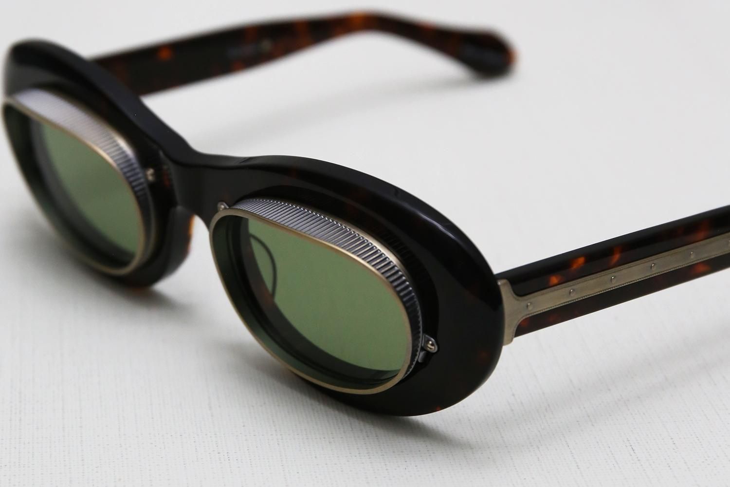 MATSUDAの得意とするメタルパーツのサンシェードをぐるっと一周回すことでゴーグル感を強め、アセテート生地の周りはエッジを効かせず、レンズ部分にインパクトを注いだアバンギャルドな一本。