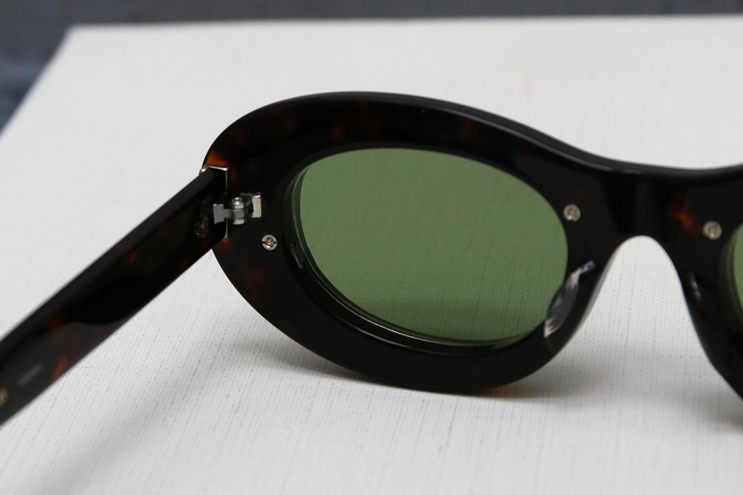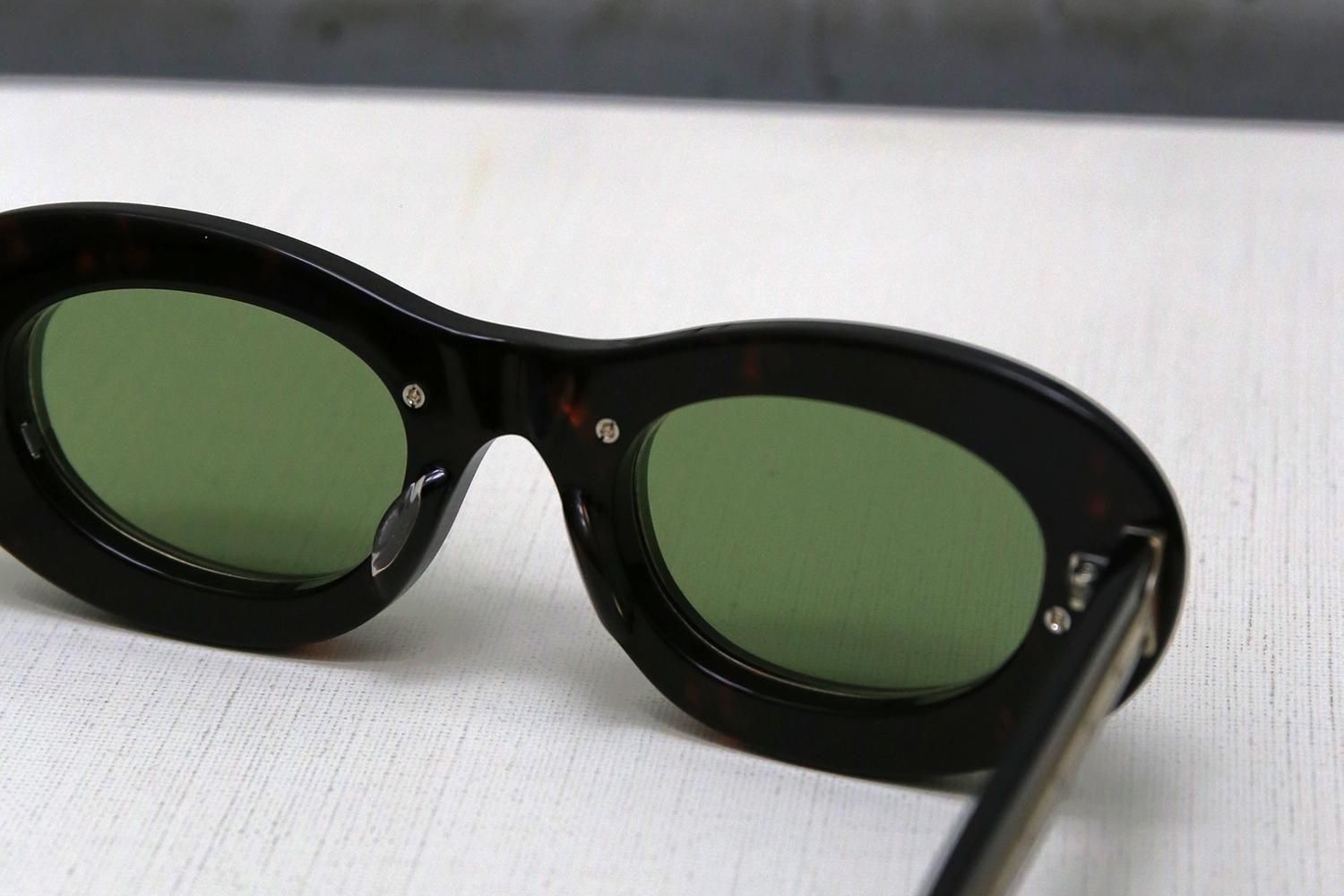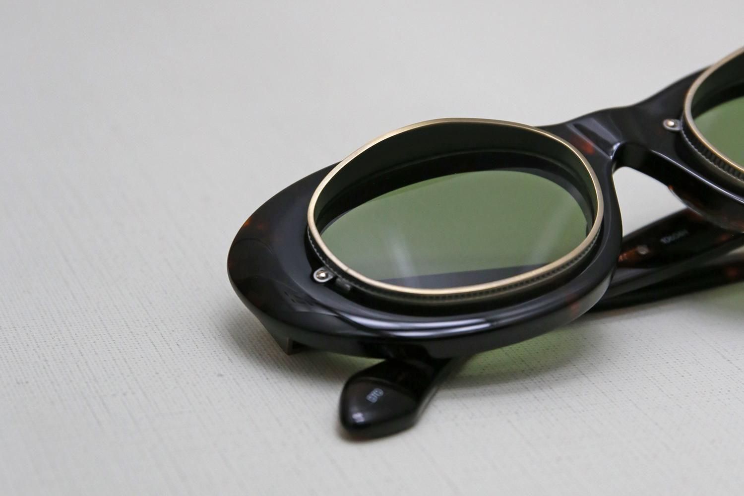 MATSUDAの得意とするメタルパーツのサンシェードをぐるっと一周回すことでゴーグル感を強め、アセテート生地の周りはエッジを効かせず、レンズ部分にインパクトを注いだアバンギャルドな一本。