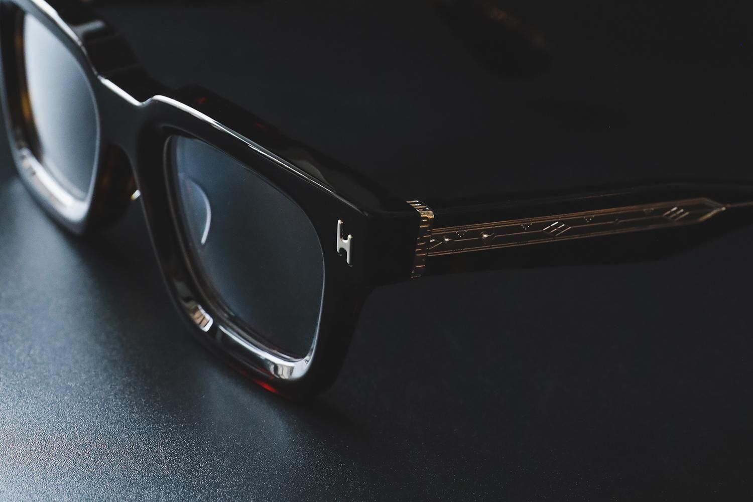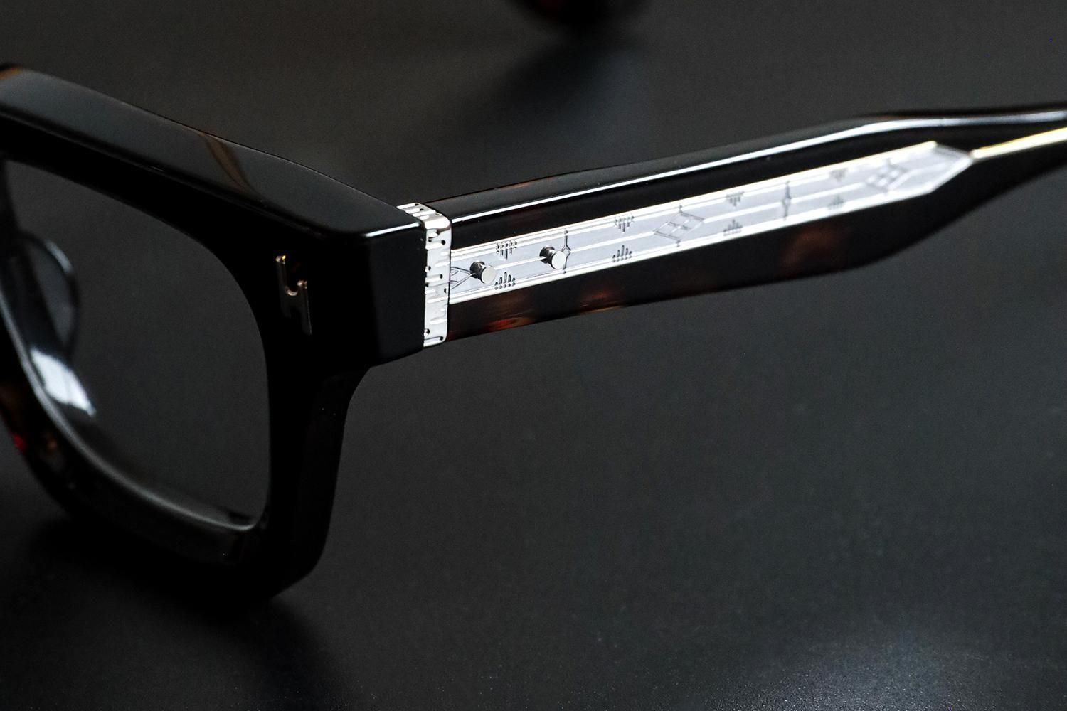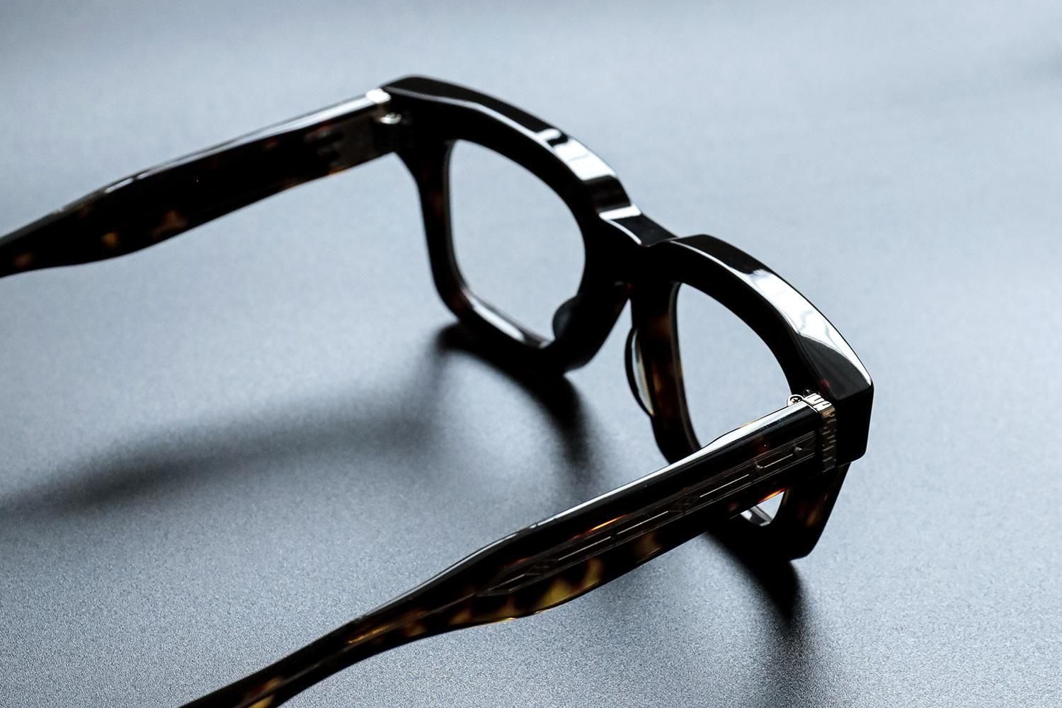 極太のテンプルを支える7枚蝶番仕上げ。