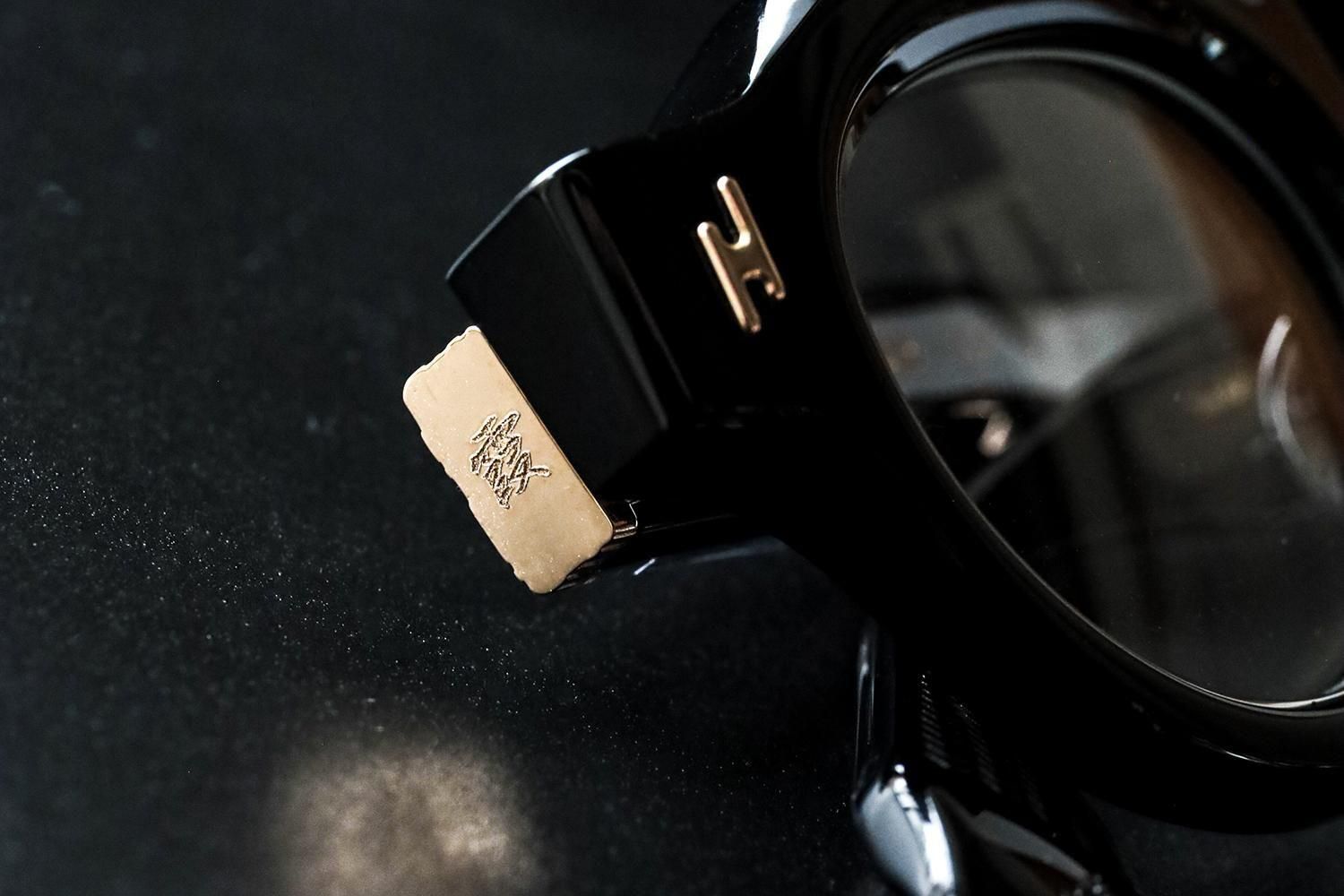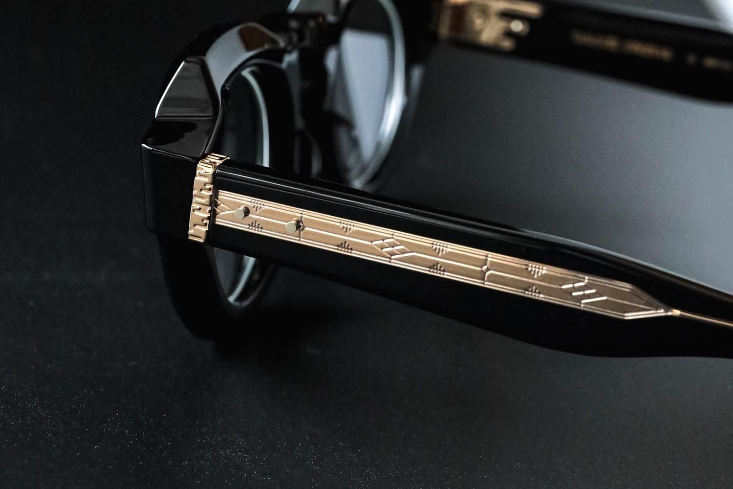 「永遠」を意味する吉祥文様の霞柄のカシメと極太のテンプルを支える7枚蝶番仕上げ。