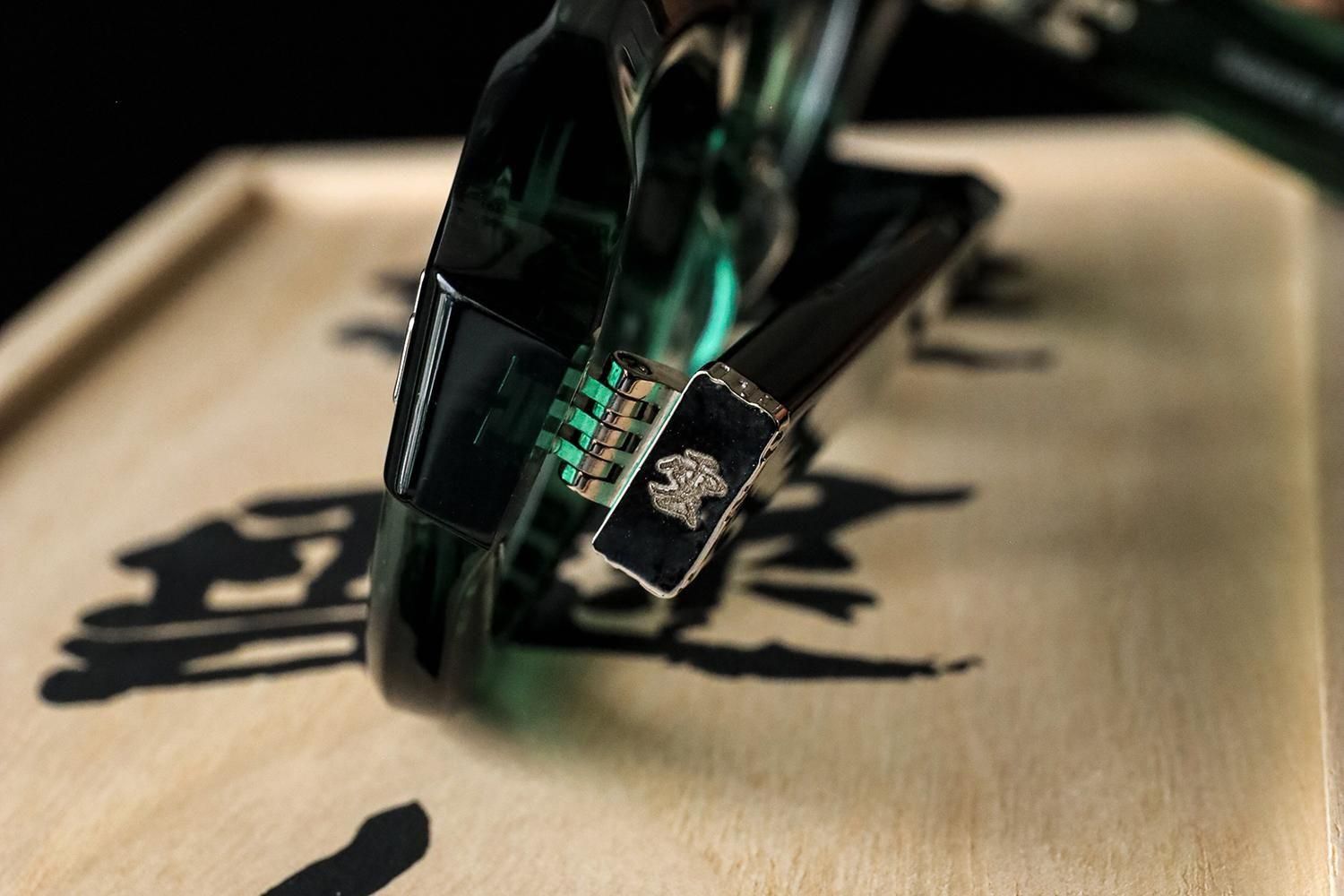 「永遠」を意味する吉祥文様の霞柄のカシメと極太のテンプルを支える7枚蝶番仕上げ。