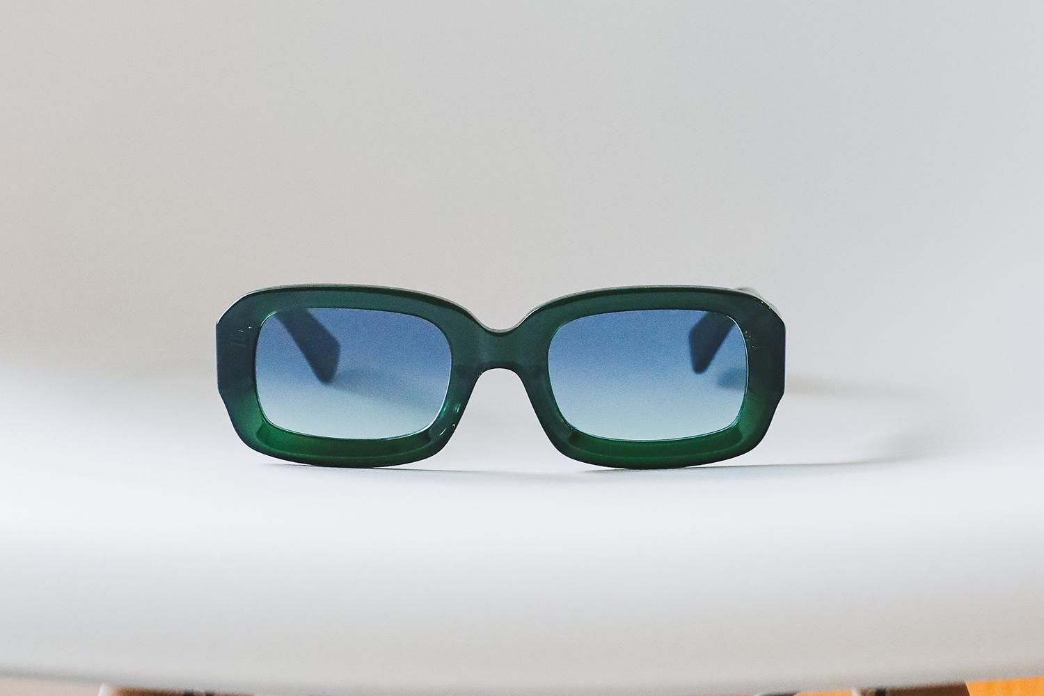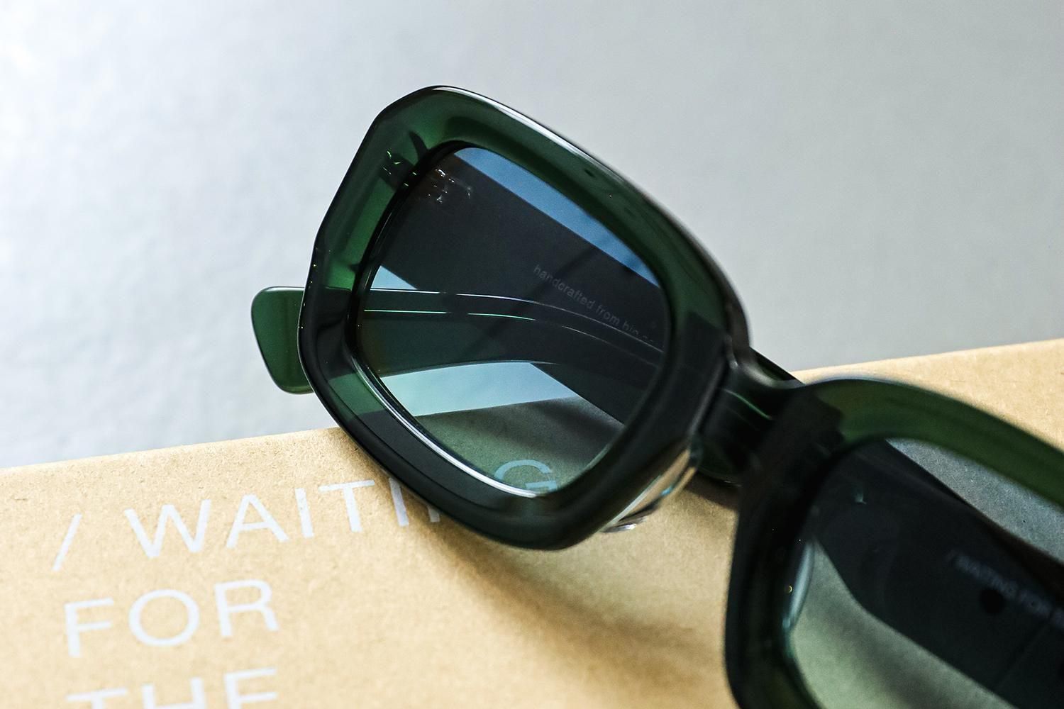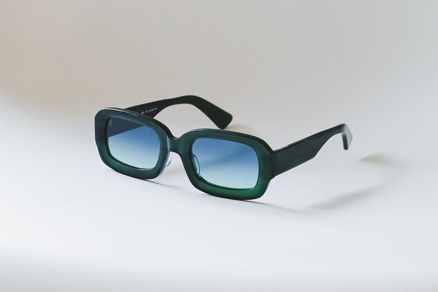 一方、深みのあるグリーンは、ブルーグラデーションレンズとの掛け合わせで都会的なクールさを演出。