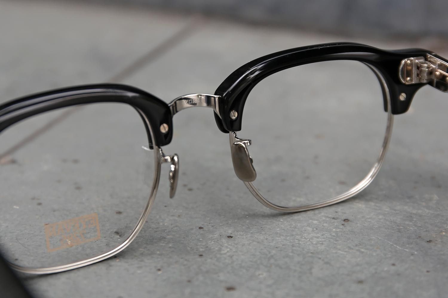 「649」の最大の特徴は、その絶妙なバランス感にあります。重厚感のあるアセテート製のブロウラインと、繊細なメタルリムのコンビネーションは、お顔に立体感を与えながらも、決して主張しすぎることなく、上品な印象を演出します。