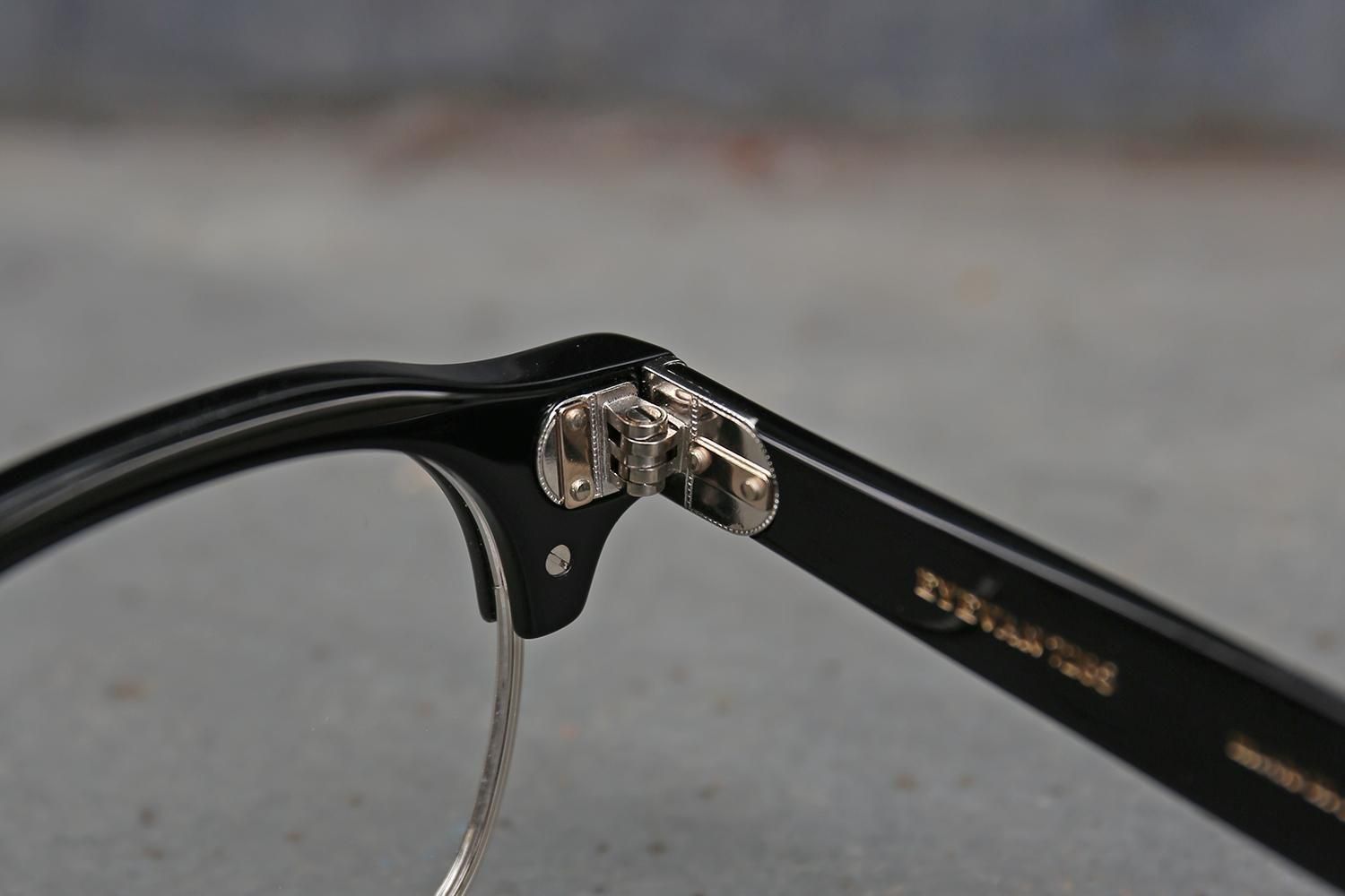 特筆すべきは、ブランドの徹底したこだわりが光る丁番(ちょうばん)部分の美しいカシメデザインです。この特徴的な意匠は、単なる装飾に留まりません。実は、ミリタリーバッグや軍パンのチャックといった、過酷な環境下での使用に耐えうる機能性と堅牢さを追求したディテールから着想を得ています。実用的な美しさと、確かな強度を両立させるEYEVAN 7285ならではのアプローチが、このフレームに唯一無二の個性を与えています。