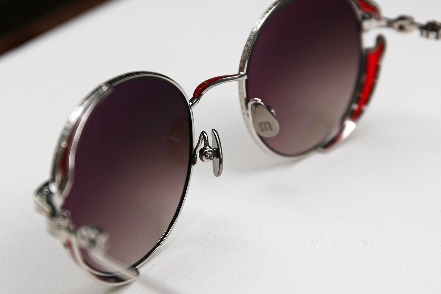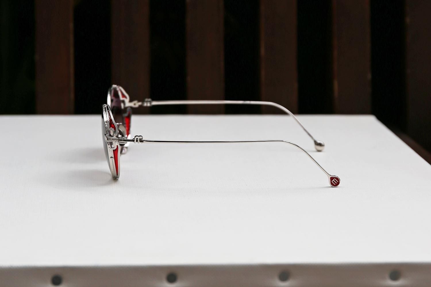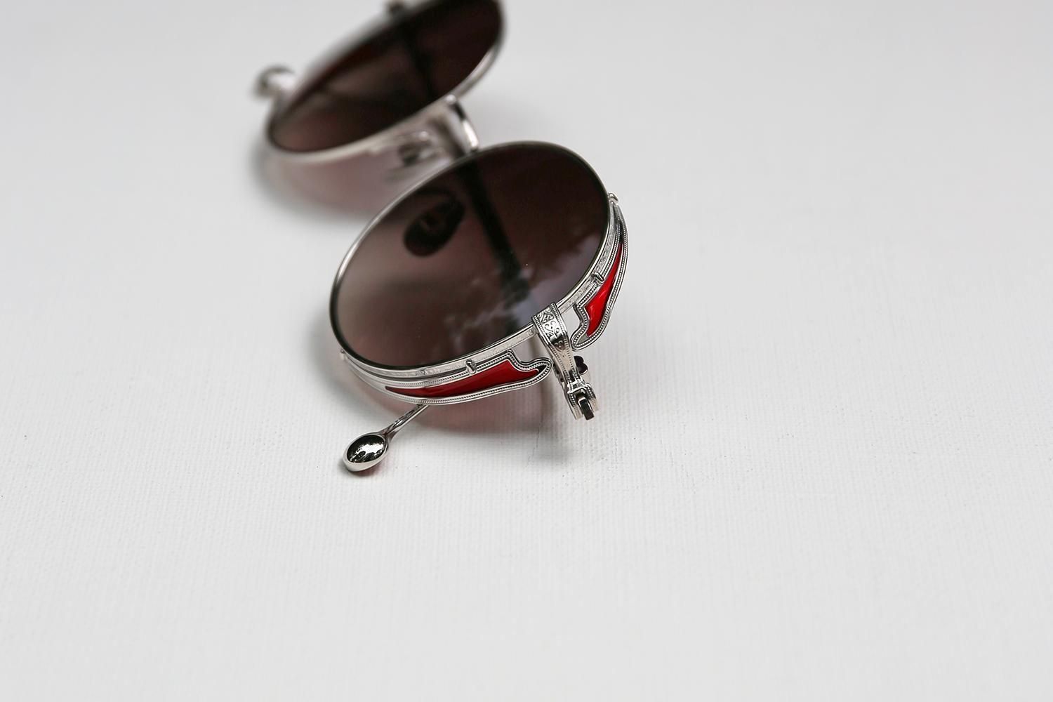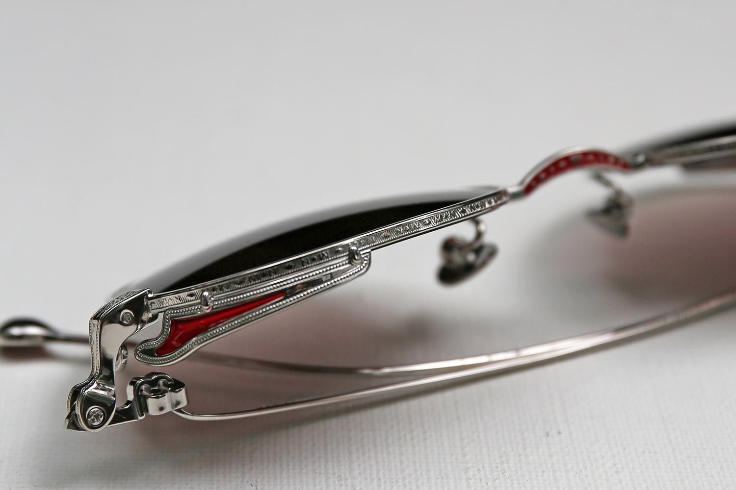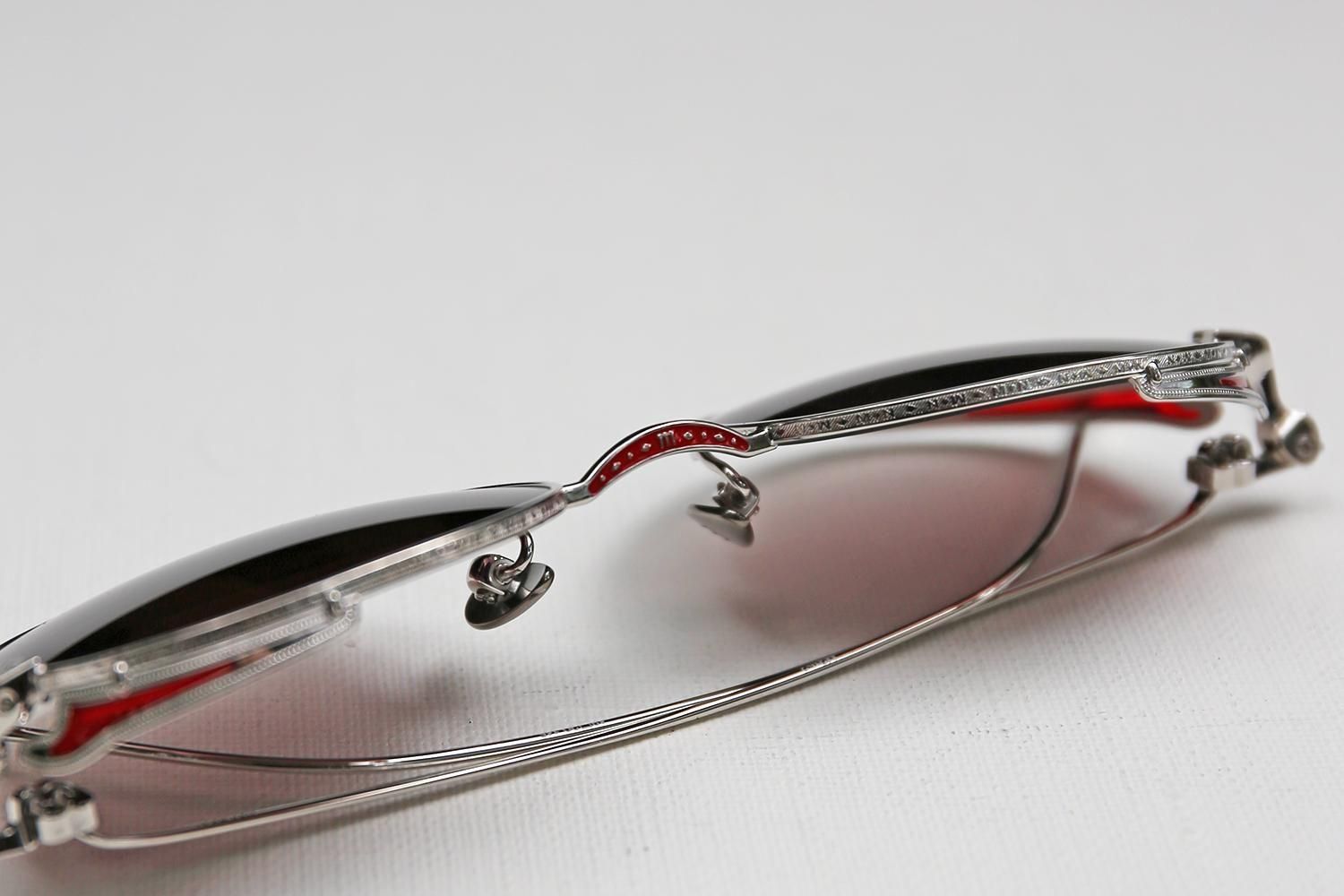 細部にまで妥協のない、遊び心と芸術性が凝縮されたデザインです。職人の手作業によって施された緻密な彫金と、鮮やかなエナメルカラーのコントラストが、メタルフレームの硬質なイメージに温かみと個性を加えていきます。