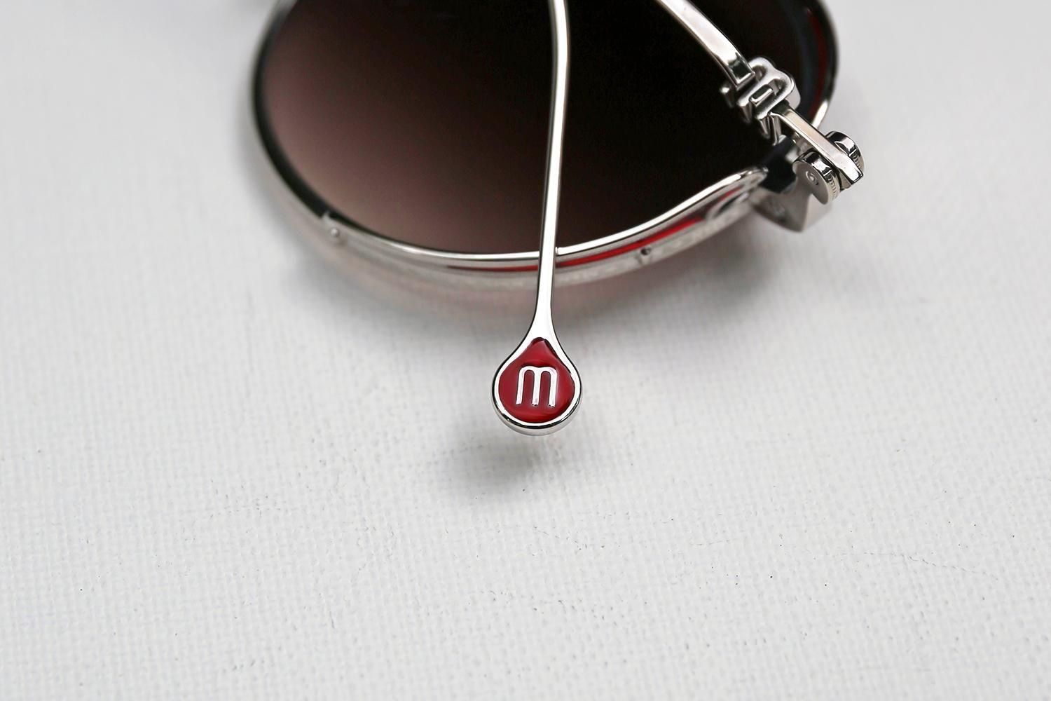 さらに注目すべきは、丁番部分に施された、アール・ヌーヴォーを思わせる流麗なハート型の彫金と、そのすぐそばに組み込まれたブランドの象徴である「m」のテンプルデザイン。