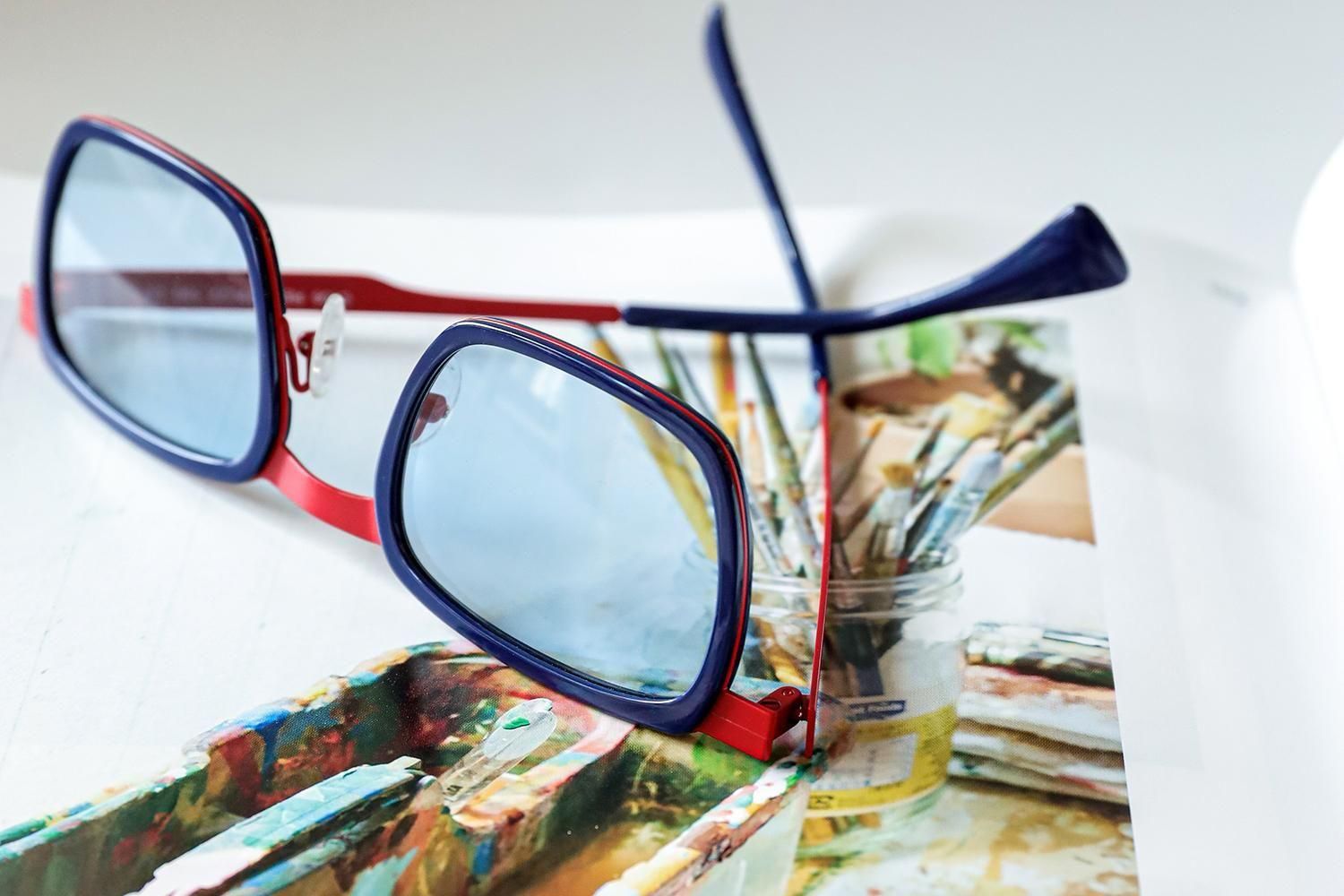 ネイビーとレッドの大胆配色に、ふわっと淡いブルーレンズ。