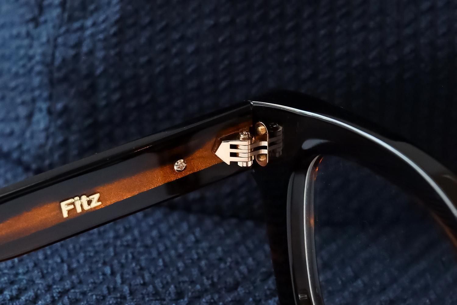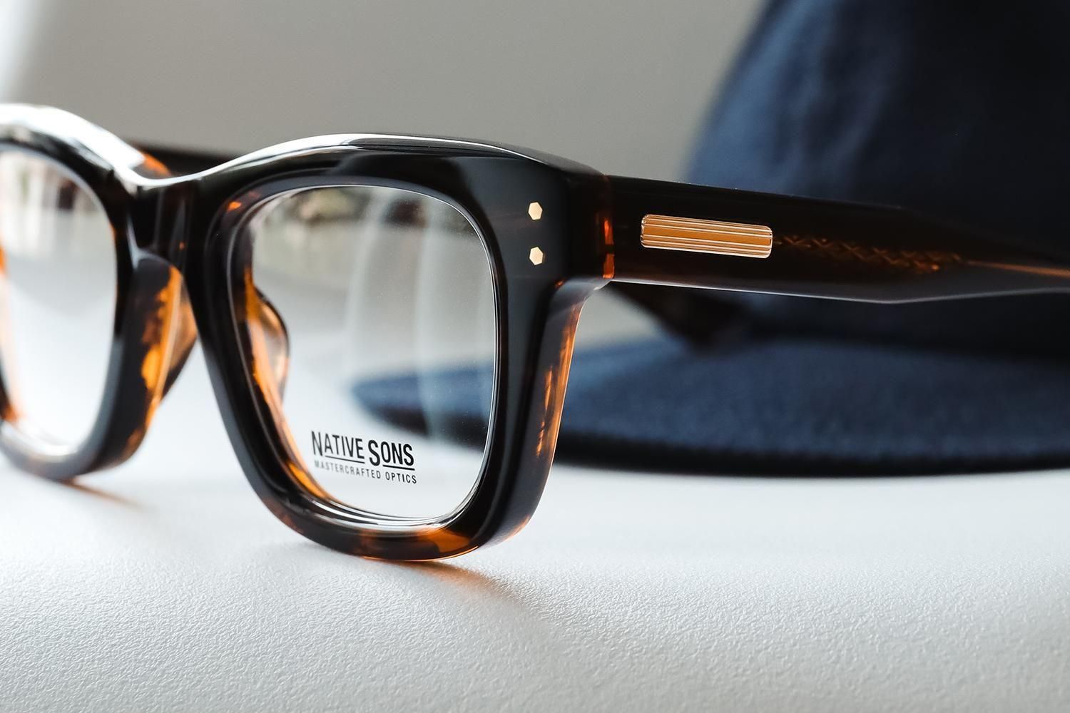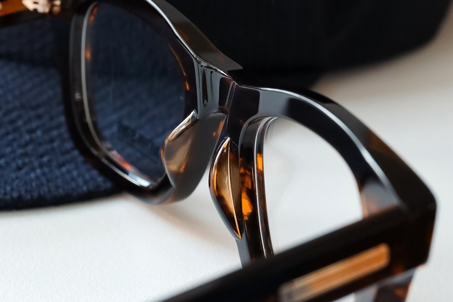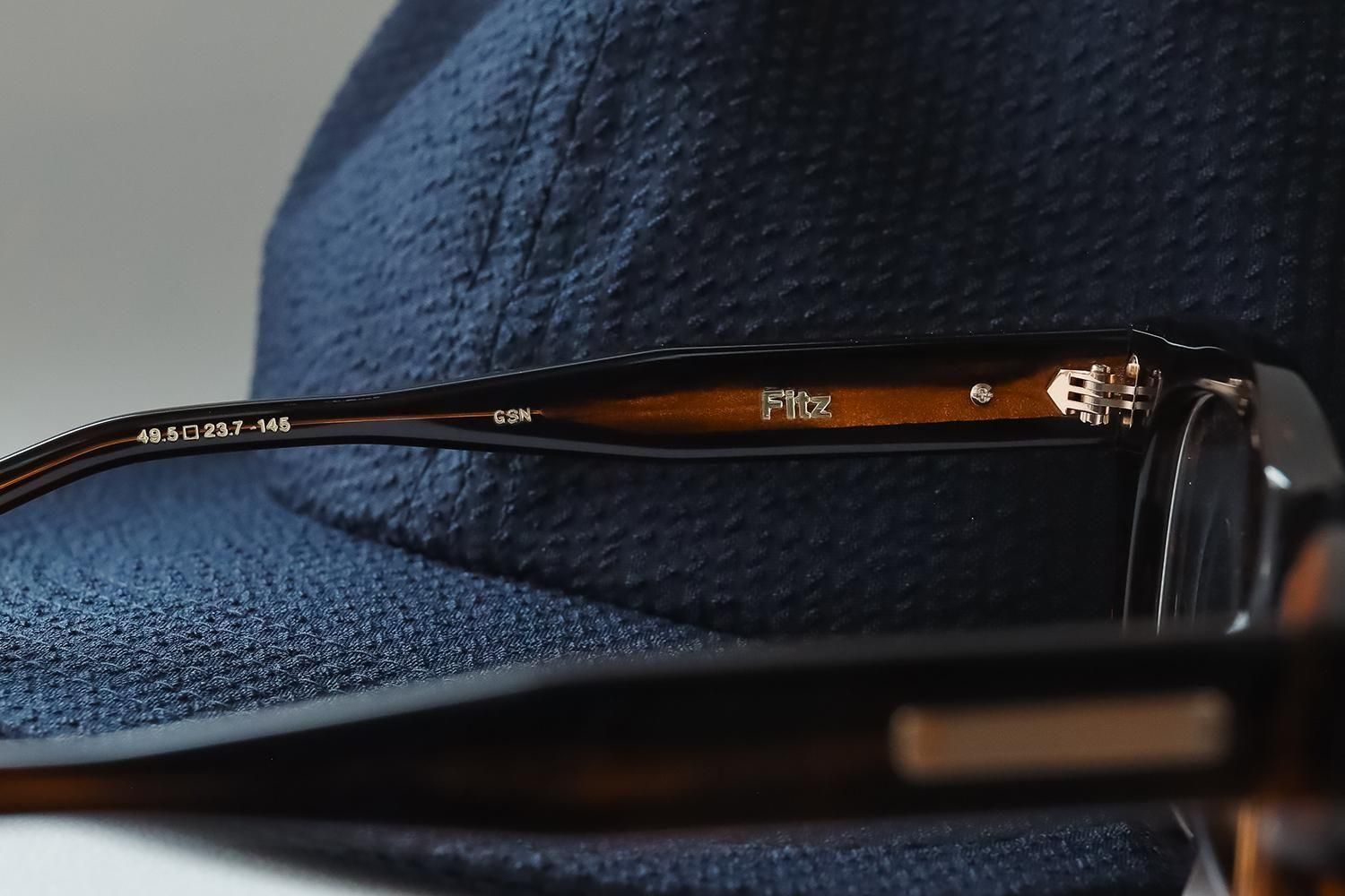 テンプルの金属プレートは光の角度で表情が浮かび、どこか工業的で無骨なムードを添えます。