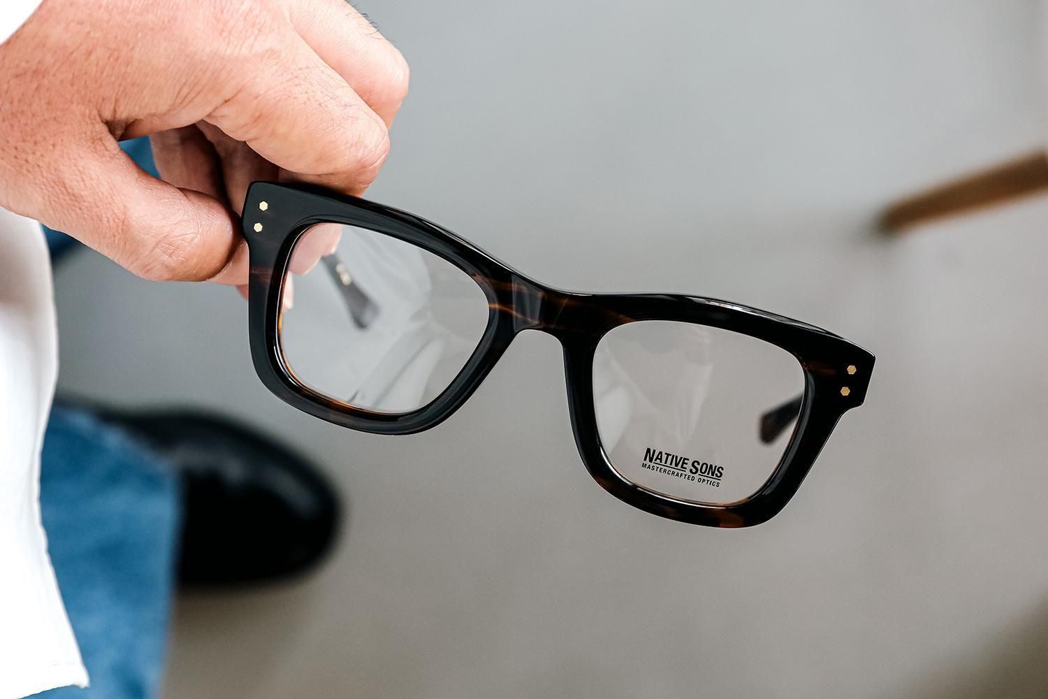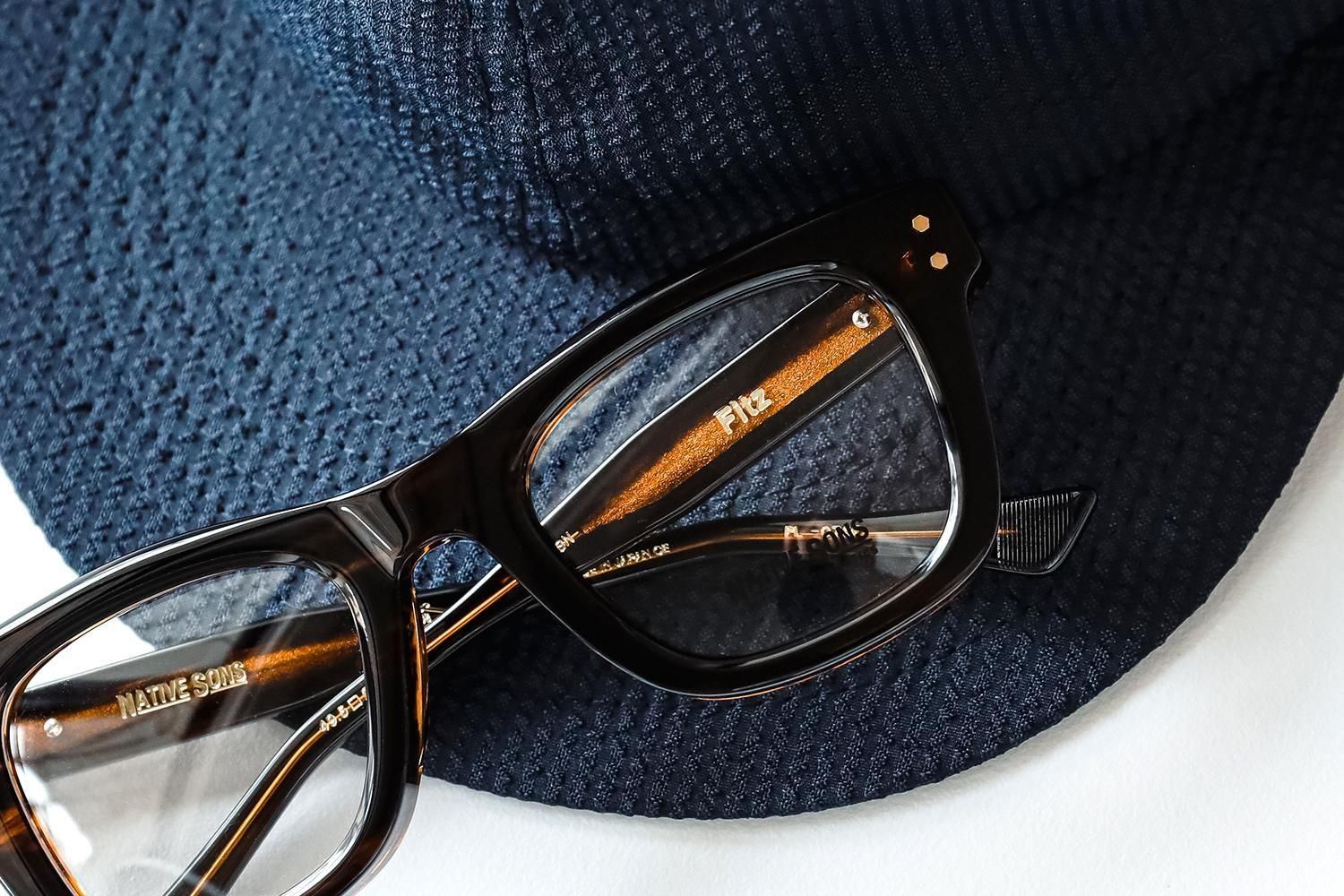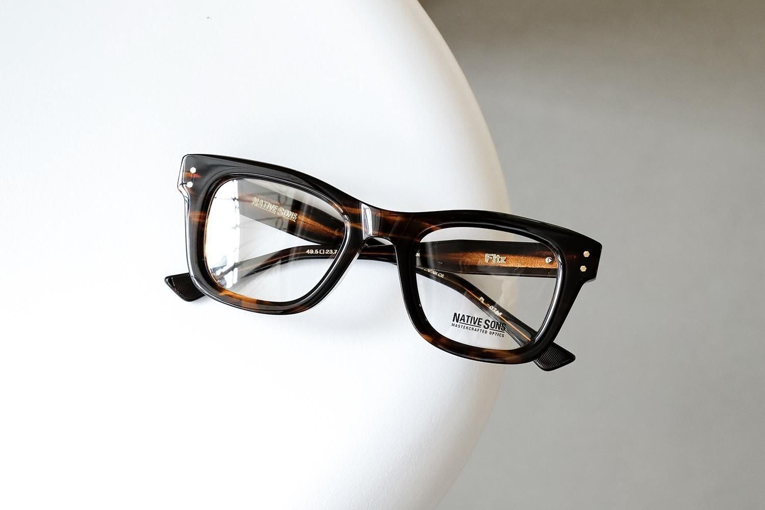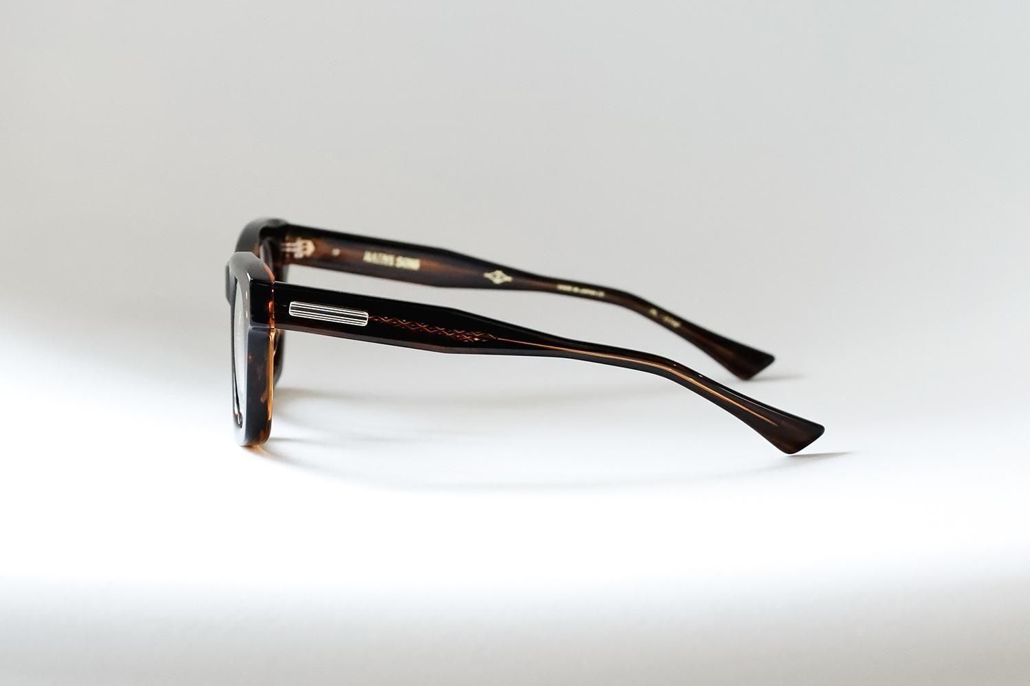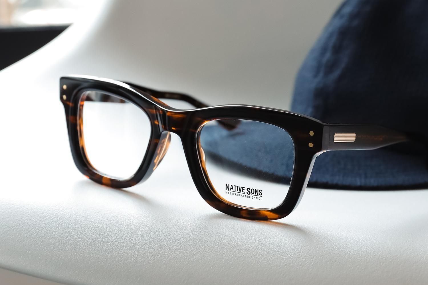 テンプルの金属プレートは光の角度で表情が浮かび、どこか工業的で無骨なムードを添えます。