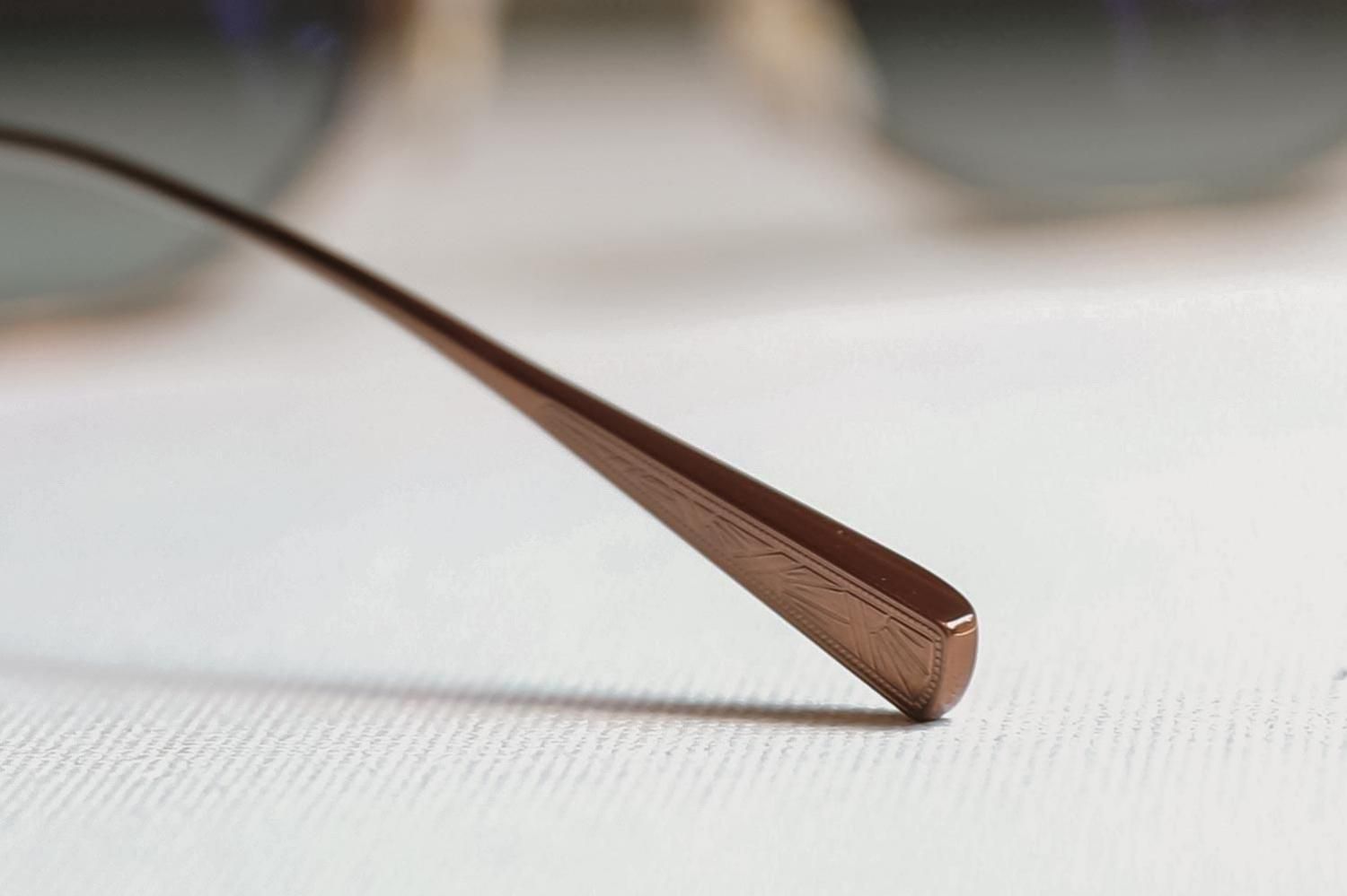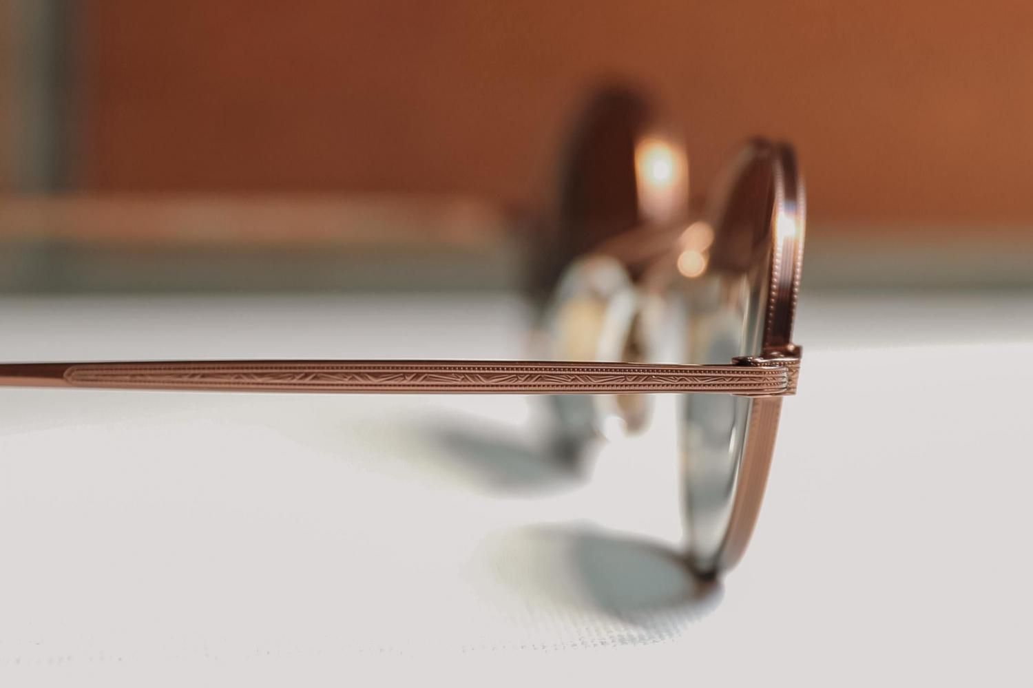 また、職人の手彫りによって丁番の内部まで施された彫金装飾や、繊細な模様が刻まれたチタンテンプルなど、ディテールワークはEYEVANらしいこだわりそのもの。