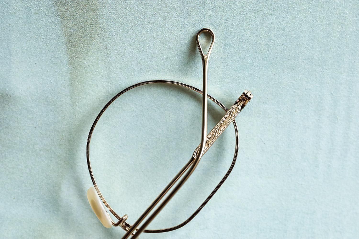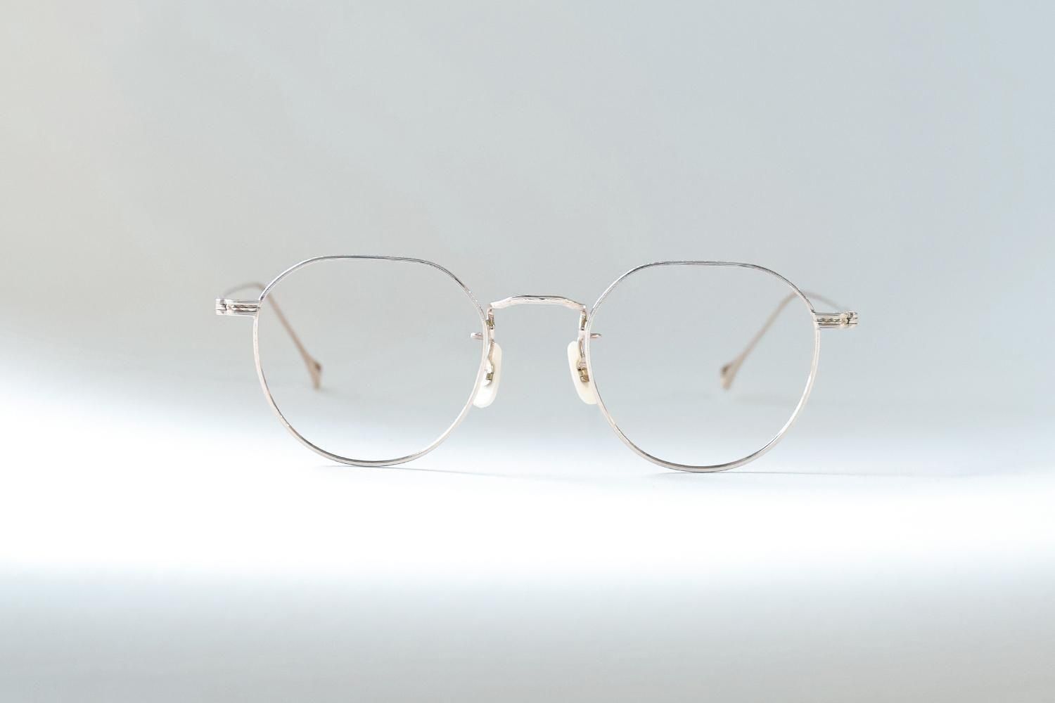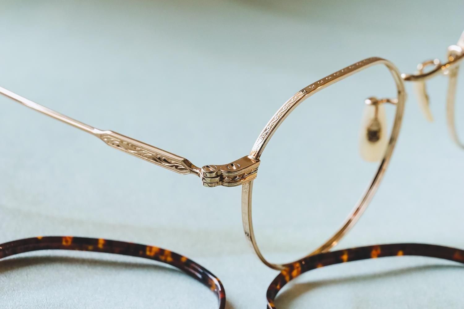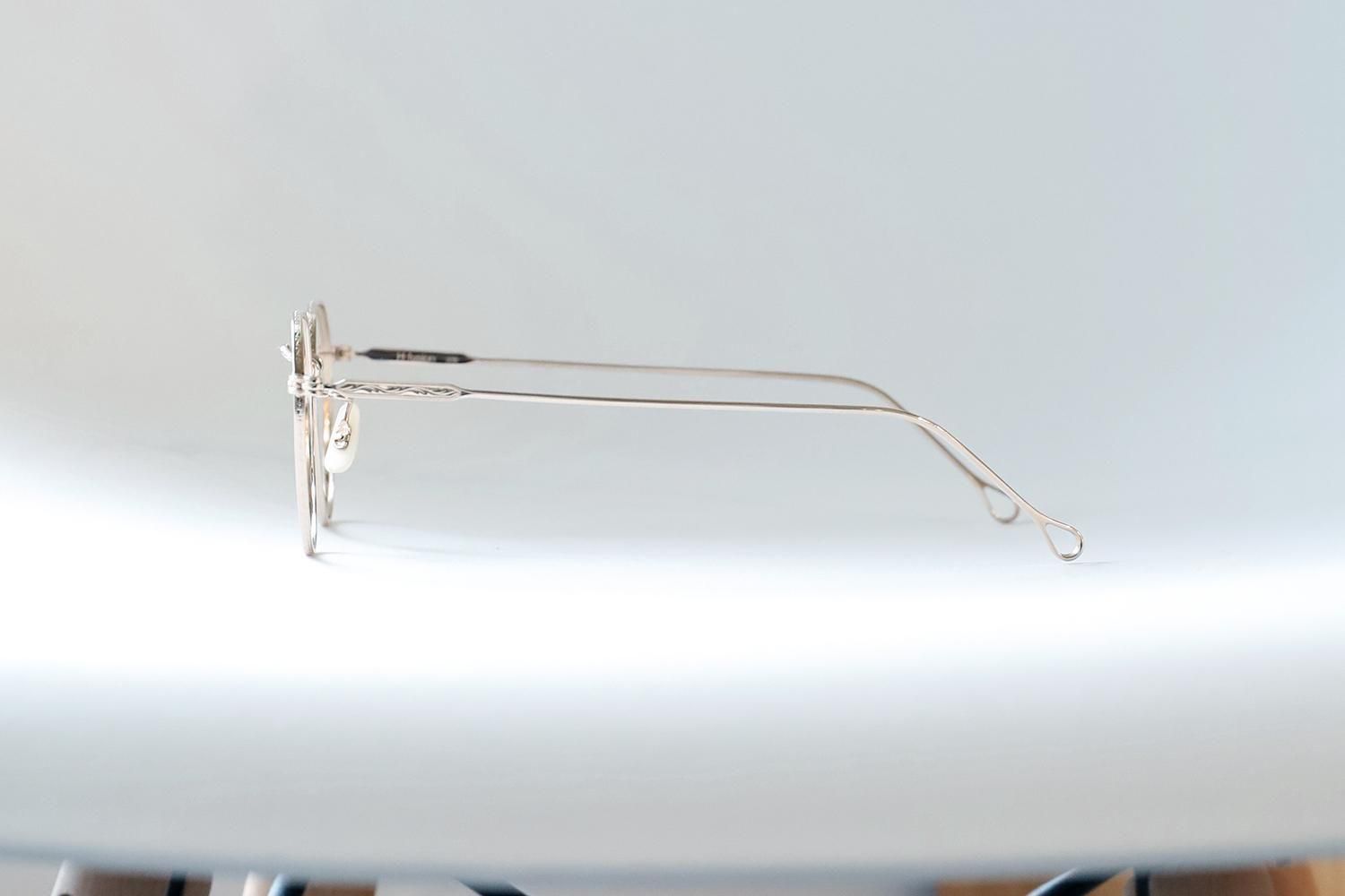 キラリと光る白銀色が特徴で、ブリッジやテンプルには美しい彫金が施されている。