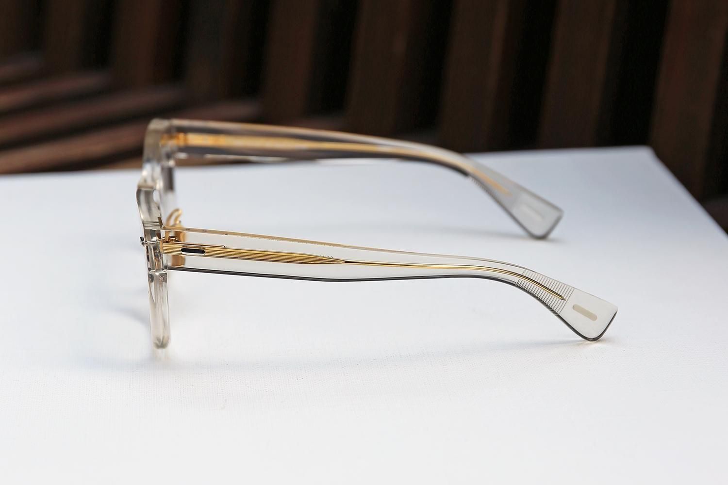 クラシックなウェイファーラーシェイプをベースに、重厚なフレームのフロントからテンプルエンドにかけて、職人の手作業による「後削り」でシャープなラインを表現。