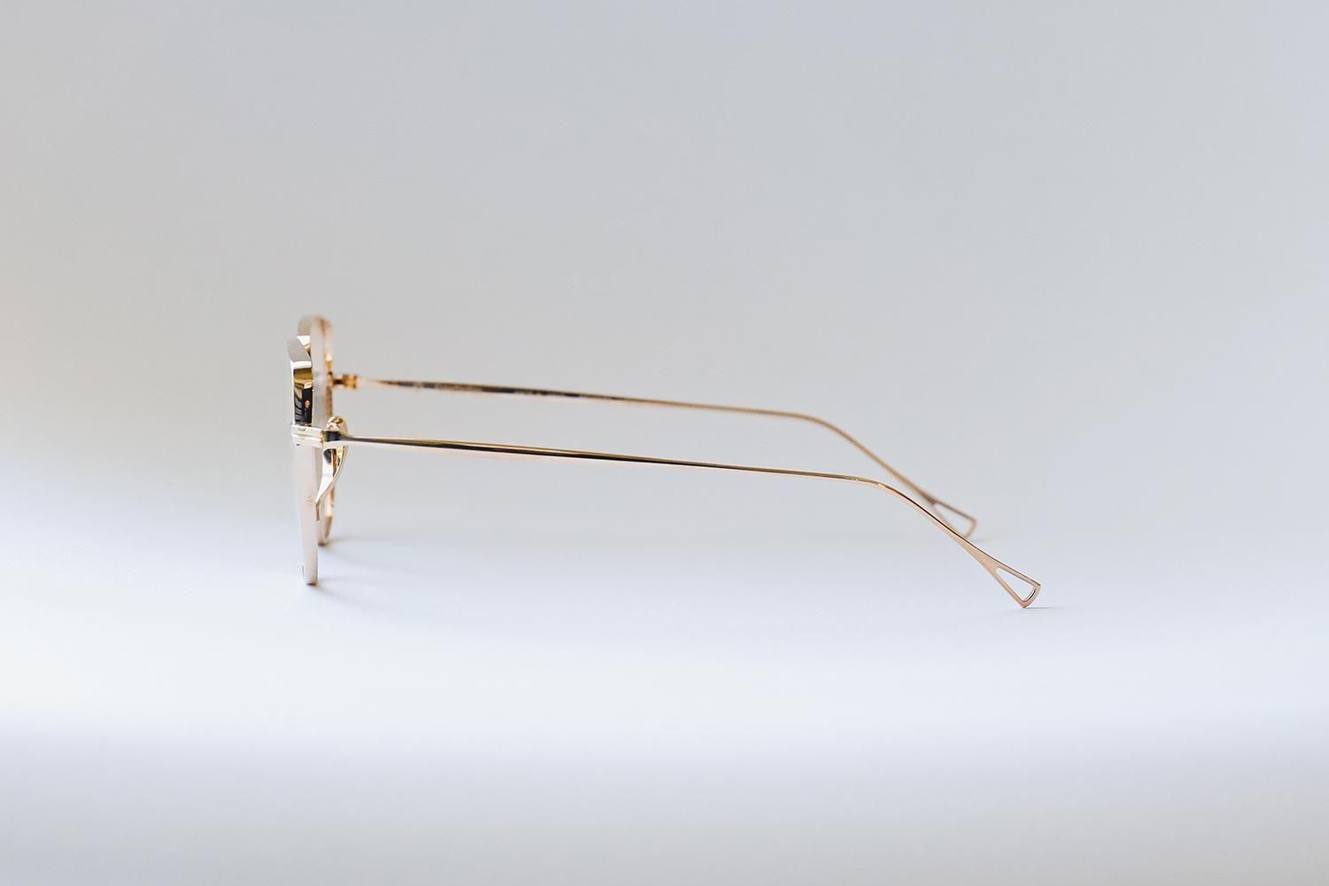テンプルエンドにはブランドのアイコンであるカメの甲羅のマークが施されており、細部にまでこだわりが感じられます。鼻パッド部分も特徴的で、レンズの下側から伸びるユニークな設計が、見た目の美しさと快適な掛け心地を両立しています。