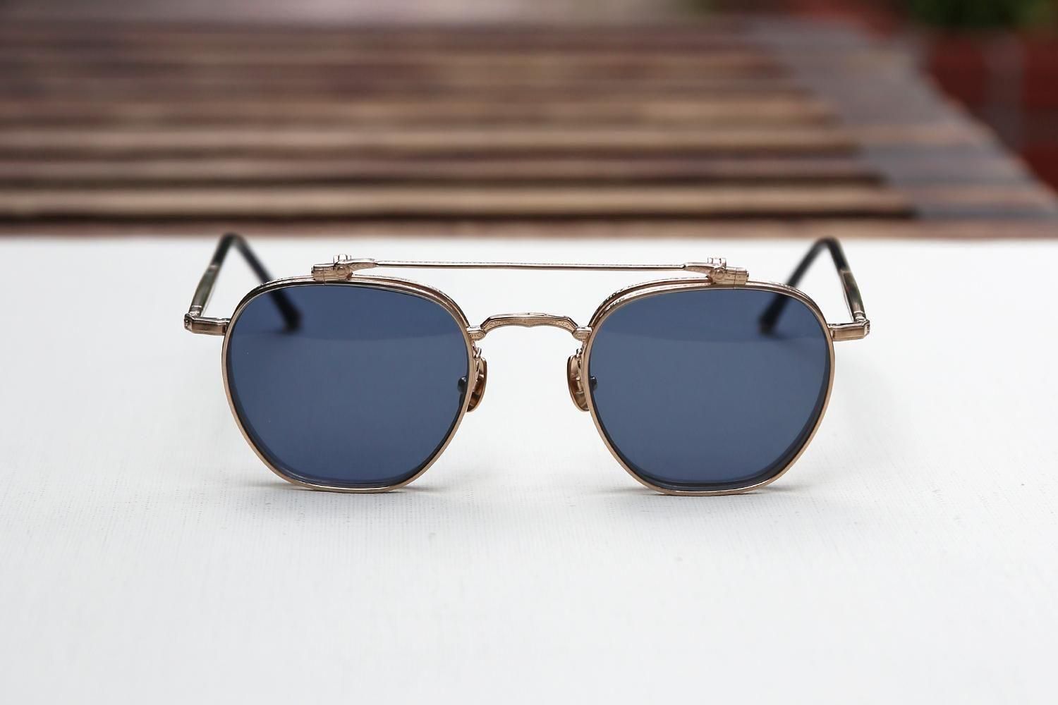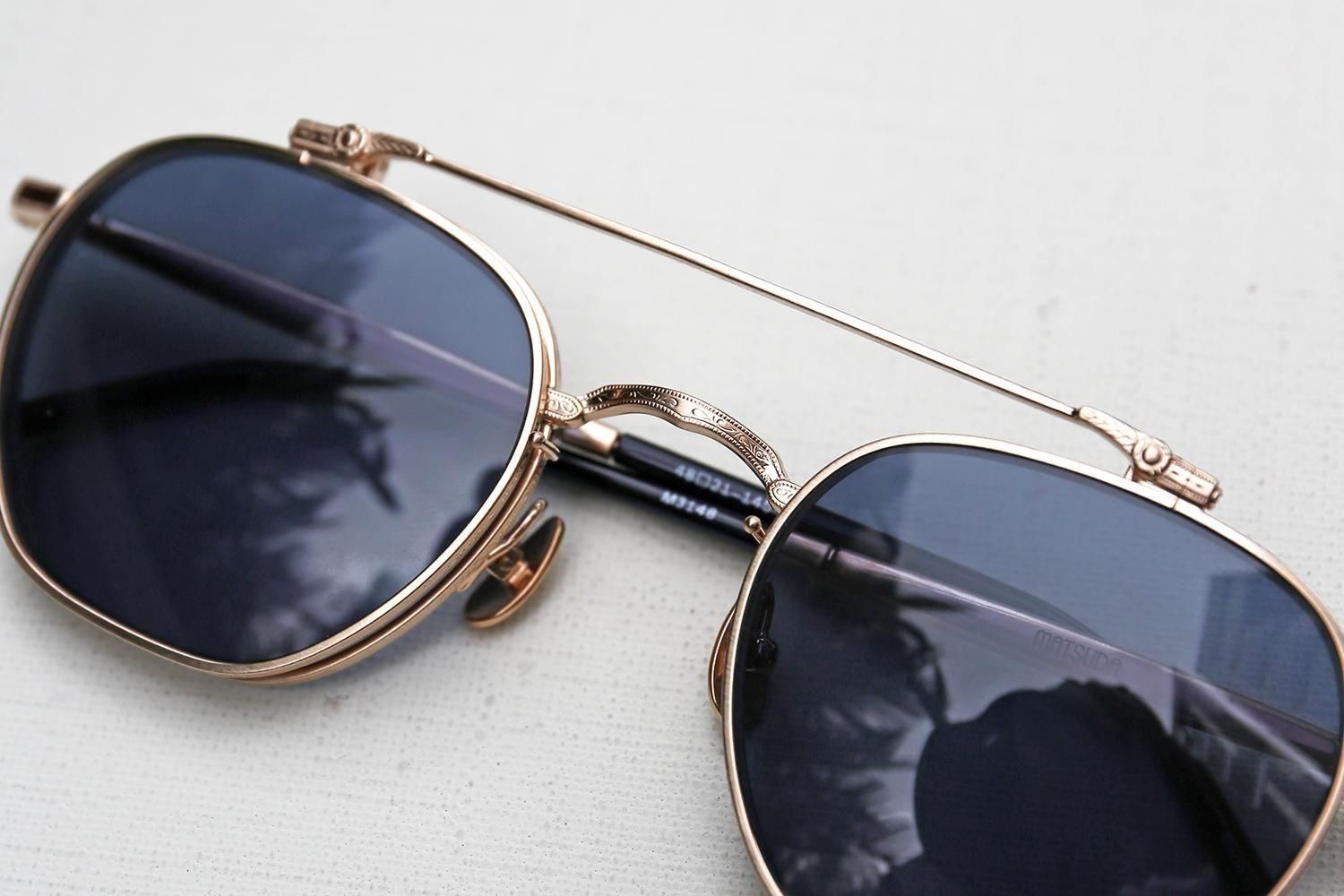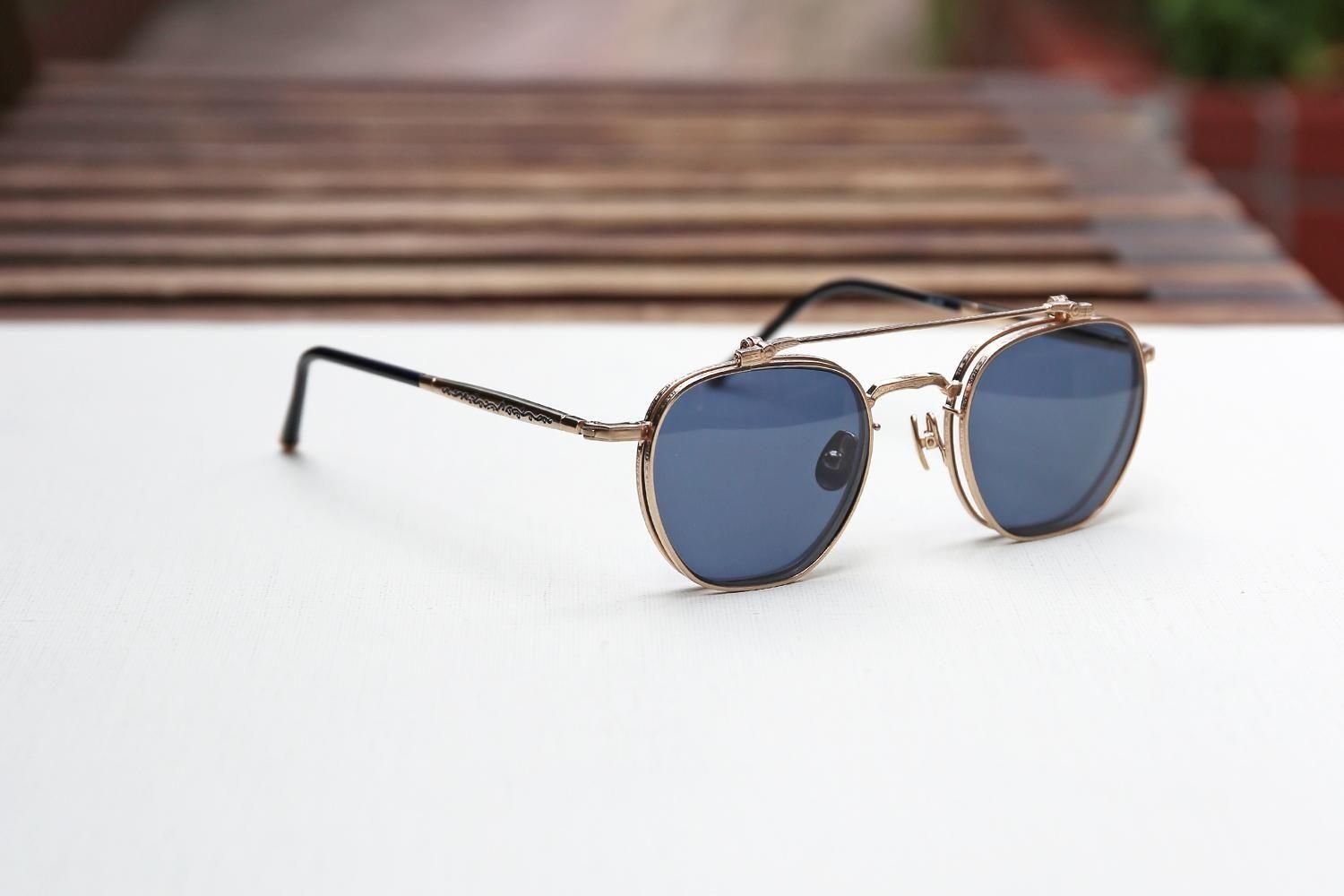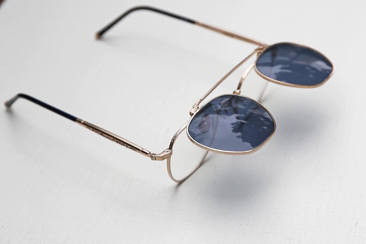 グリーンのレンズを搭載したクリップオンは、下げた状態を一見するとツーブリッジのサングラス。